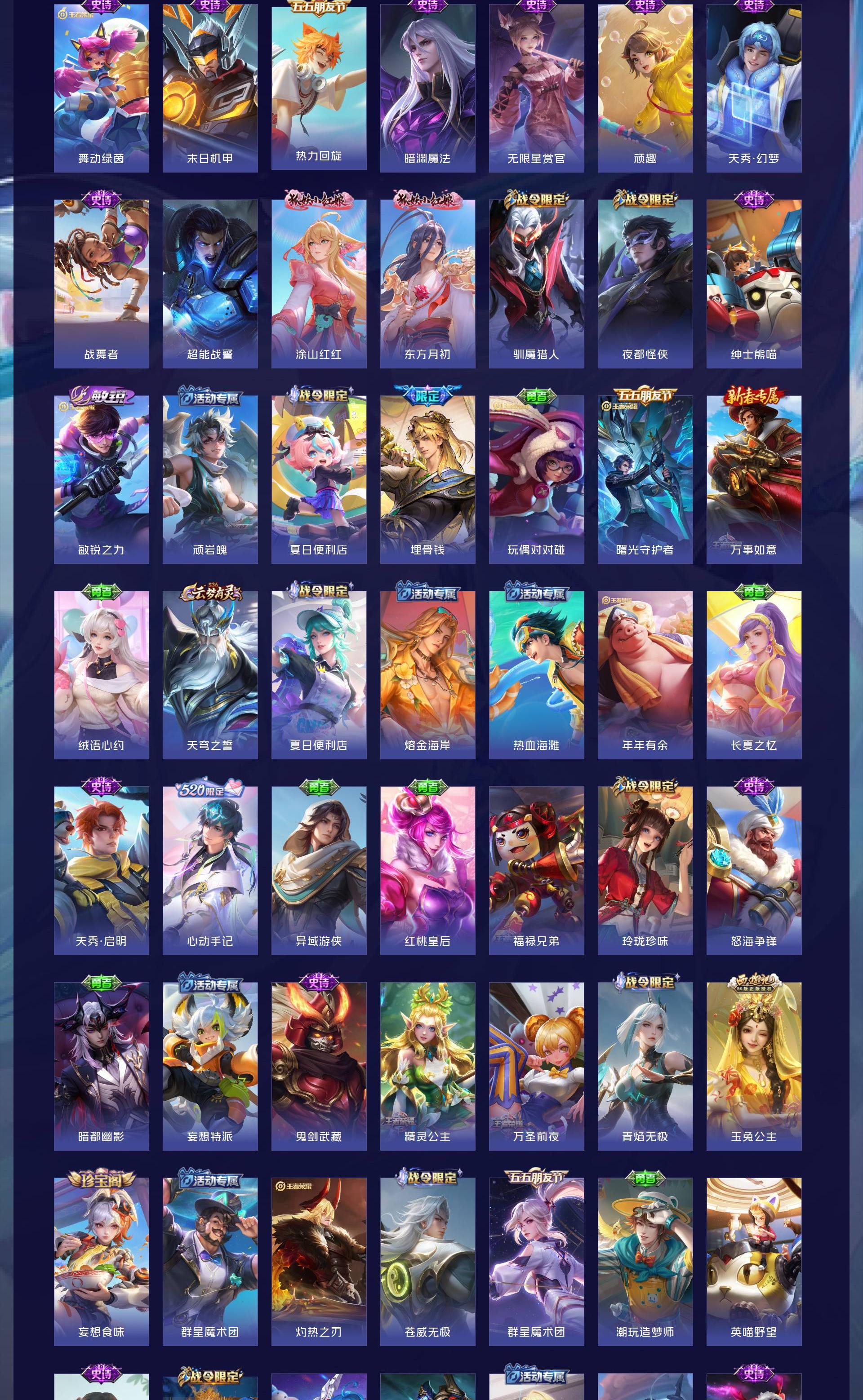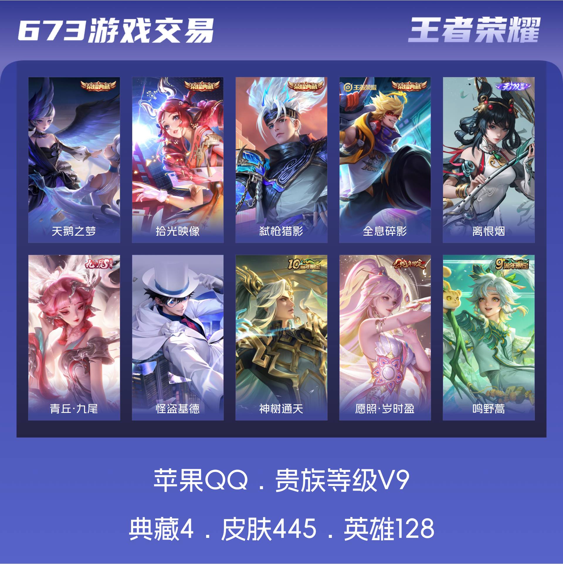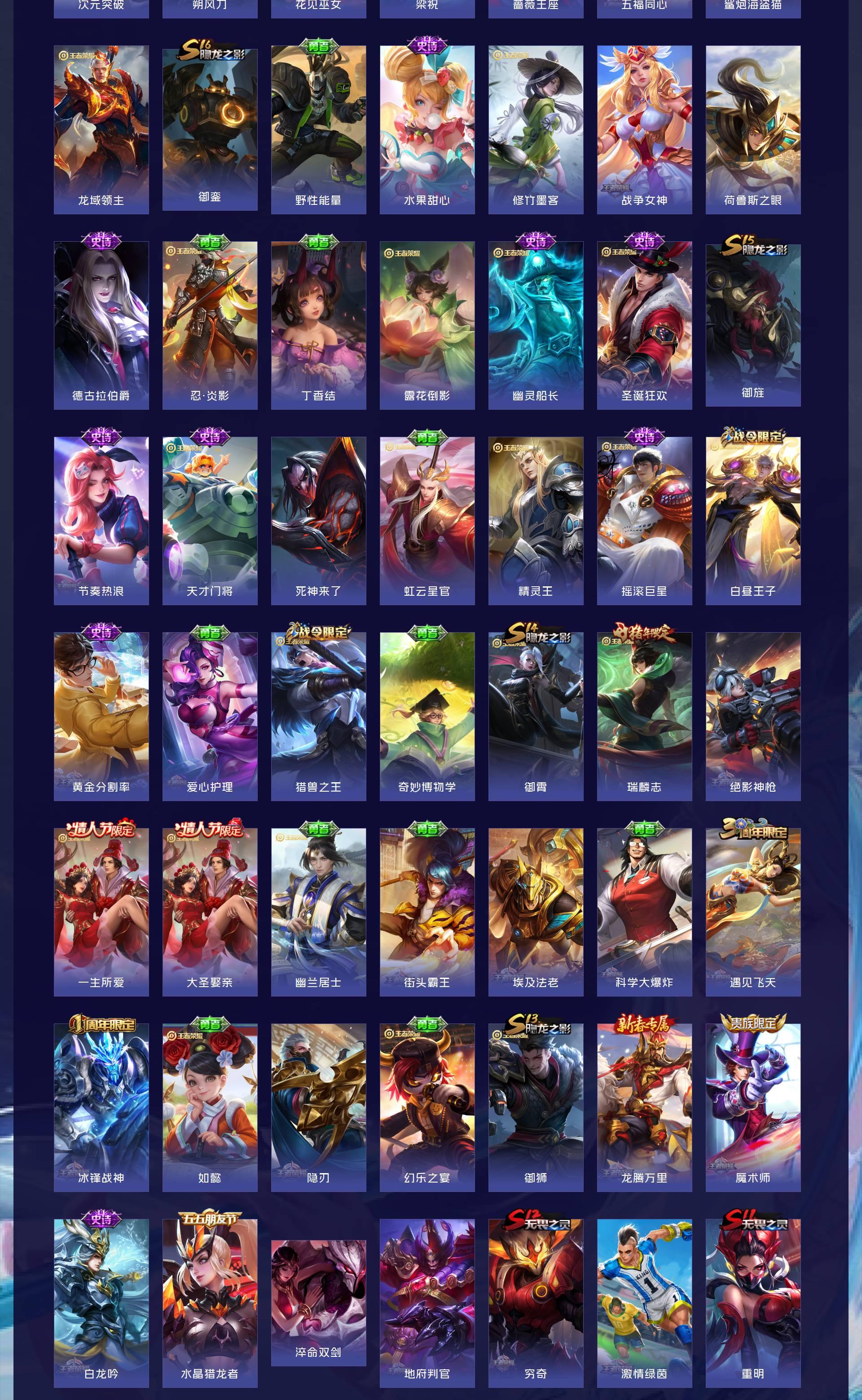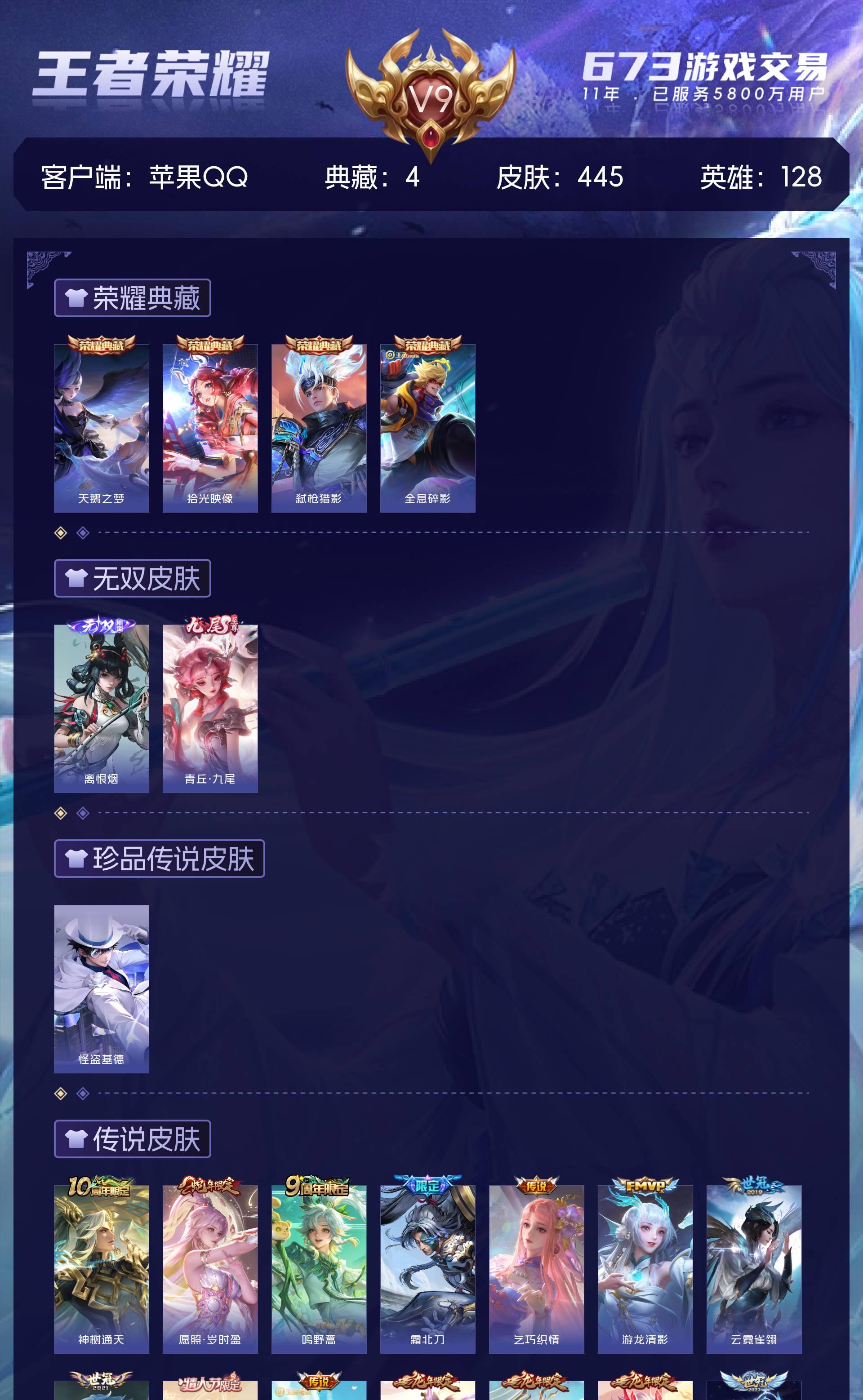V9 皮肤445 英雄128 至尊星耀 荣耀典藏4 无双皮肤2 珍品传说1 传说31 其他皮肤411