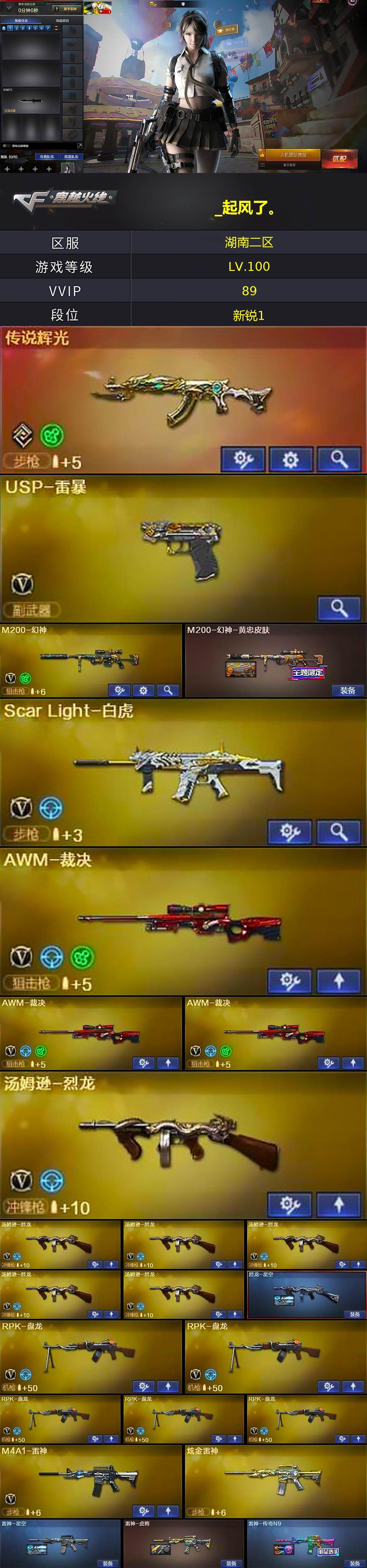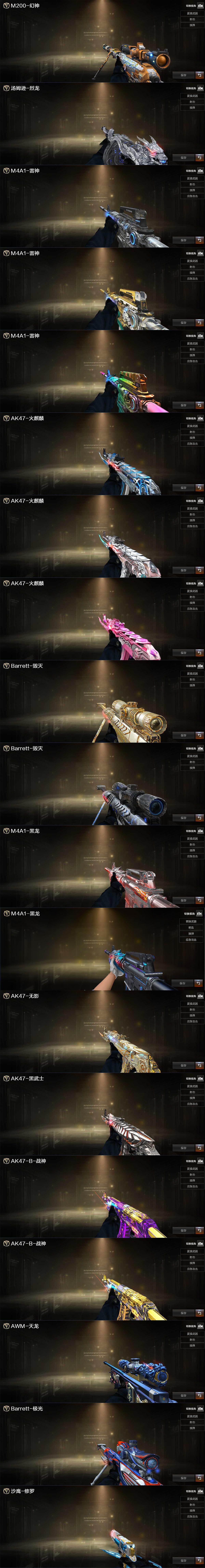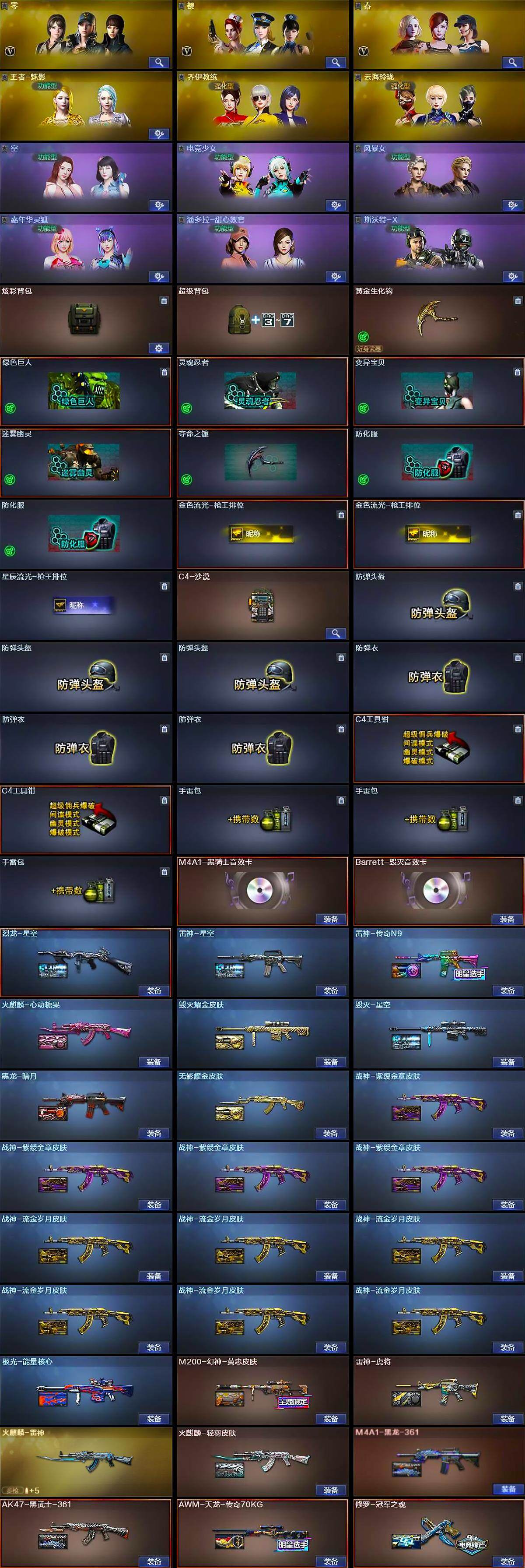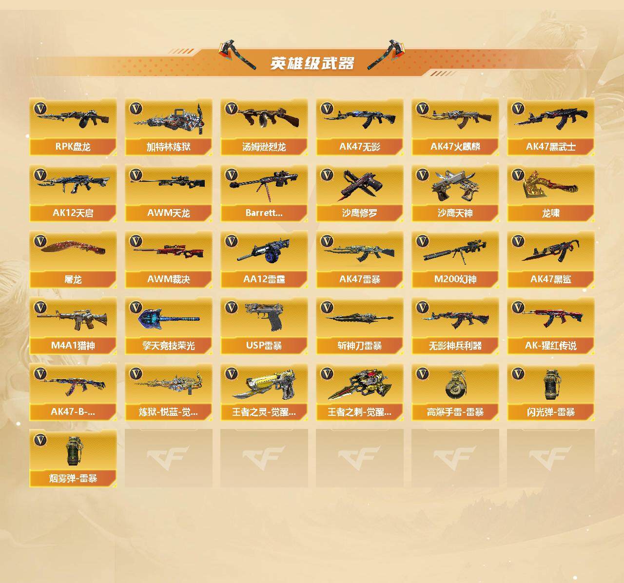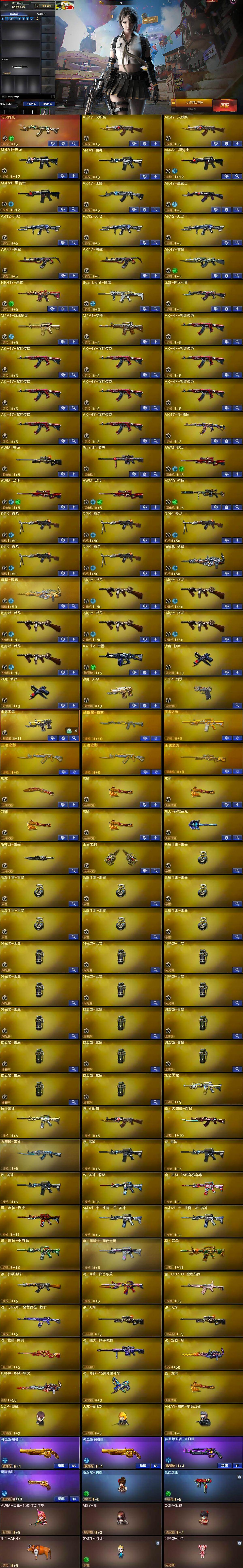 【热门武器】:传说辉光,Scar Light-白虎,HK417-朱雀,M200-幻神,死亡之眼,牛牛-AK47,M4A1-黑骑士*2,汤姆逊-烈龙*6,RPK-盘龙*5,加特林-炼狱,斯泰尔-蝴蝶,羊驼玩偶,COP-白鲨,USP-雷暴,沙鹰-修罗*2