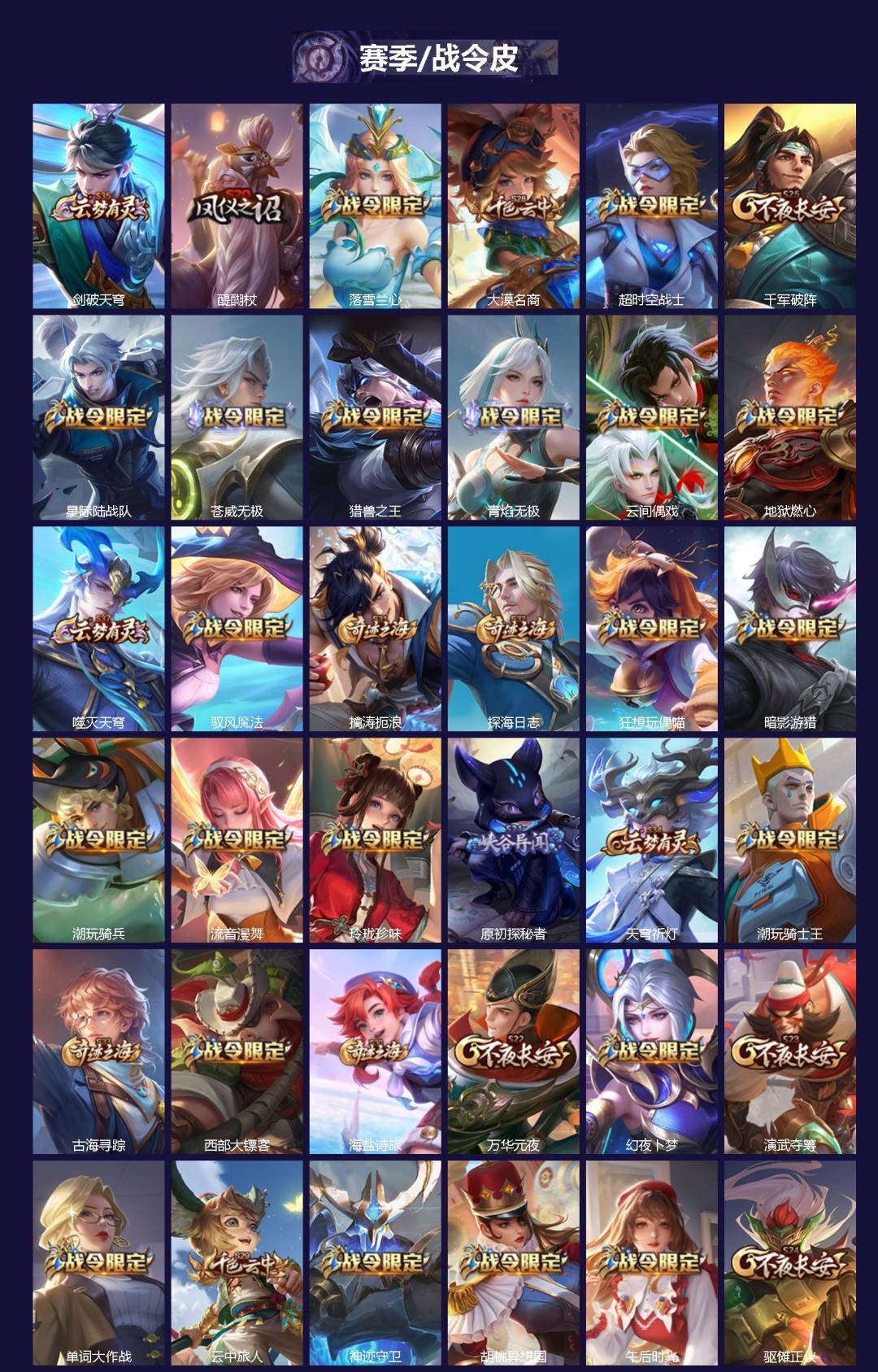 【传说皮】乘龙·问璇玑(孙尚香年限),乘龙·淬吴钩(孙策年限),貂蝉曦玄引,吕布曦玄引,典韦战鼓燎原,黄金天蝎座,幻光神枪,神树通天,仲夏夜之梦(大飞蛾),一念神魔,久胜战神,云鹰飞将(小将军)