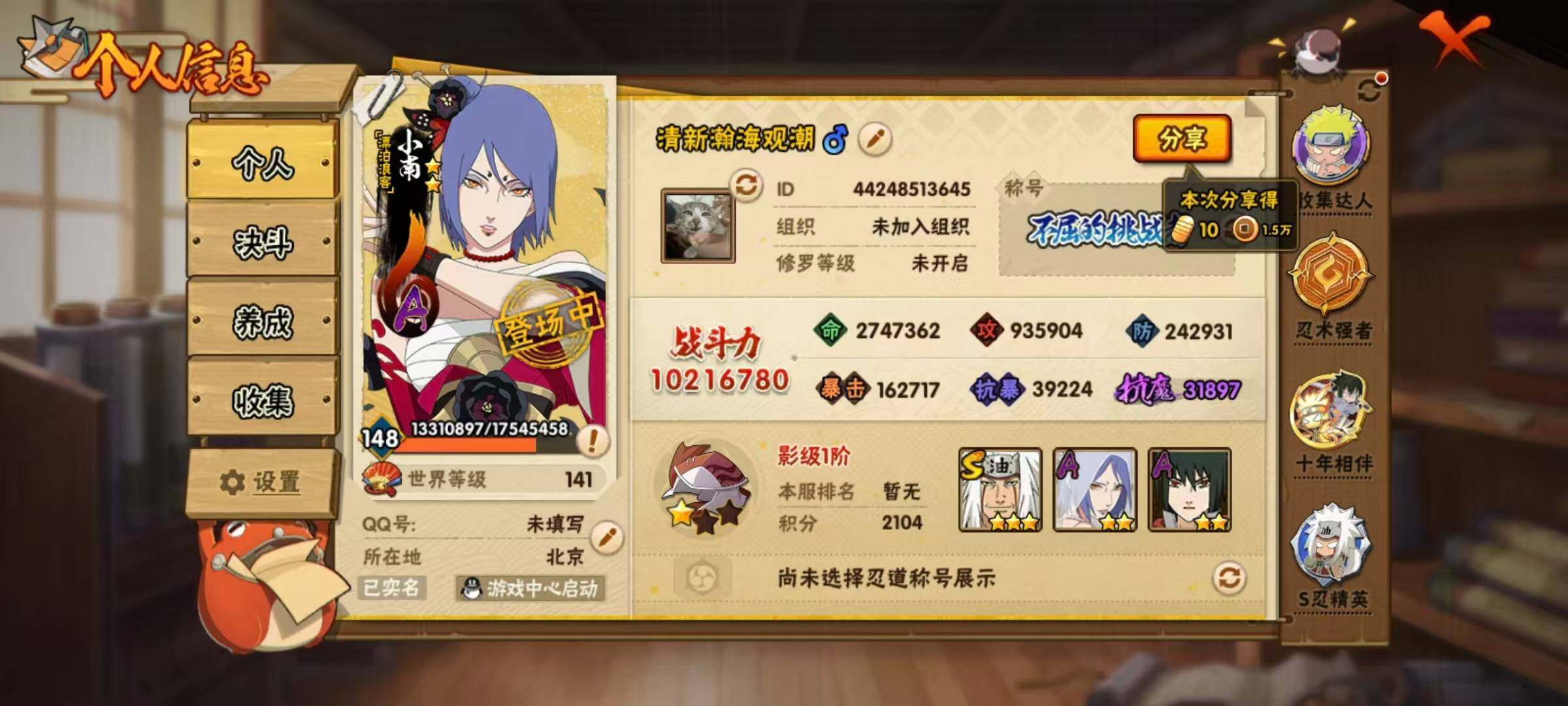[17161689] VIP11,1021W战力,S忍19个,A忍34个