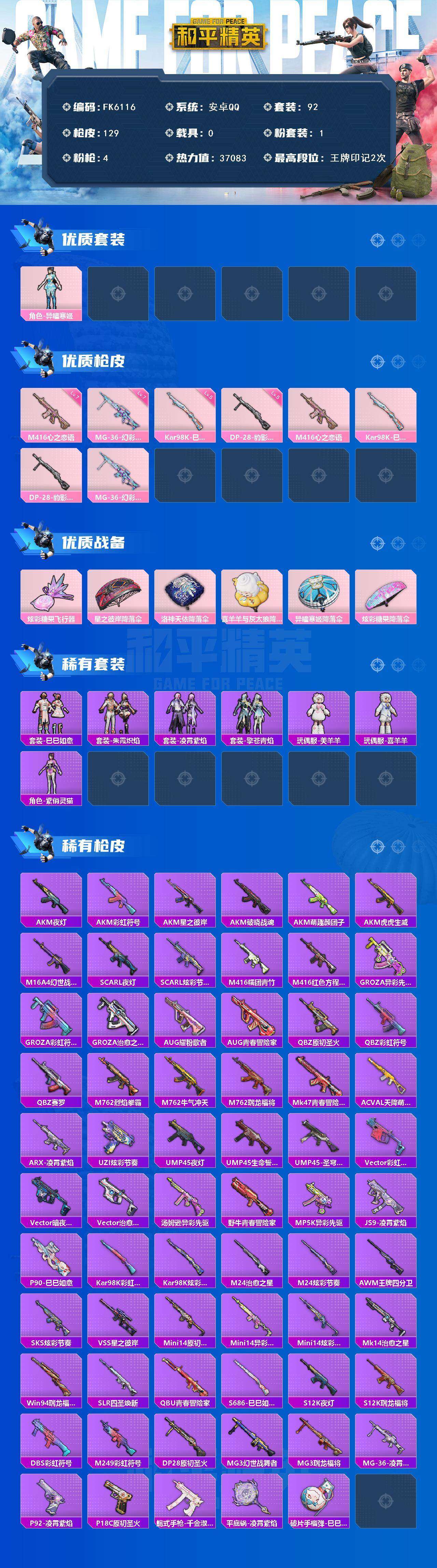 HX8804【身法素材号-4把满级特效枪1粉装-7级M416-心之恋语-7级MG-36-幻彩电音-地铁48点满天赋-异瞳寒姬-92套装127枪皮37083热力值-迅捷狂鲨-角色-紫俏灵猫】可二次 安卓Q-1粉装4特效枪6热门92套装127枪皮 37083热力值 2印记 历史卓越王牌5星 【1粉装】 异瞳寒姬 【4特效枪】 M416-心之恋语 (7级) Kar98K-巳巳如意 (5级) MG-36-