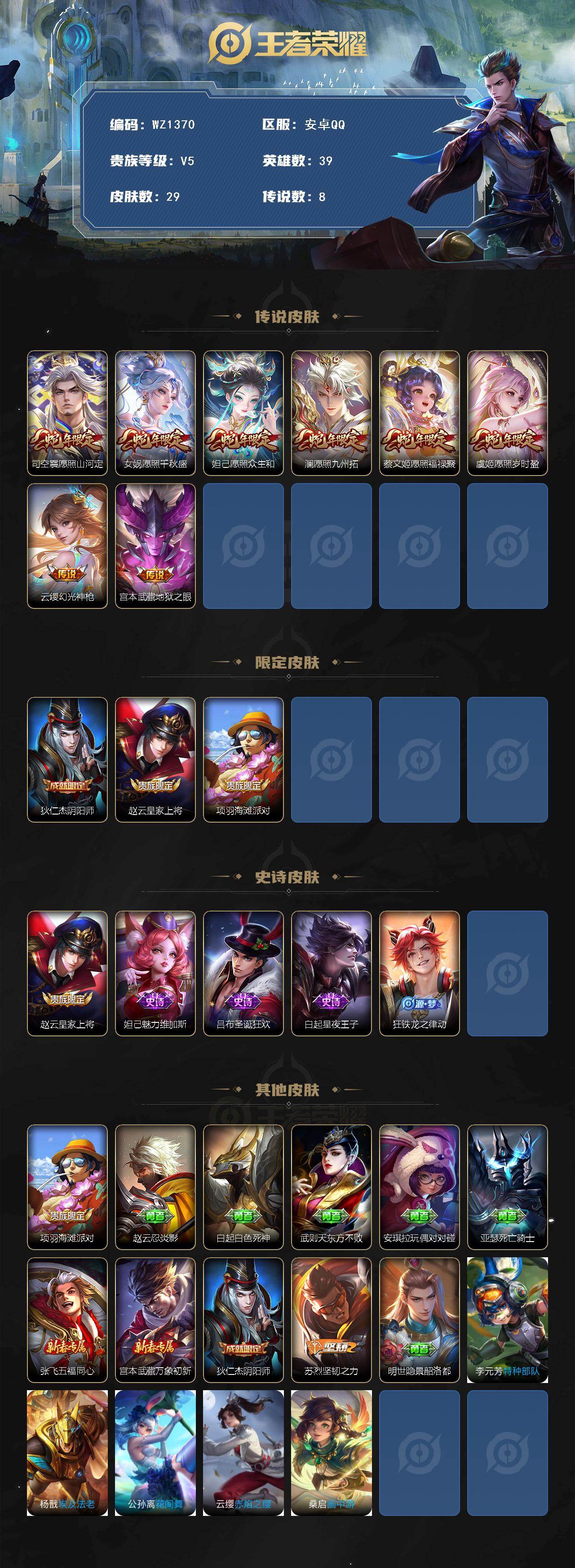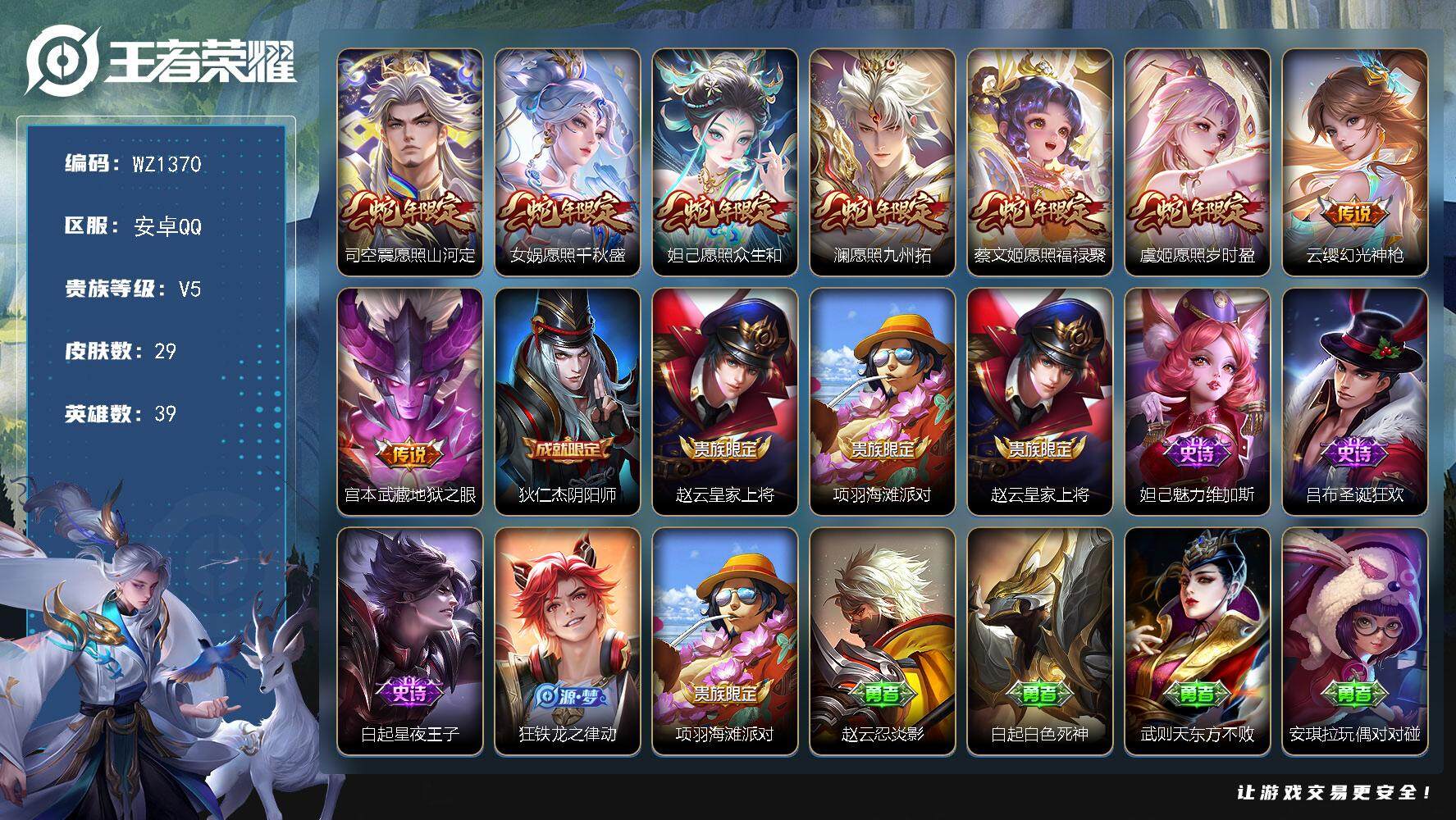 【秒换绑】安卓Q-V5-最强王者段位-39英雄-29皮肤-8传说-5史诗【传