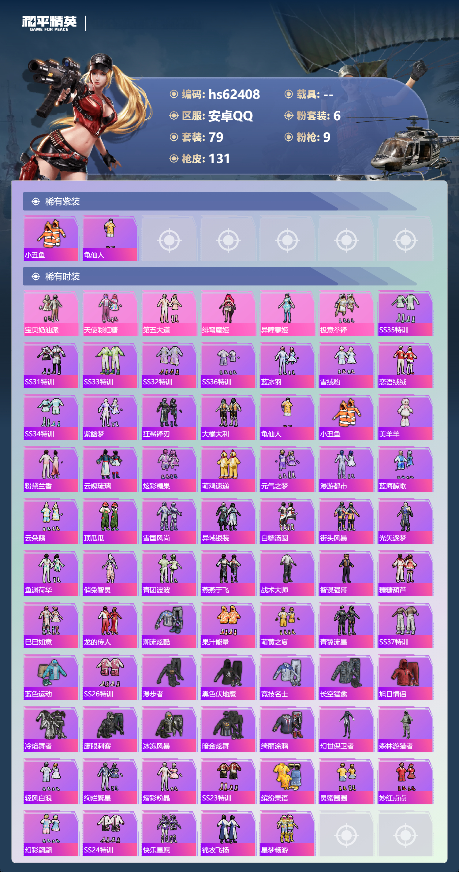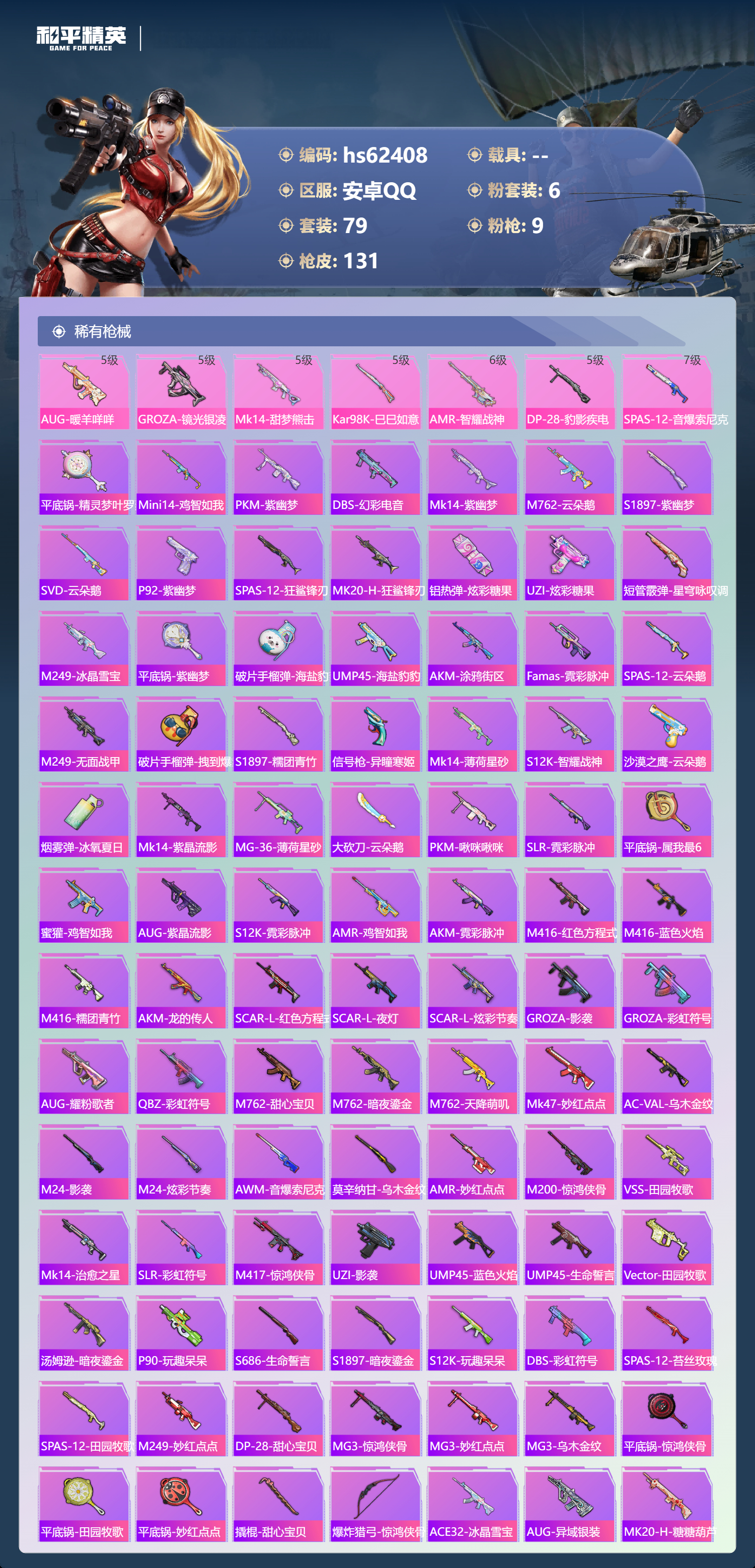 hs62408 安卓手Q-0王牌印记-6粉装-9特效枪-38765热力值-79套装-131枪皮