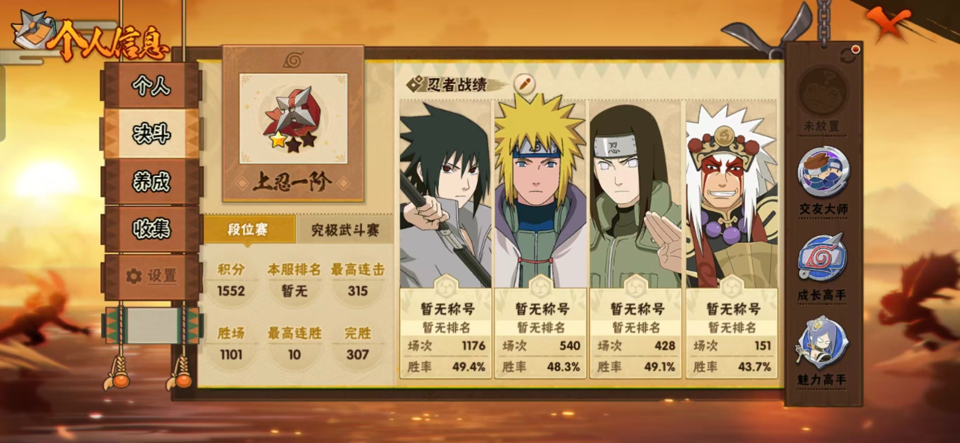 【S级忍者】宇智波斑「秽土转生·解」,自来也 「舞之豪杰」,旗木卡卡西「须佐能乎」,自来也 「传说中的三忍」,波风水门「九喇嘛连结」,漩涡鸣人·宇智波佐助,宇智波鼬 「须佐能乎」,佩恩「天道」,波风水门