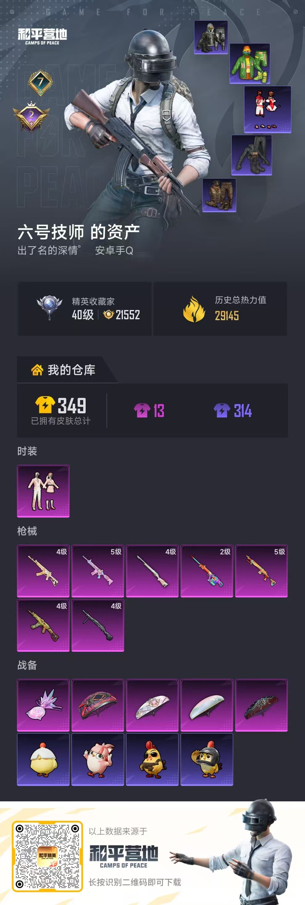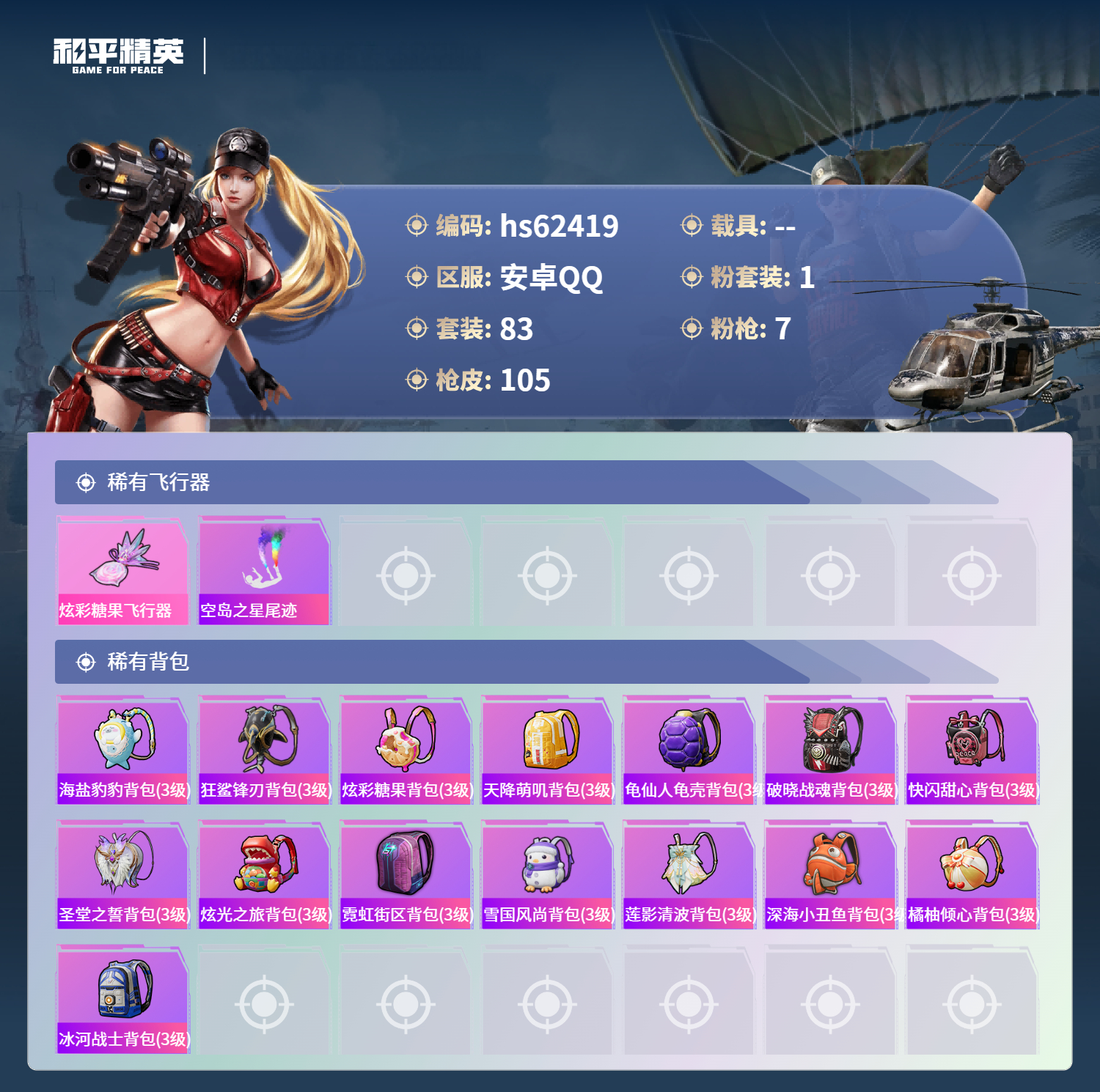 hs62419 安卓手Q-7王牌印记-1粉装-7特效枪-29145热力值-83套装-105枪皮-2卓越印记