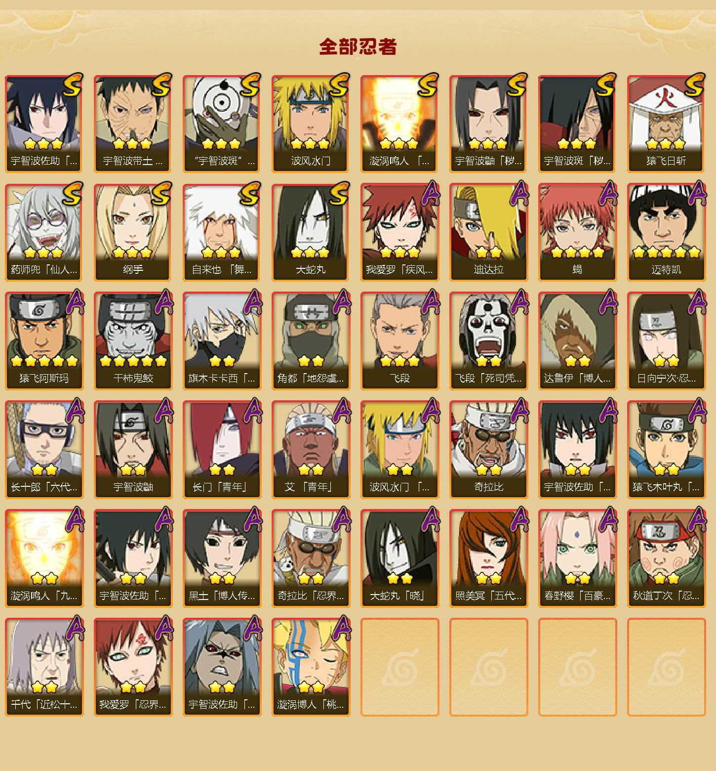 【S级忍者】:宇智波鼬「秽土转生」(3星),宇智波斑「秽土转生」(3星),宇智波带土「忍界大战」(3星),自来也「舞之豪杰」(3星),大蛇丸(3星),纲手(3星),猿飞日斩(3星),波风水门(3星),药师兜「仙人模式」(3星),漩涡鸣人「九喇嘛连结」(3星),宇智波佐助「永恒万花筒」(3星),宇智波斑 「白面具」(3星宇智波斑「白面具」)
