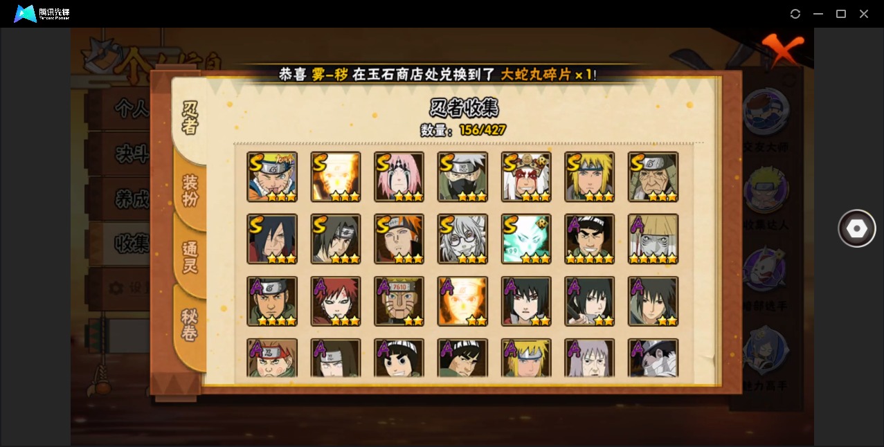 【S级忍者】宇智波斑「秽土转生·解」,春野樱 「忍界大战」,漩涡鸣人 「九喇嘛连结」,自来也 「舞之豪杰」,旗木卡卡西「须佐能乎」,大筒木舍人 「最终章」,漩涡鸣人·宇智波佐助,药师兜「仙人模式」,猿飞日斩「秽土转生」,宇智波鼬 「须佐能乎」,佩恩「天道」,波风水门