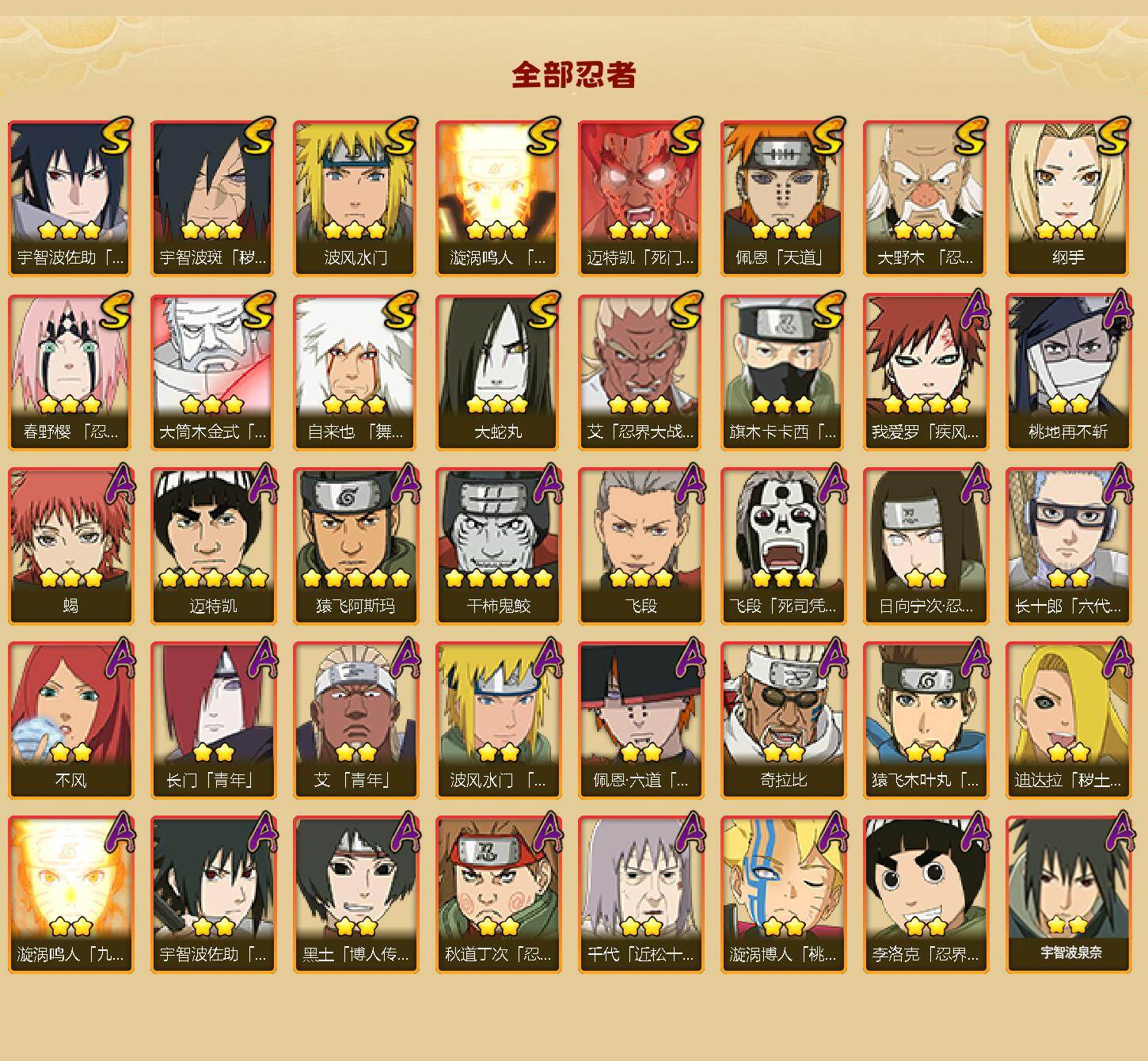 【S级忍者】:宇智波斑「秽土转生·解」(3星),大野木「忍界大战」(3星),春野樱「忍界大战」(3星),艾「忍界大战」(3星),旗木卡卡西「须佐能乎」(3星),自来也「舞之豪杰」(3星),大蛇丸(3星),纲手(3星),波风水门(3星),漩涡鸣人「九喇嘛连结」(3星),迈特凯「死门」(3星),佩恩「天道」(3星),宇智波佐助「永恒万花筒」(3星),大筒木金式(3星)