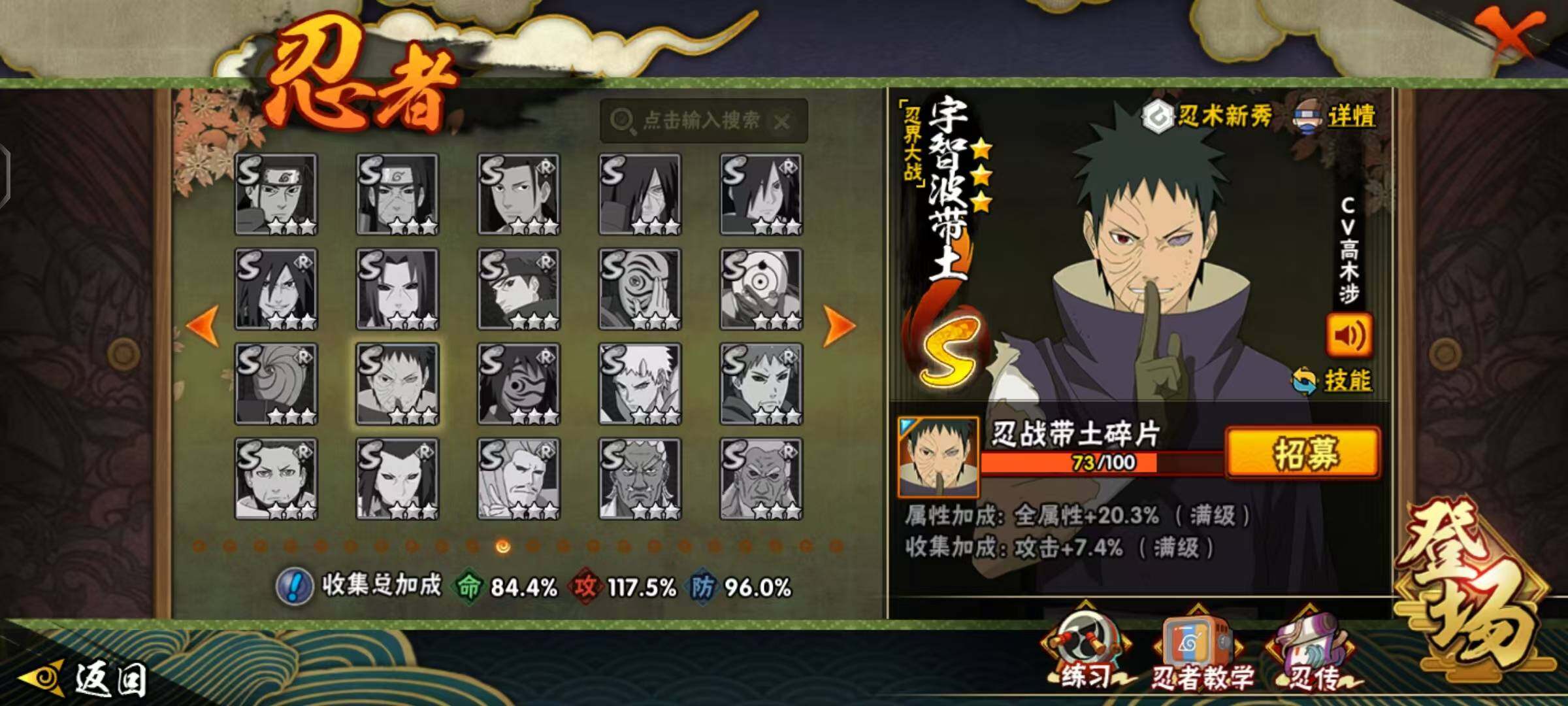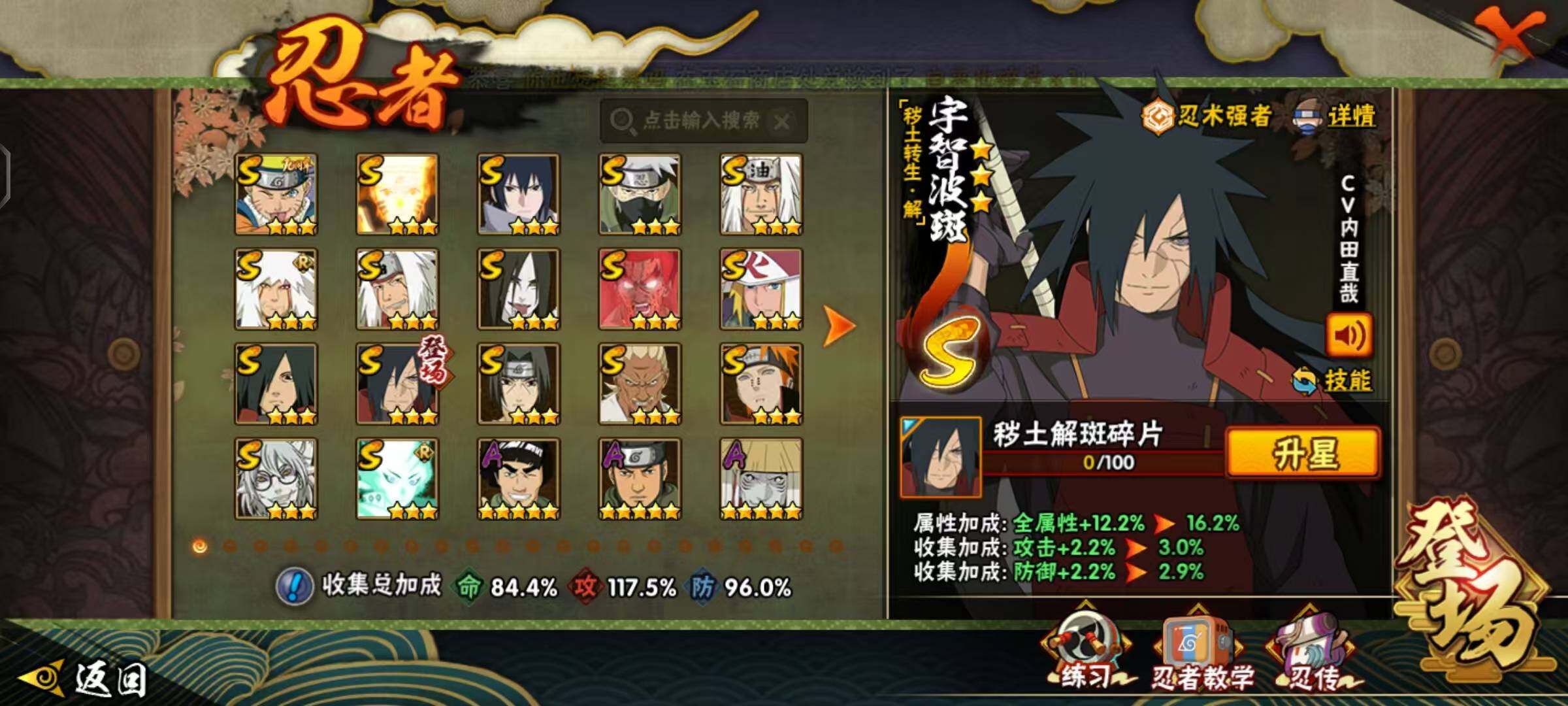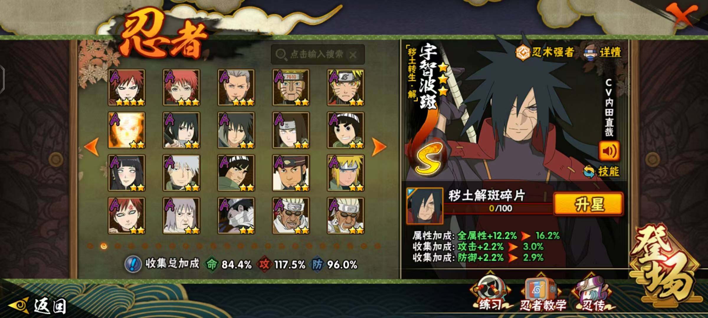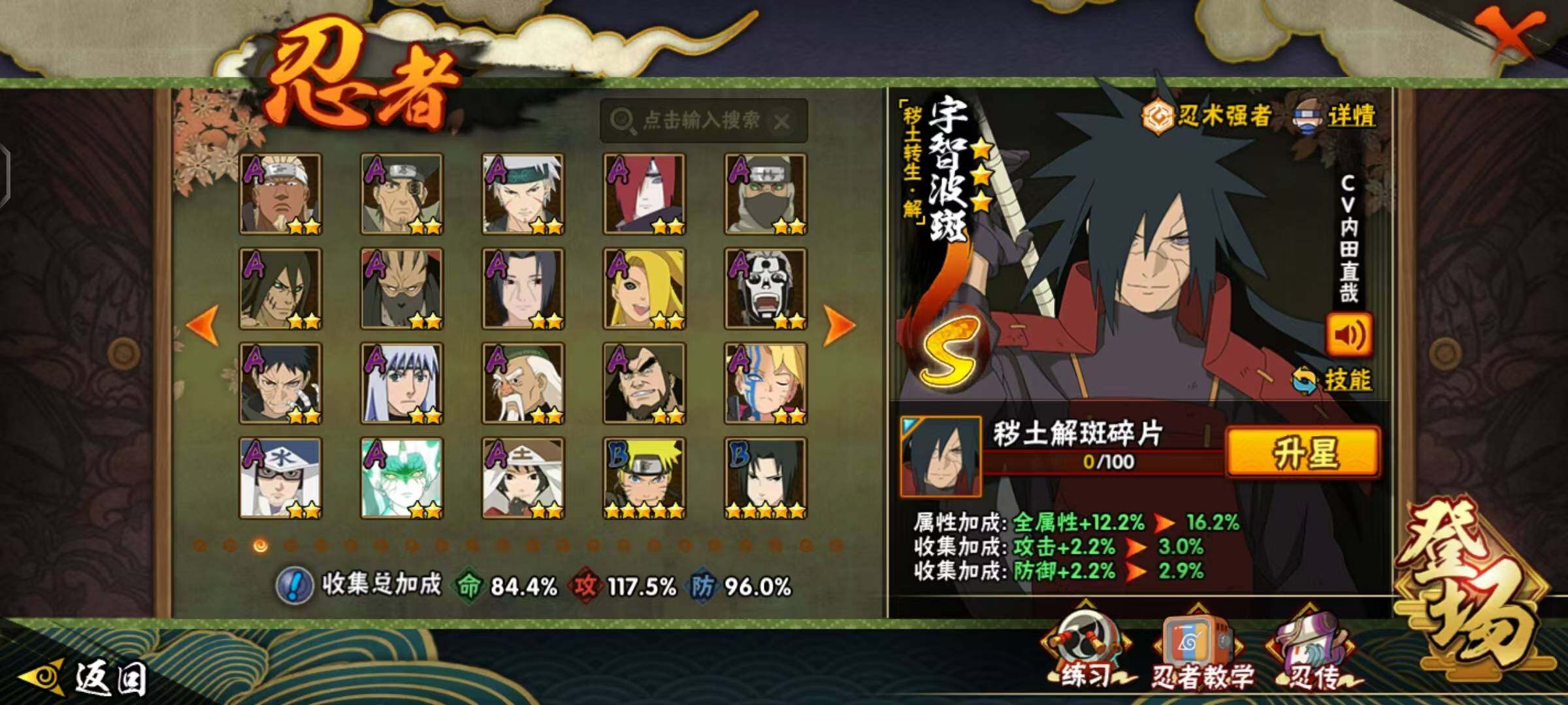 【S级忍者】:宇智波斑「秽土转生·解」(3星),艾「忍界大战」(3星),宇智波鼬「须佐能乎」(3星),旗木卡卡西「须佐能乎」(3星),自来也(3星),自来也「舞之豪杰」(3星),大蛇丸(3星),自来也「传说中的三忍」(3星),宇智波斑(3星),波风水门(3星),药师兜「仙人模式」(3星),漩涡鸣人「九喇嘛连结」(3星),迈特凯「死门」(3星),佩恩「天道」(3星),宇智波佐助「永恒万花筒」(3星),大筒木舍人「最终章」(3星),漩涡鸣人·宇智波佐助(3星)