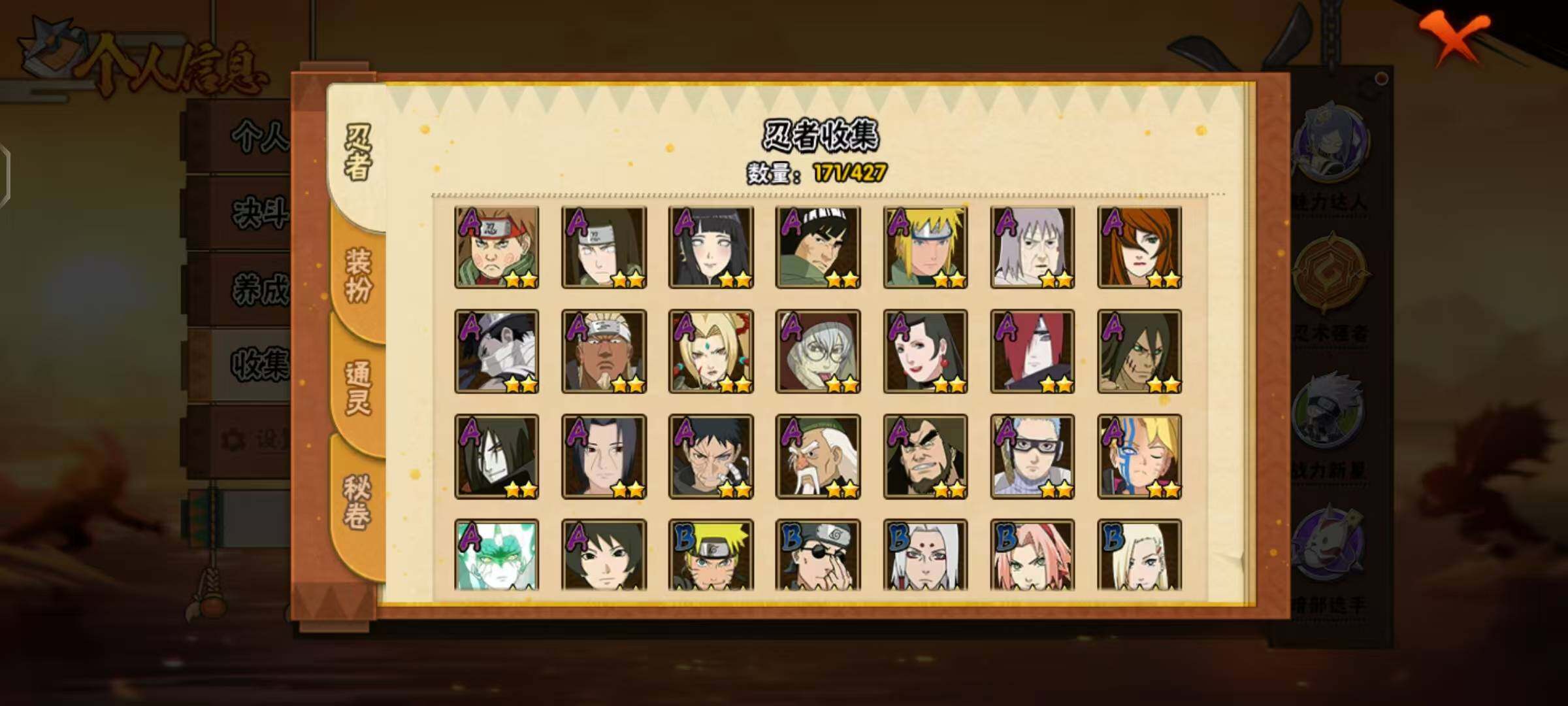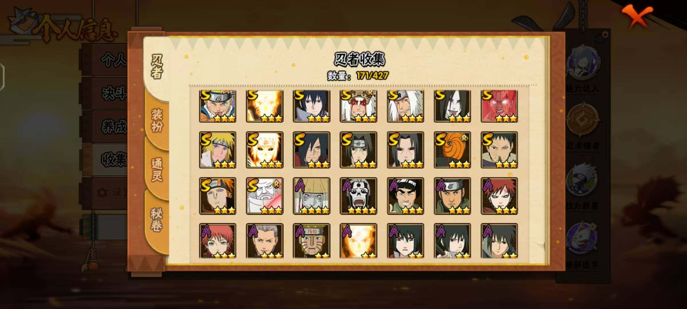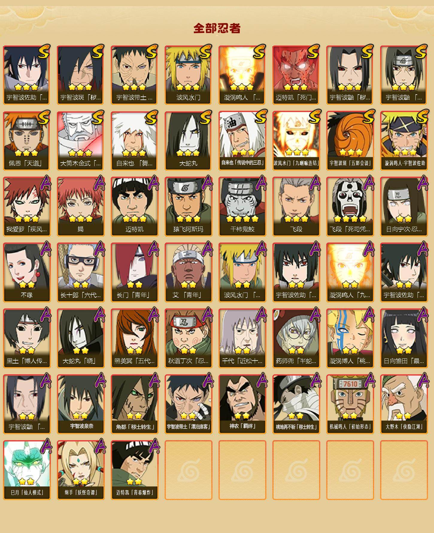 【S级忍者】:宇智波鼬「秽土转生」(3星),宇智波斑「秽土转生·解」(3星),宇智波带土「忍界大战」(3星),宇智波鼬「须佐能乎」(3星),自来也「舞之豪杰」(3星),大蛇丸(3星),自来也「传说中的三忍」(3星),波风水门(3星),漩涡鸣人「九喇嘛连结」(3星),迈特凯「死门」(3星),佩恩「天道」(3星),宇智波佐助「永恒万花筒」(3星),大筒木金式(3星),波风水门「九喇嘛连结」(3星),宇智波斑「五影会谈」(3星),漩涡鸣人·宇智波佐助(3星)