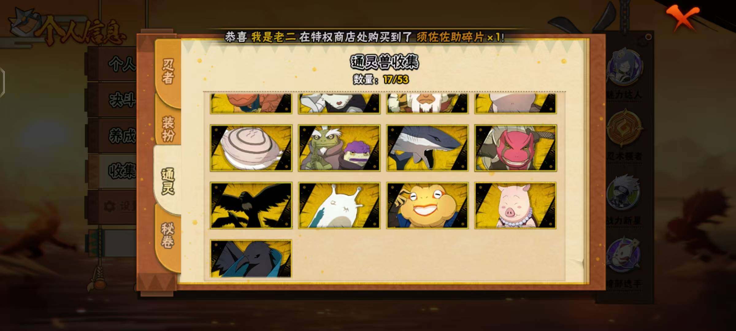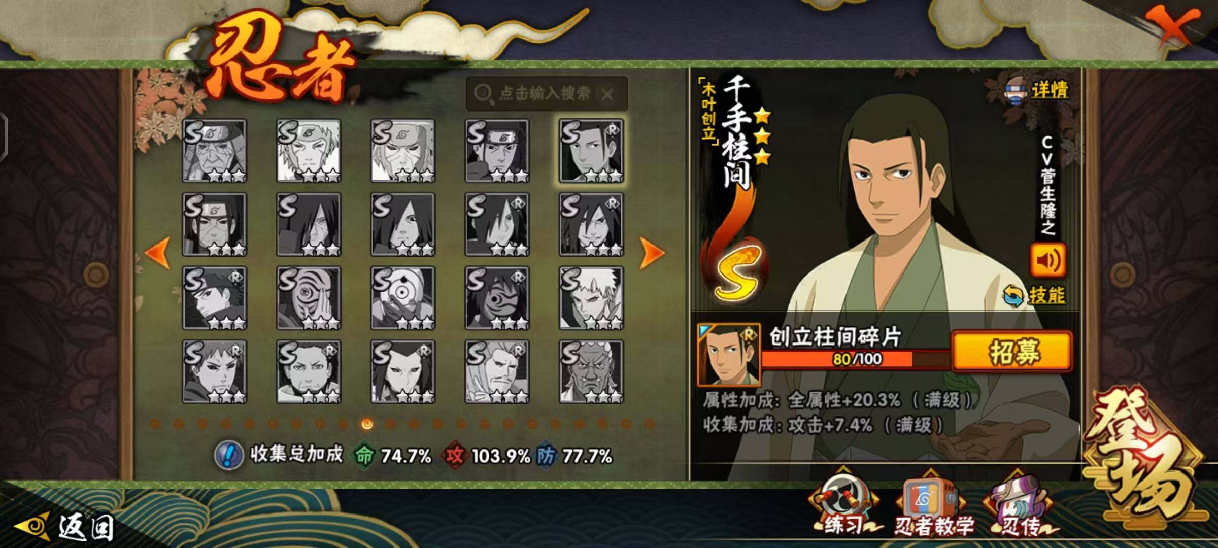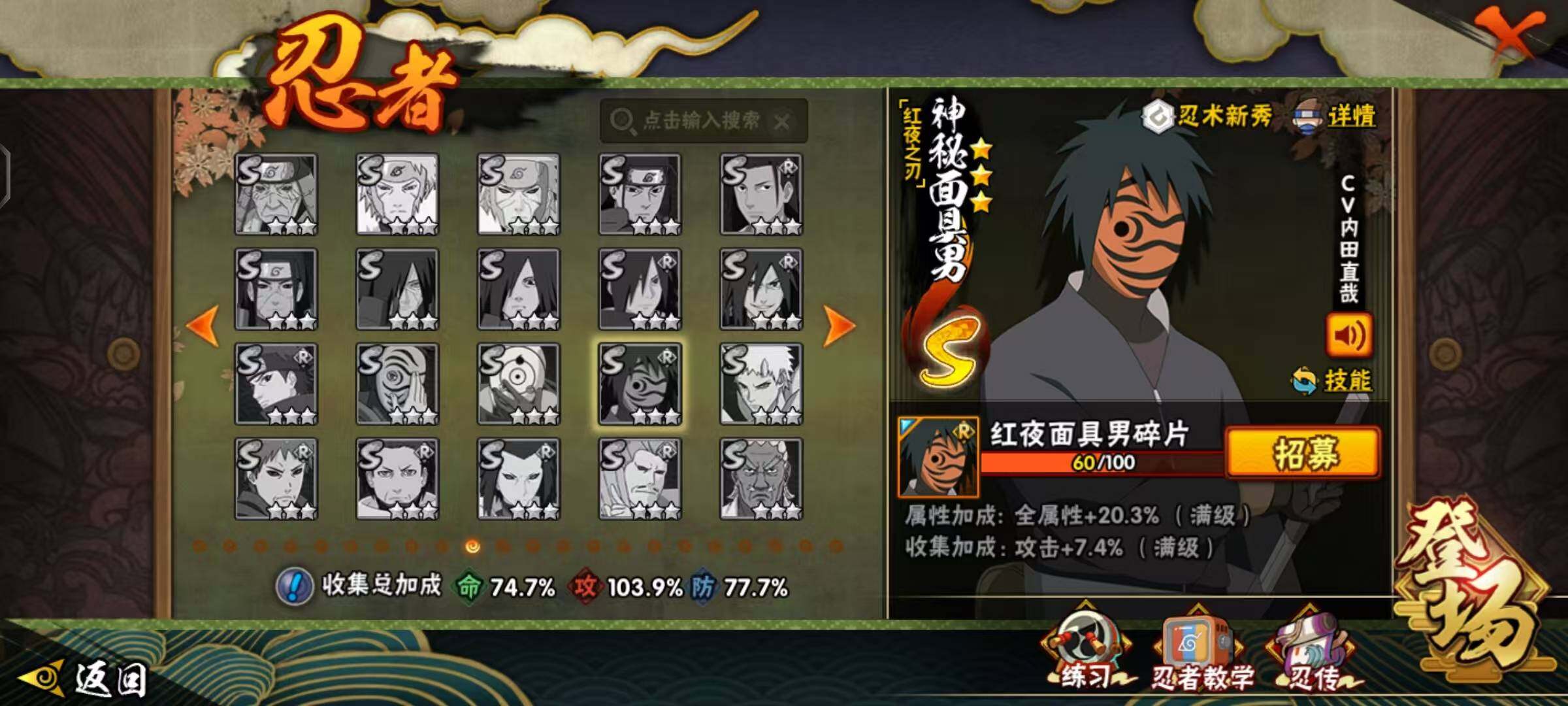 【S级忍者】:宇智波鼬「秽土转生」(3星),宇智波斑「秽土转生·解」(3星),宇智波带土「忍界大战」(3星),宇智波鼬「须佐能乎」(3星),自来也「舞之豪杰」(3星),大蛇丸(3星),自来也「传说中的三忍」(3星),波风水门(3星),漩涡鸣人「九喇嘛连结」(3星),迈特凯「死门」(3星),佩恩「天道」(3星),宇智波佐助「永恒万花筒」(3星),大筒木金式(3星),波风水门「九喇嘛连结」(3星),宇智波斑「五影会谈」(3星),漩涡鸣人·宇智波佐助(3星)