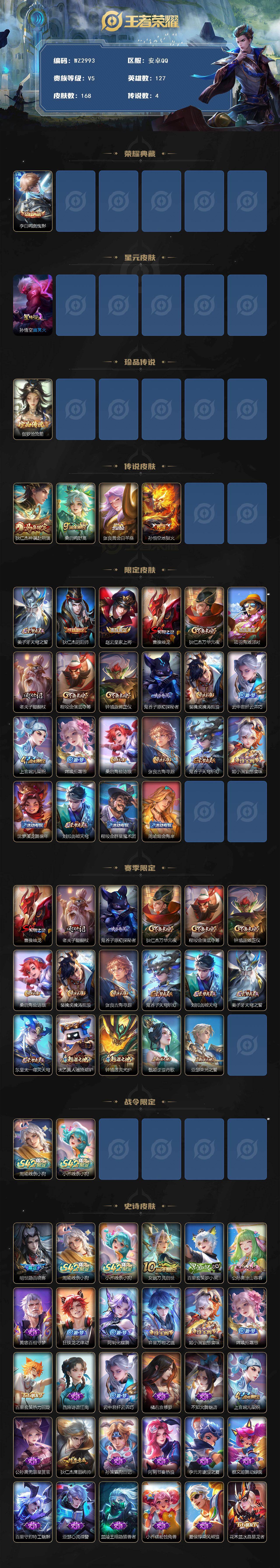 【秒换绑】安卓Q-V5-至尊星耀IV段位-127英雄-168皮肤-1典藏皮肤-1珍品传说-4传说-41史诗