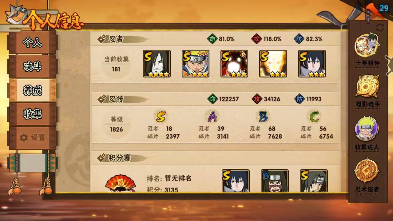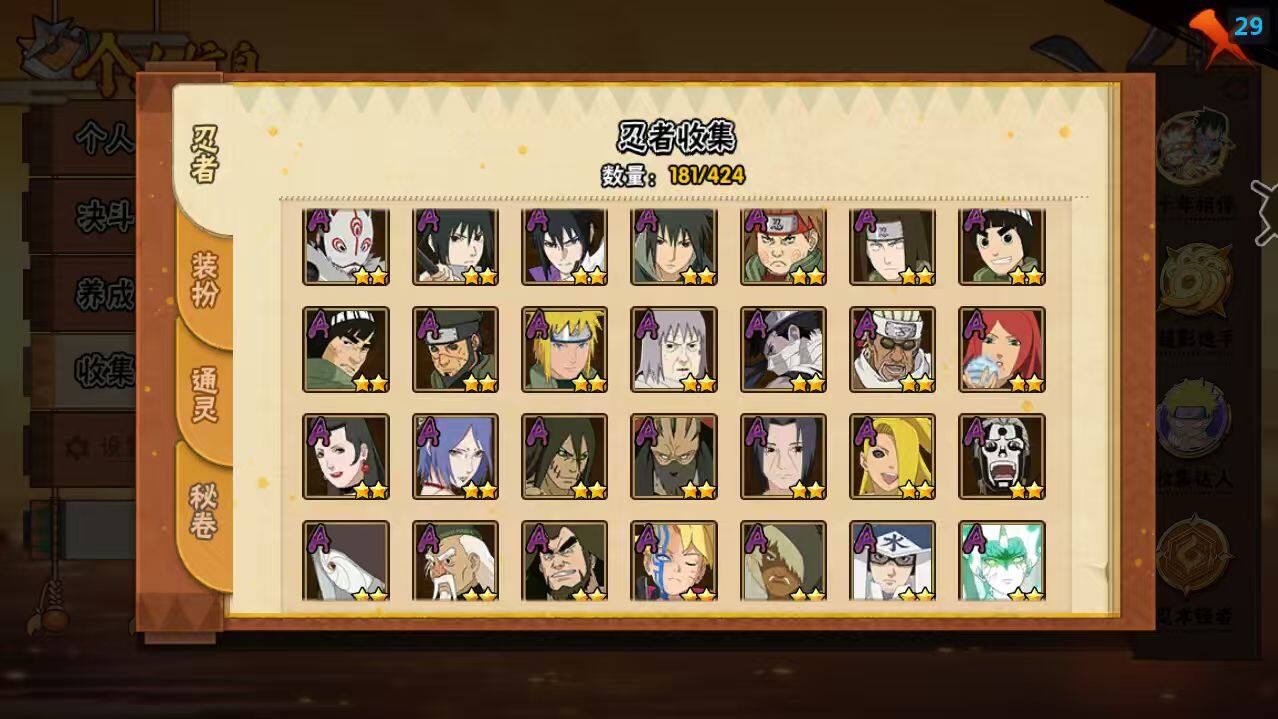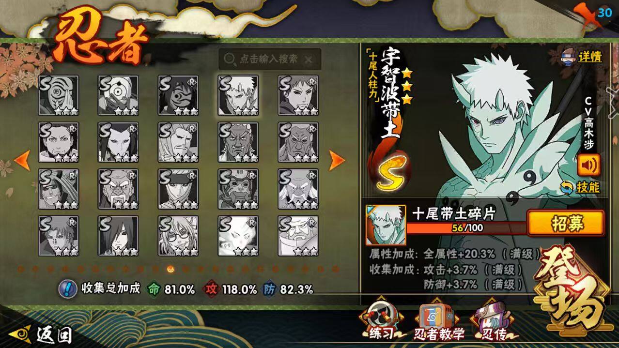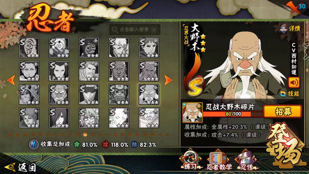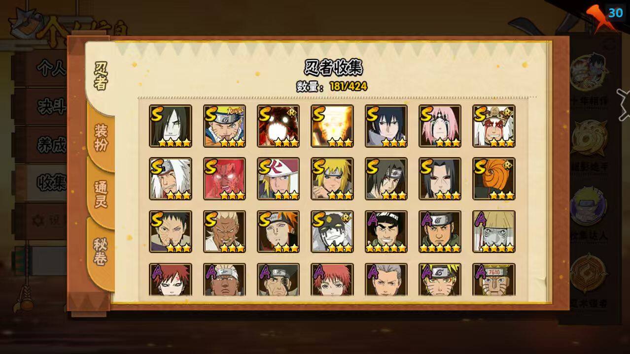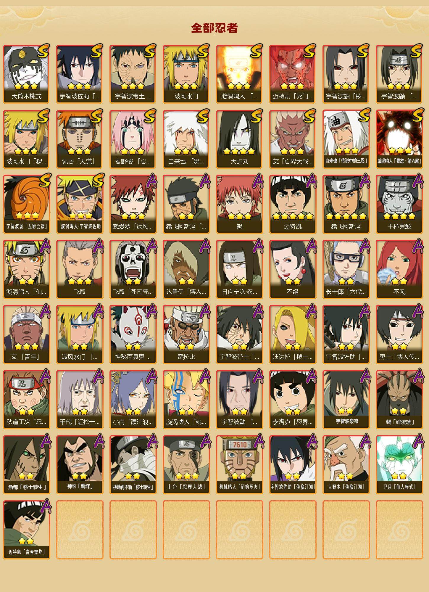 【S级忍者】:波风水门「秽土转生」(3星),宇智波鼬「秽土转生」(3星),春野樱「忍界大战」(3星),宇智波带土「忍界大战」(3星),艾「忍界大战」(3星),宇智波鼬「须佐能乎」(3星),自来也「舞之豪杰」(3星),大蛇丸(4星),自来也「传说中的三忍」(3星),波风水门(3星),漩涡鸣人「九喇嘛连结」(3星),迈特凯「死门」(3星),佩恩「天道」(3星),宇智波佐助「永恒万花筒」(3星),大筒木桃式(3星),漩涡鸣人「暴怒·第六尾」(3星),宇智波斑「五影会谈」