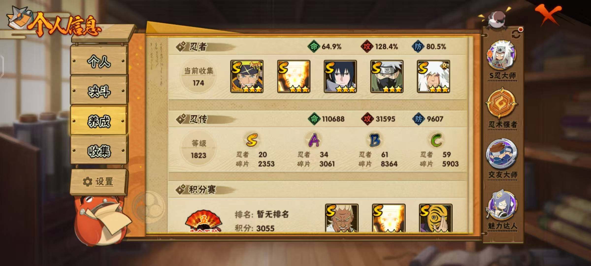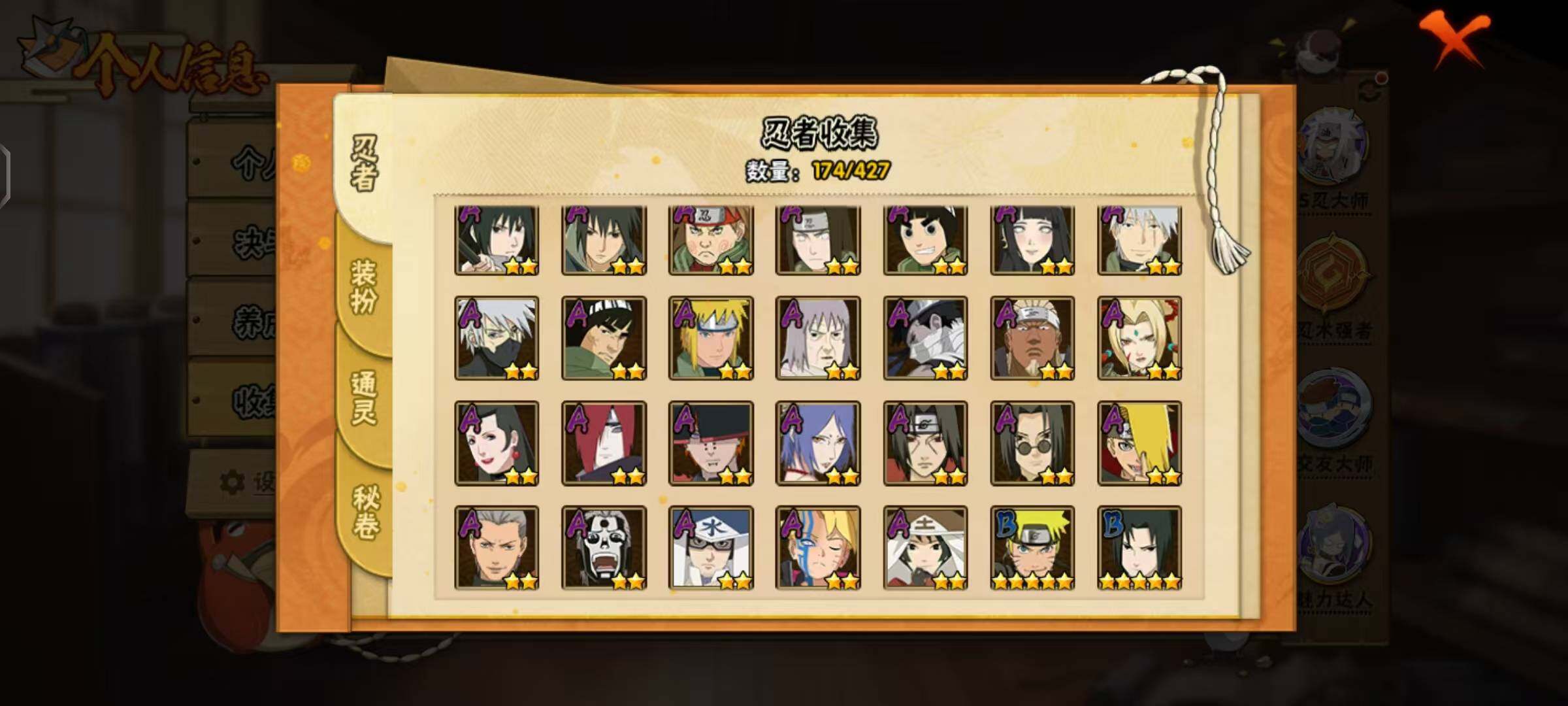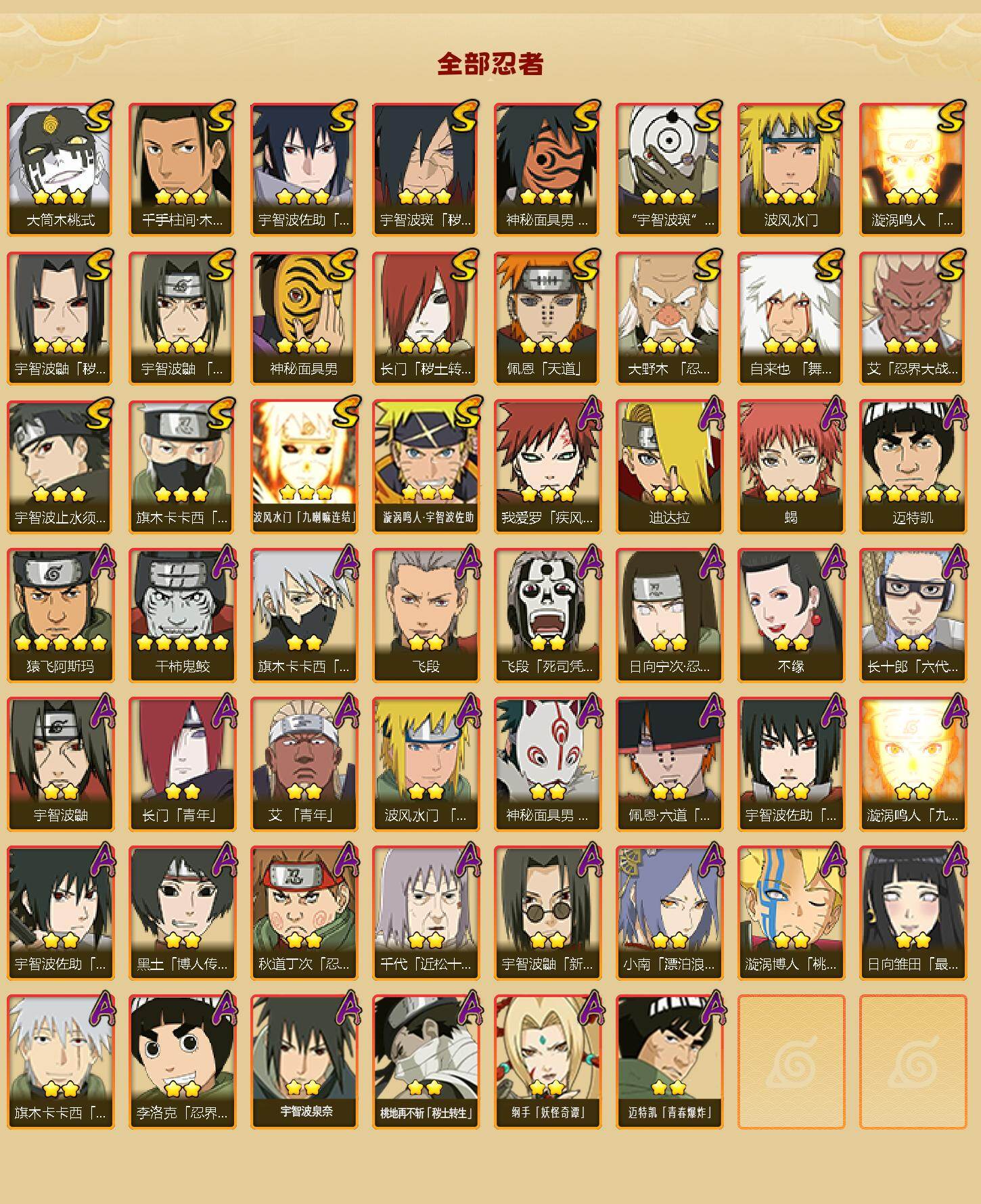 【S级忍者】:长门「秽土转生」(3星),宇智波鼬「秽土转生」(3星),宇智波斑「秽土转生·解」(3星),大野木「忍界大战」(3星),艾「忍界大战」(3星),宇智波鼬「须佐能乎」(3星),宇智波止水「须佐能乎」(3星),旗木卡卡西「须佐能乎」(3星),千手柱间「木叶创立」(3星),自来也「舞之豪杰」(3星),波风水门(3星),神秘面具男(3星),神秘面具男「红夜之刃」(3星),漩涡鸣人「九喇嘛连结」(3星),佩恩「天道」(3星),宇智波佐助「永恒万花筒」(3星),宇