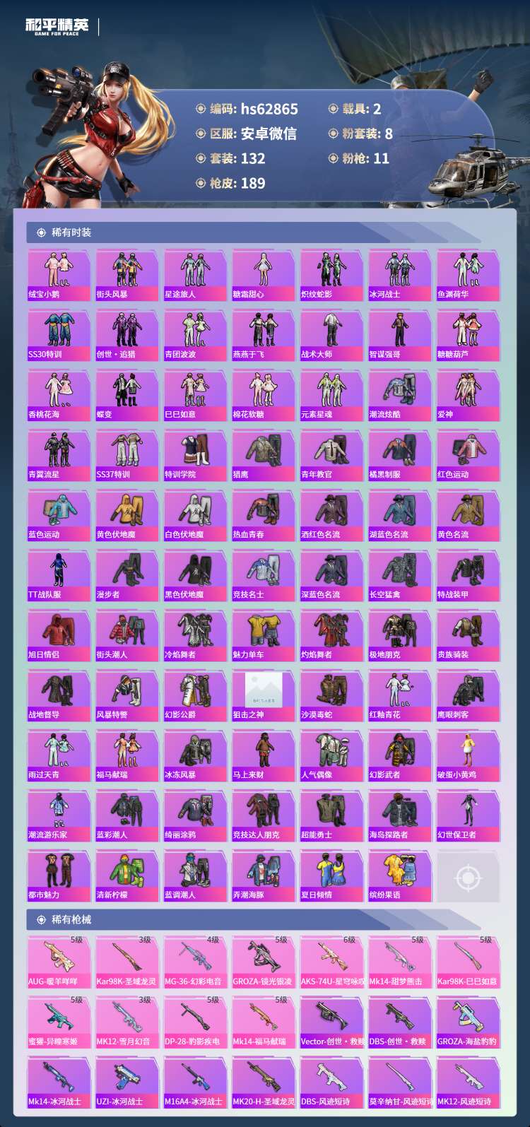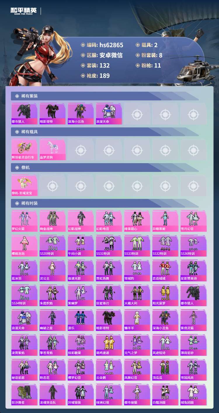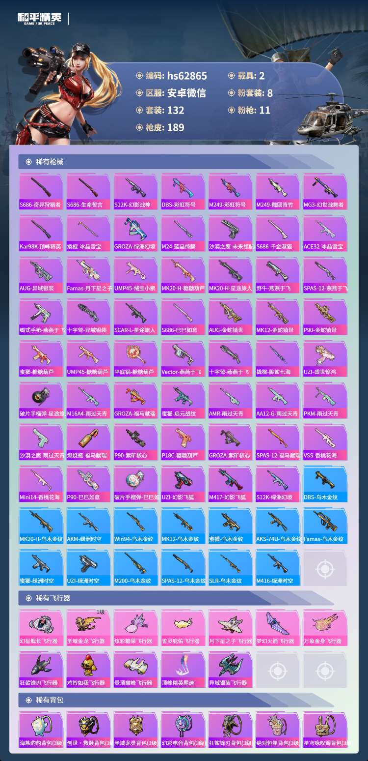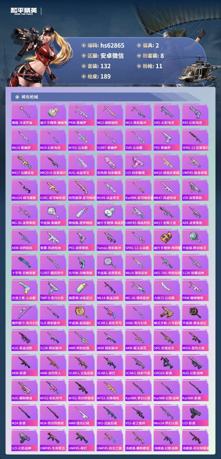 hs62865 安卓微-6王牌印记-8粉装-11特效枪-2载具-57344热力值-132套装-18