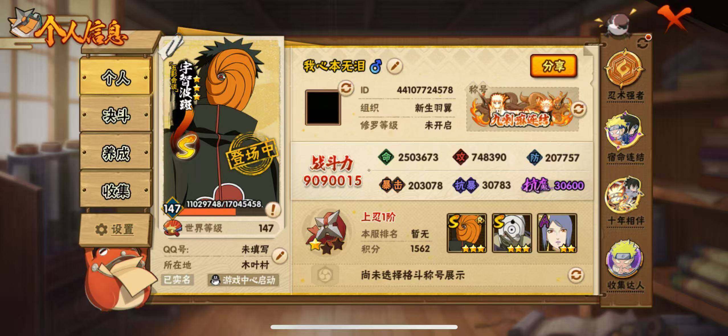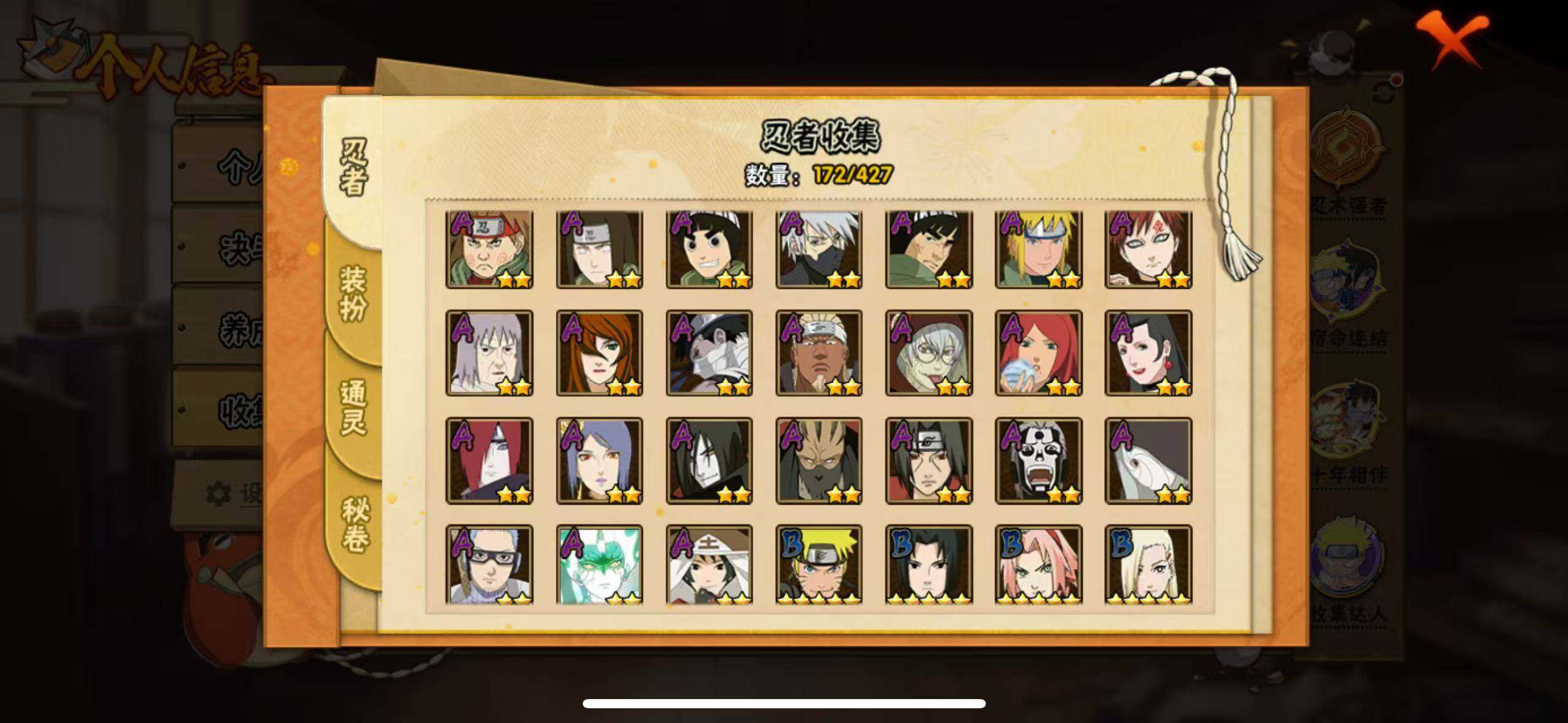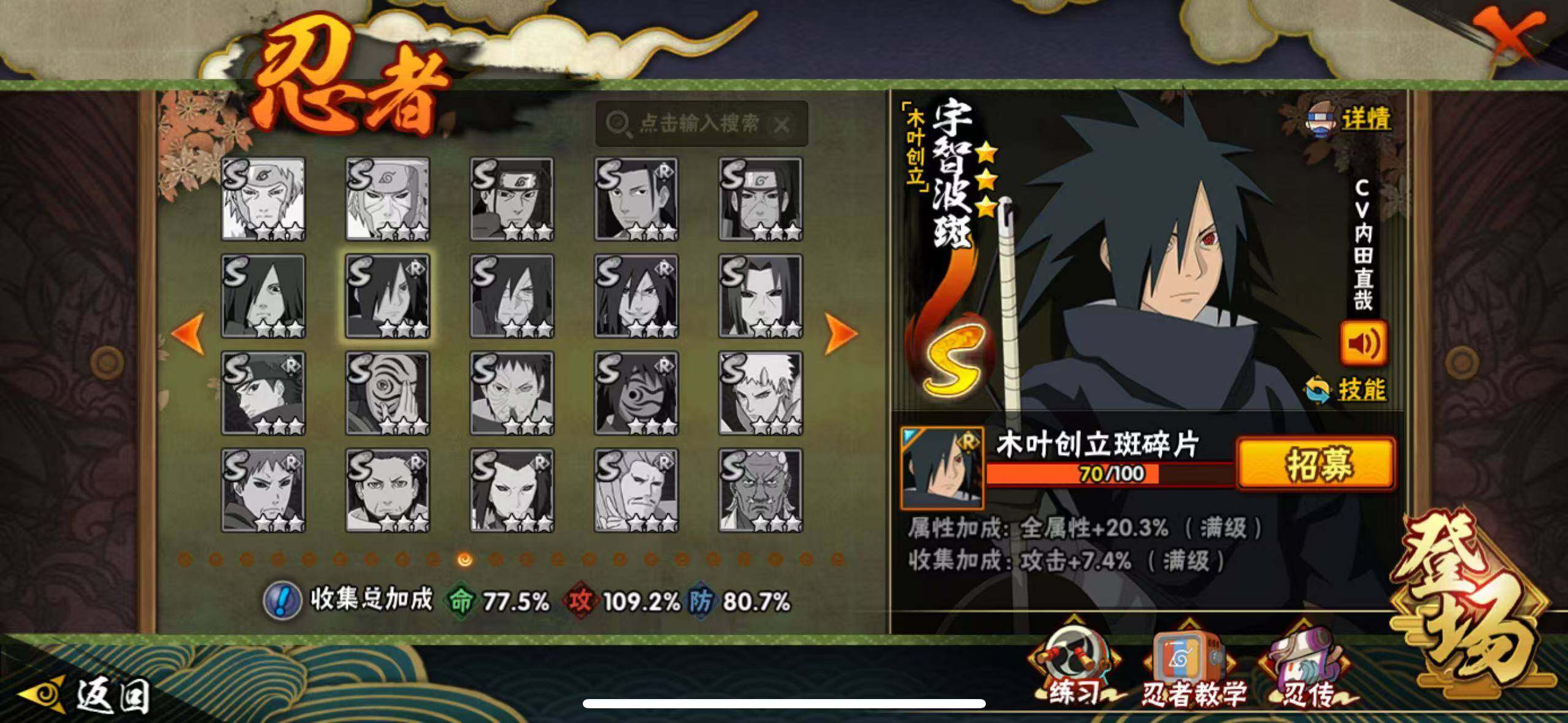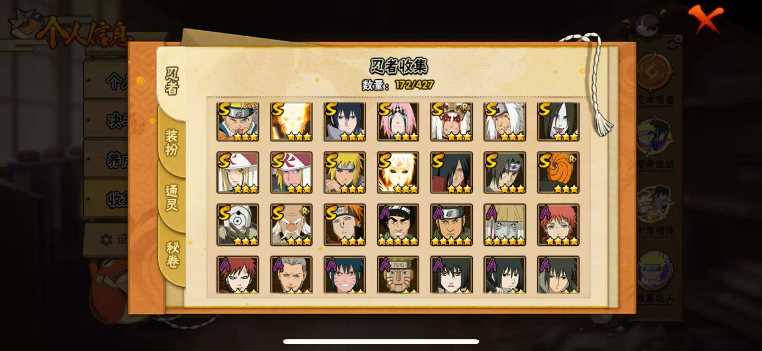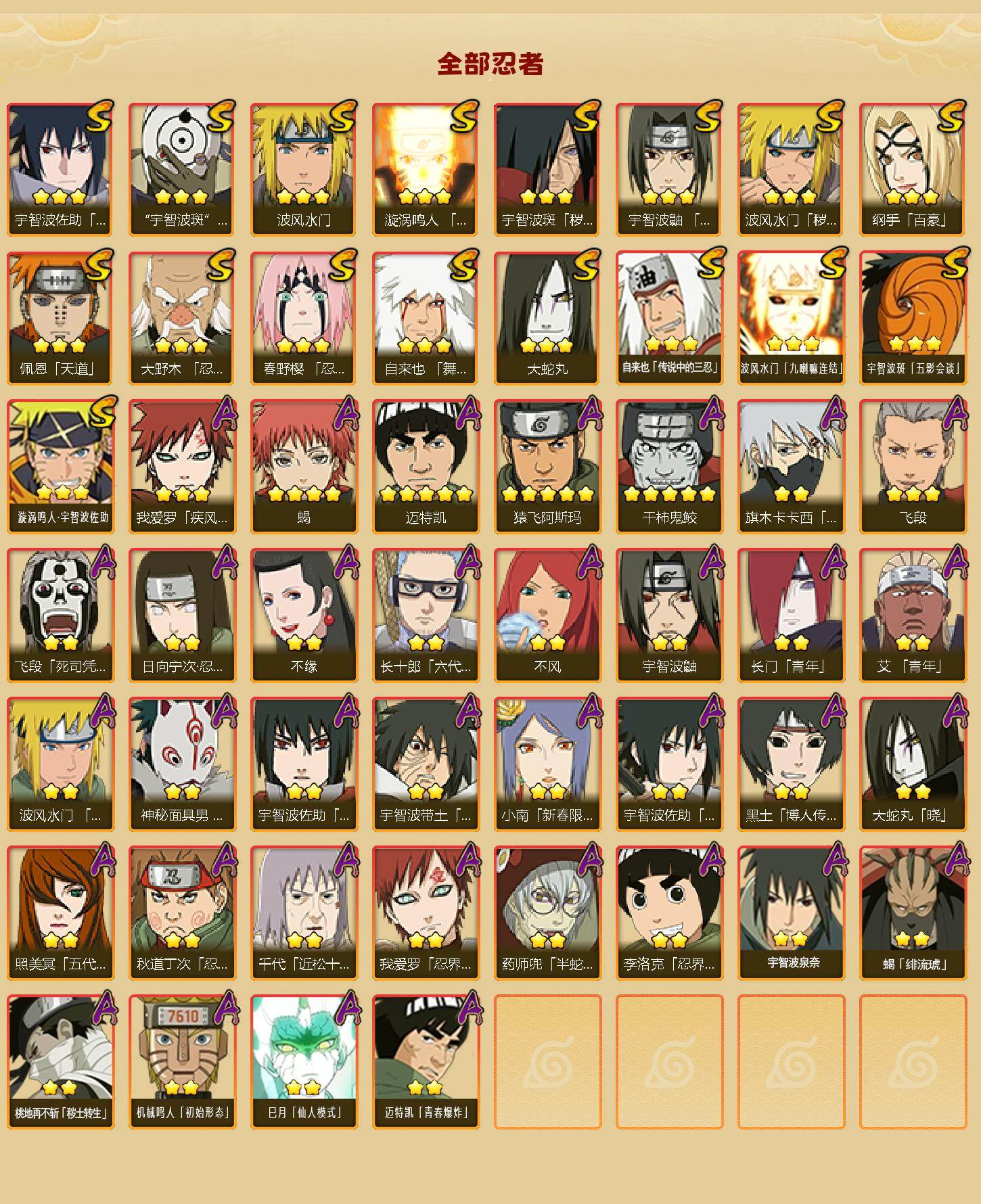 【S级忍者】:波风水门「秽土转生」(3星),宇智波斑「秽土转生」(3星),大野木「忍界大战」(3星),春野樱「忍界大战」(3星),宇智波鼬「须佐能乎」(3星),自来也「舞之豪杰」(3星),大蛇丸(3星),自来也「传说中的三忍」(3星),纲手「百豪」(3星),波风水门(3星),漩涡鸣人「九喇嘛连结」(3星),佩恩「天道」(3星),宇智波佐助「永恒万花筒」(3星),宇智波斑 「白面具」(3星宇智波斑「白面具」),波风水门「九喇嘛连结」(3星),宇智波斑「五影会谈」(3