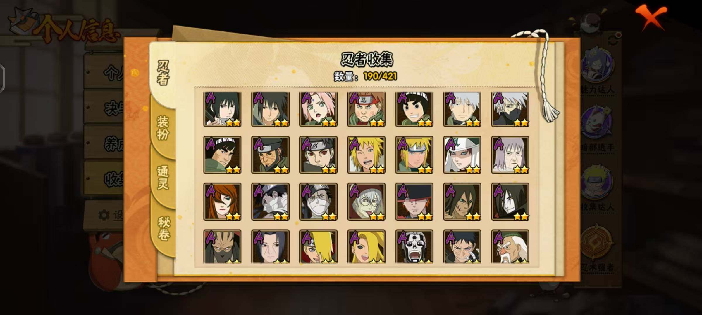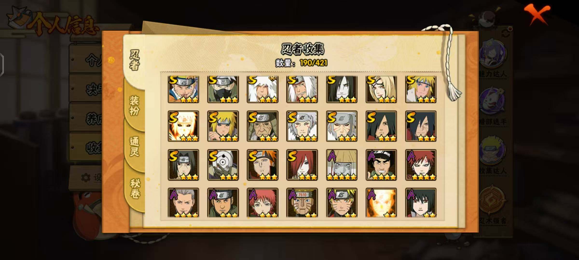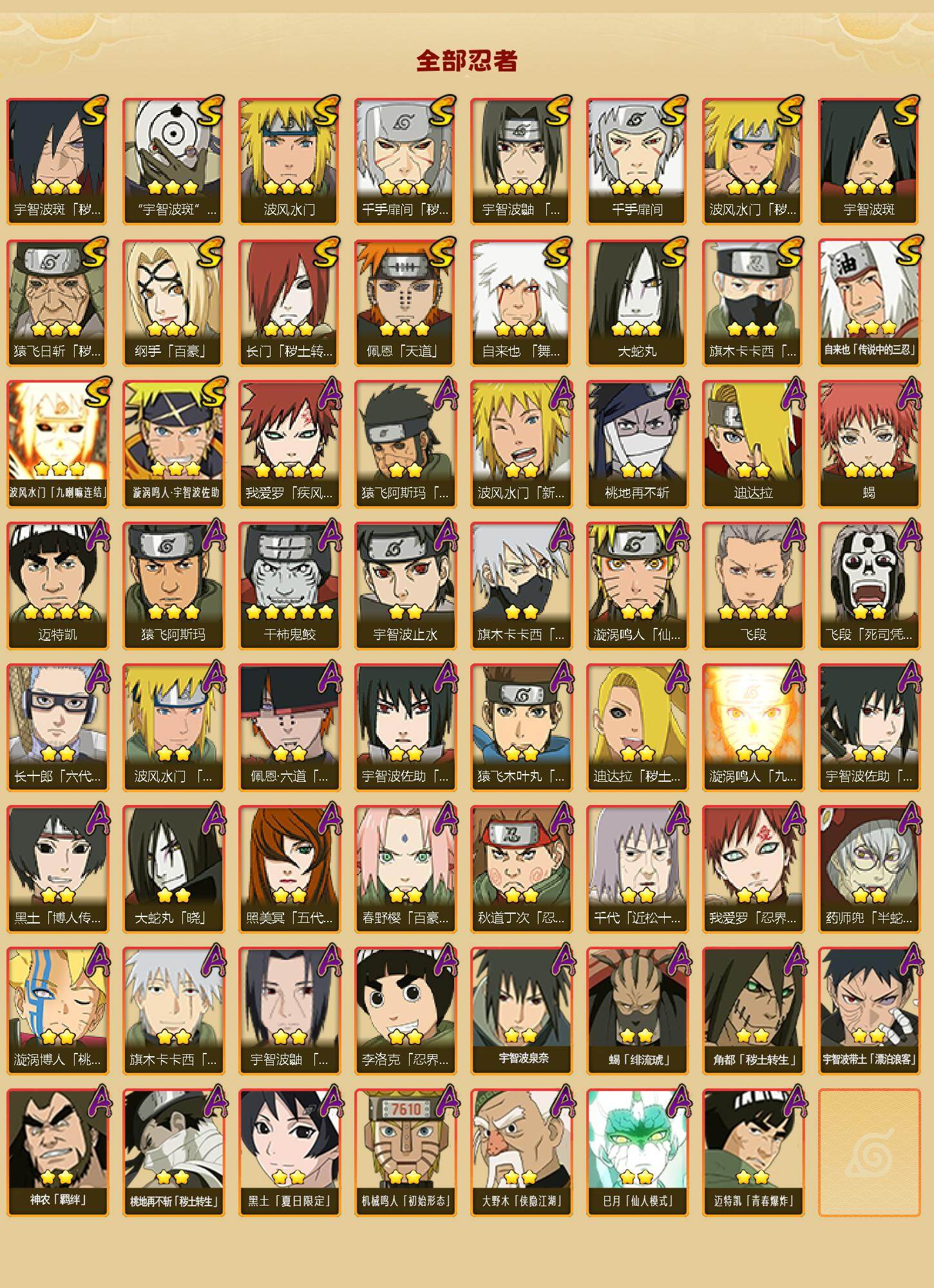 【S级忍者】:长门「秽土转生」(3星),猿飞日斩「秽土转生」(3星),波风水门「秽土转生」(3星),千手扉间「秽土转生」(3星),宇智波斑「秽土转生·解」(3星),宇智波鼬「须佐能乎」(3星),旗木卡卡西「须佐能乎」(3星),自来也「舞之豪杰」(3星),大蛇丸(3星),自来也「传说中的三忍」(3星),纲手「百豪」(3星),千手扉间(3星),宇智波斑(3星),波风水门(3星),佩恩「天道」(3星),宇智波斑 「白面具」(3星宇智波斑「白面具」),波风水门「九喇嘛连结