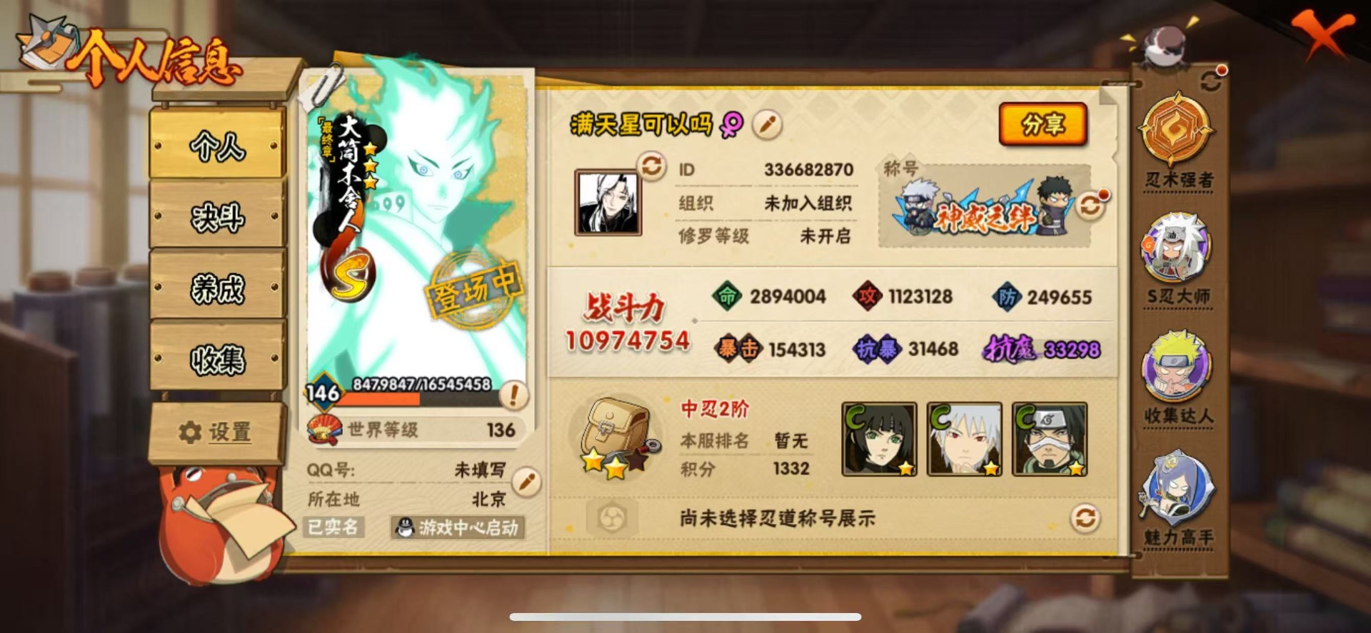 [16777847]V11 20S忍 39A忍 21通灵 1097.4W战力 可二次 可修改实名