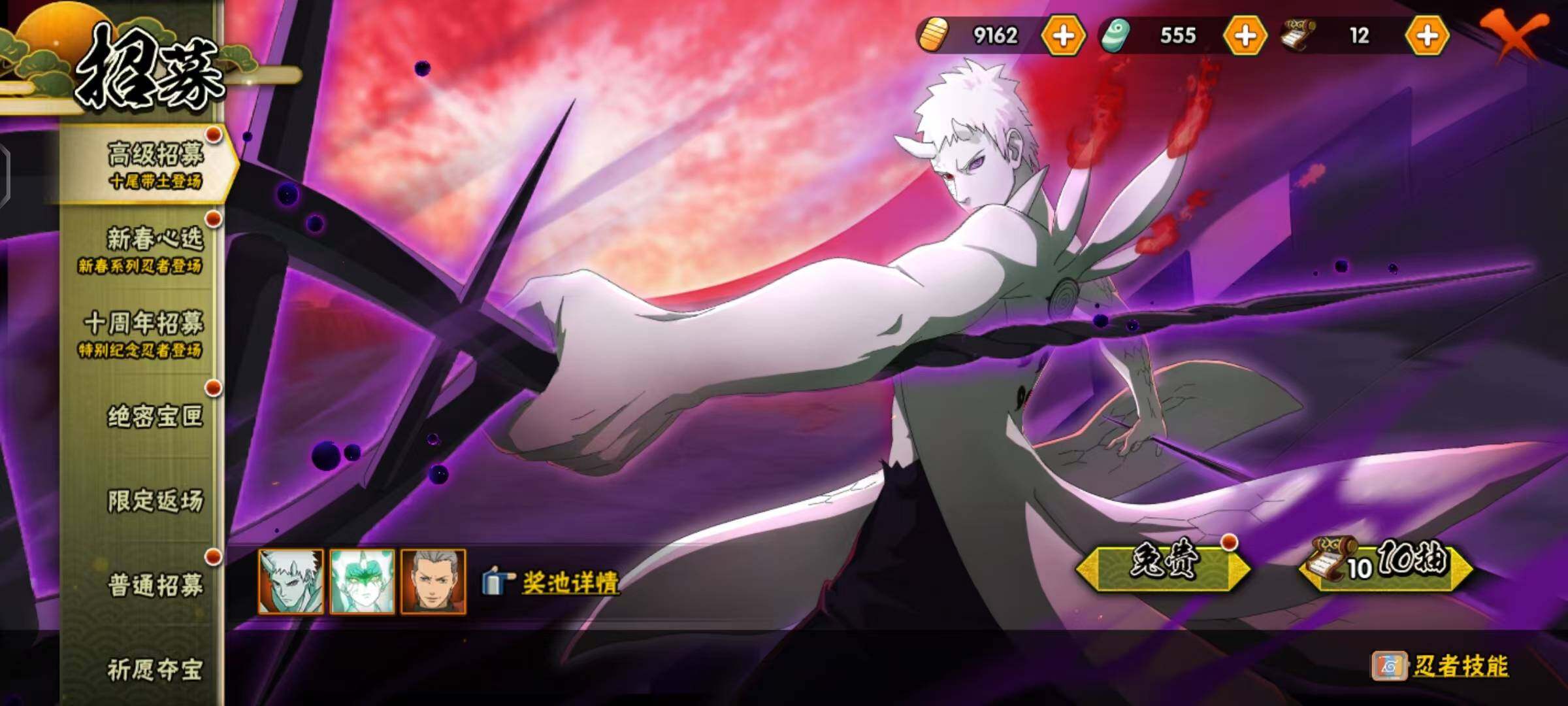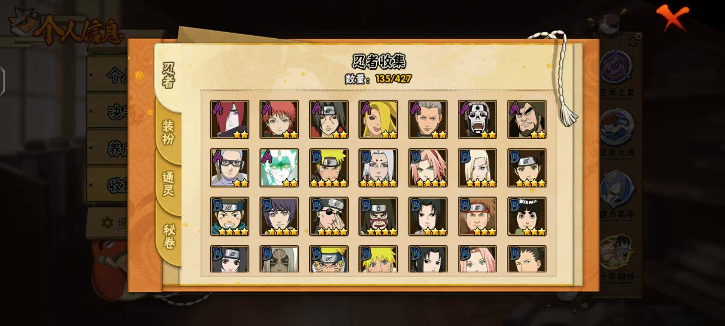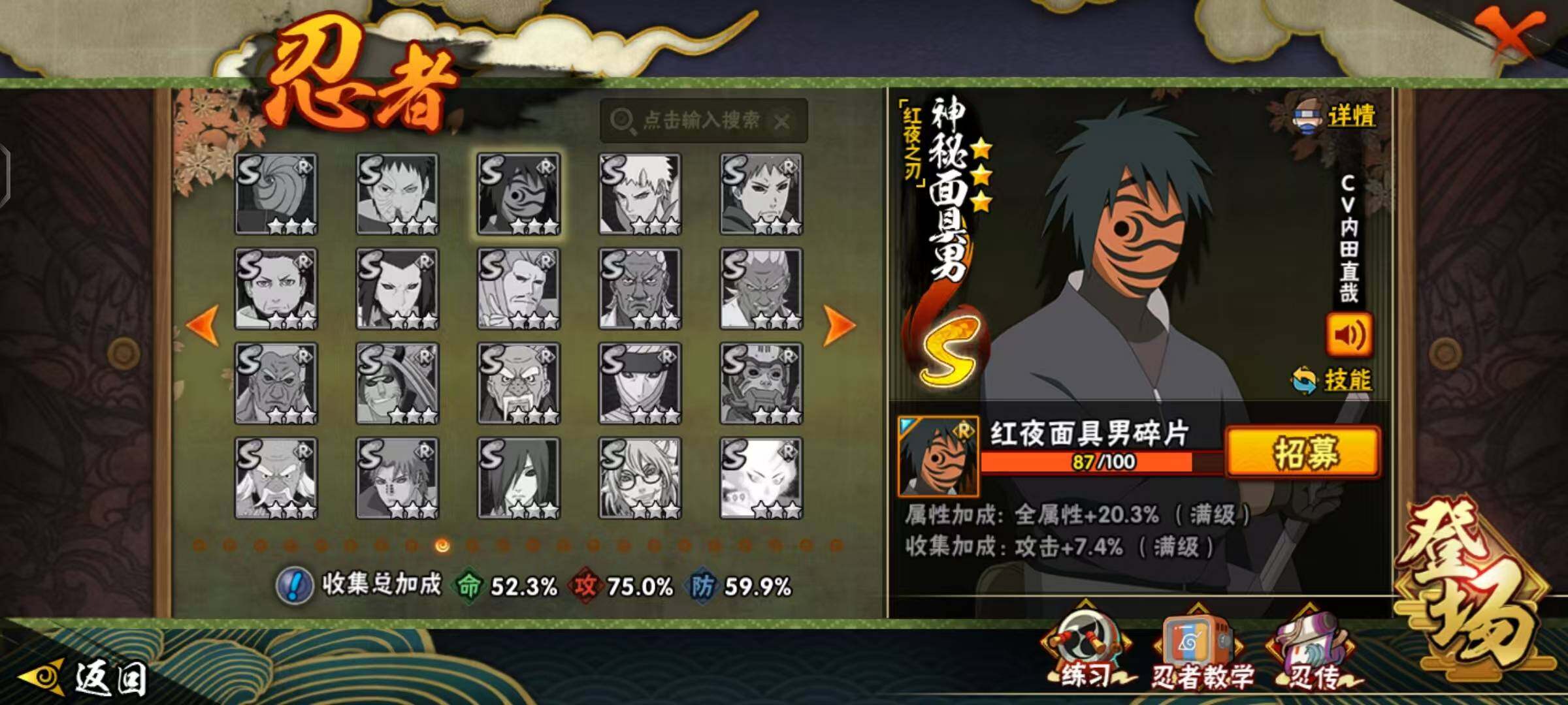 【S级忍者】:长门「秽土转生」(3星),千手扉间「秽土转生」(3星),宇智波鼬「秽土转生」(3星),宇智波斑「秽土转生·解」(3星),春野樱「忍界大战」(3星),宇智波带土「忍界大战」(3星),艾「忍界大战」(3星),宇智波鼬「须佐能乎」(3星),旗木卡卡西「须佐能乎」(3星),自来也(3星),自来也「舞之豪杰」(3星),大蛇丸(3星),波风水门(3星),神秘面具男「红夜之刃」(3星),迈特凯「死门」(3星),佩恩「天道」(3星),宇智波佐助「永恒万花筒」(3星)