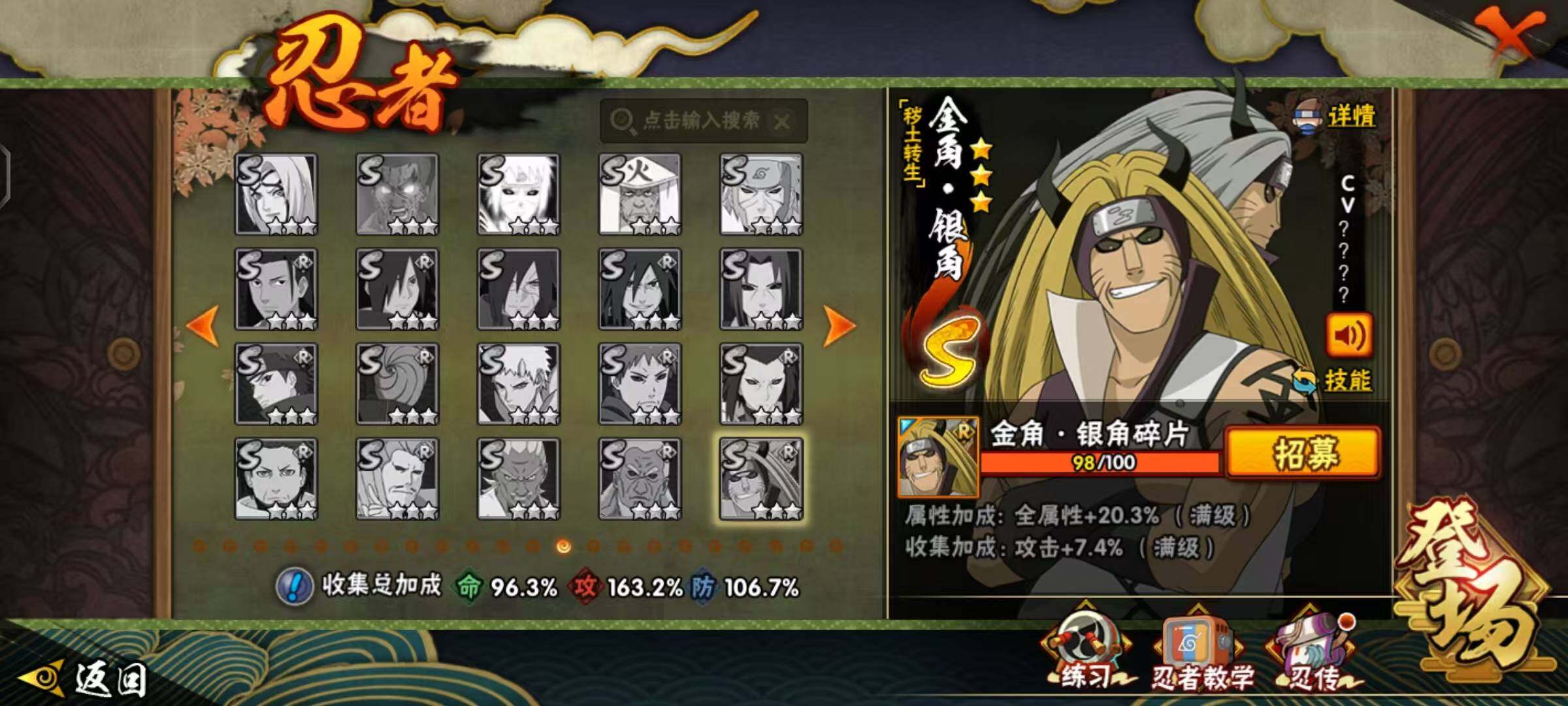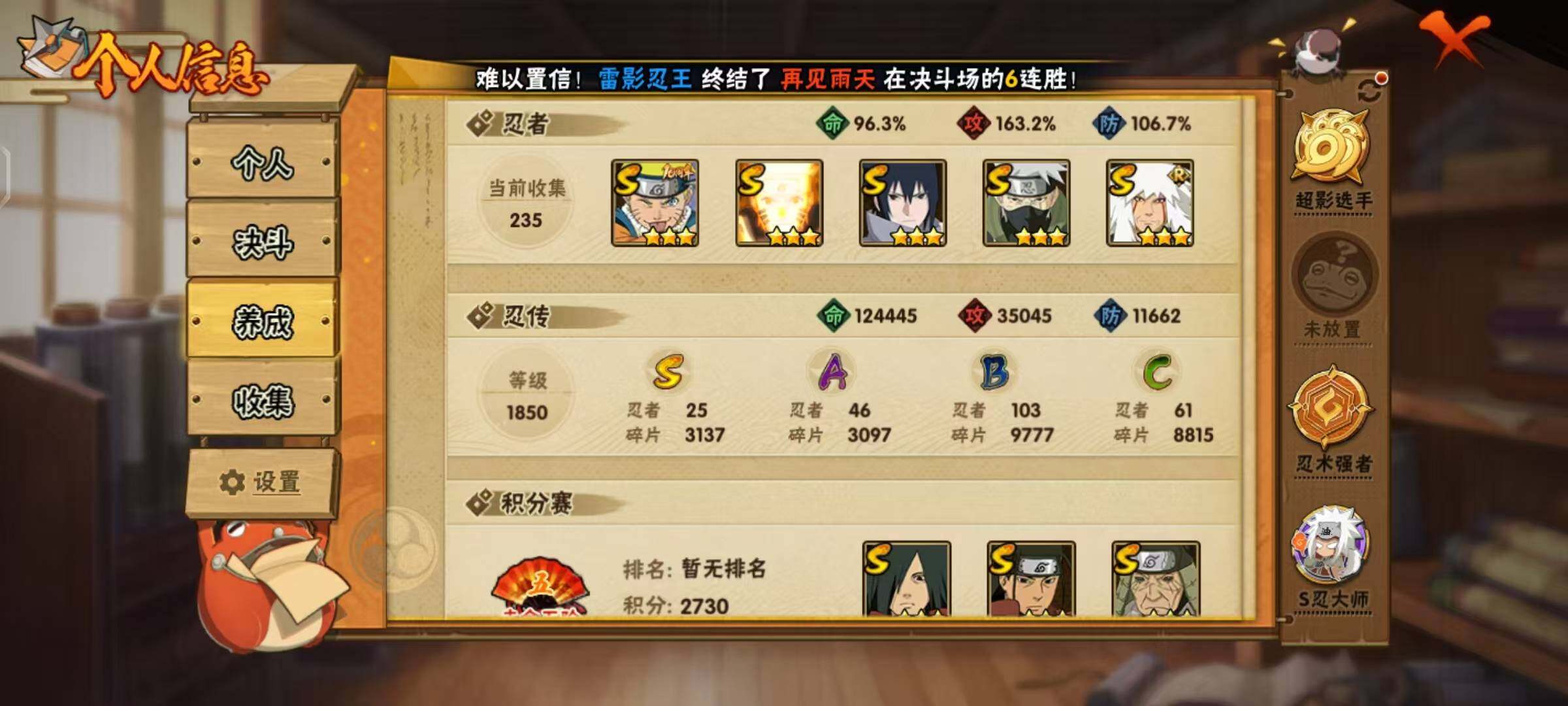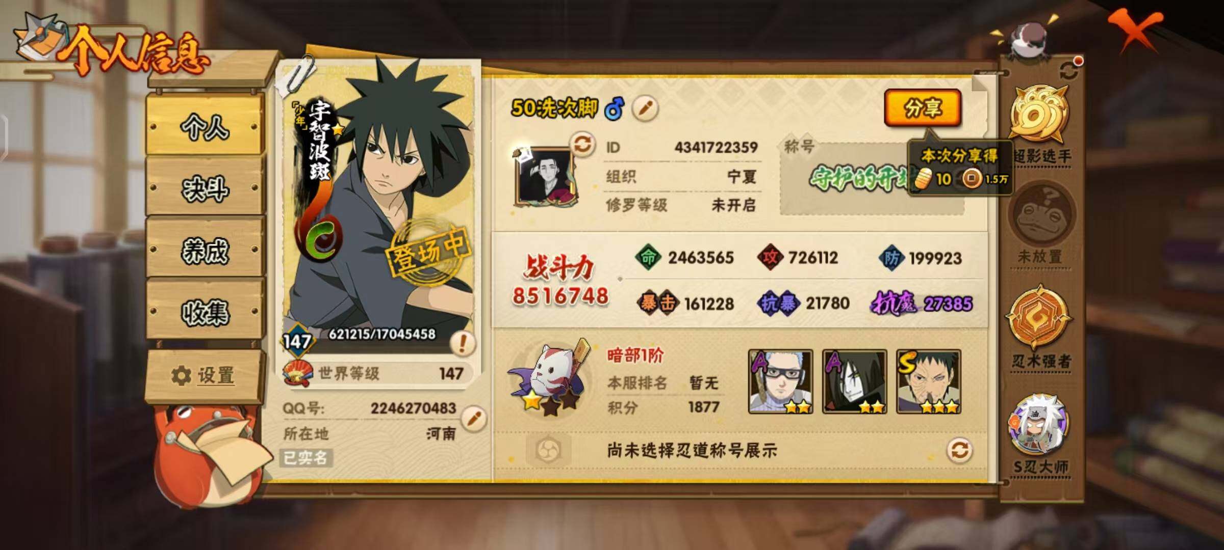 VIP9,851W战力,S忍25个,A忍46个,金银角98片,带土59片,创立