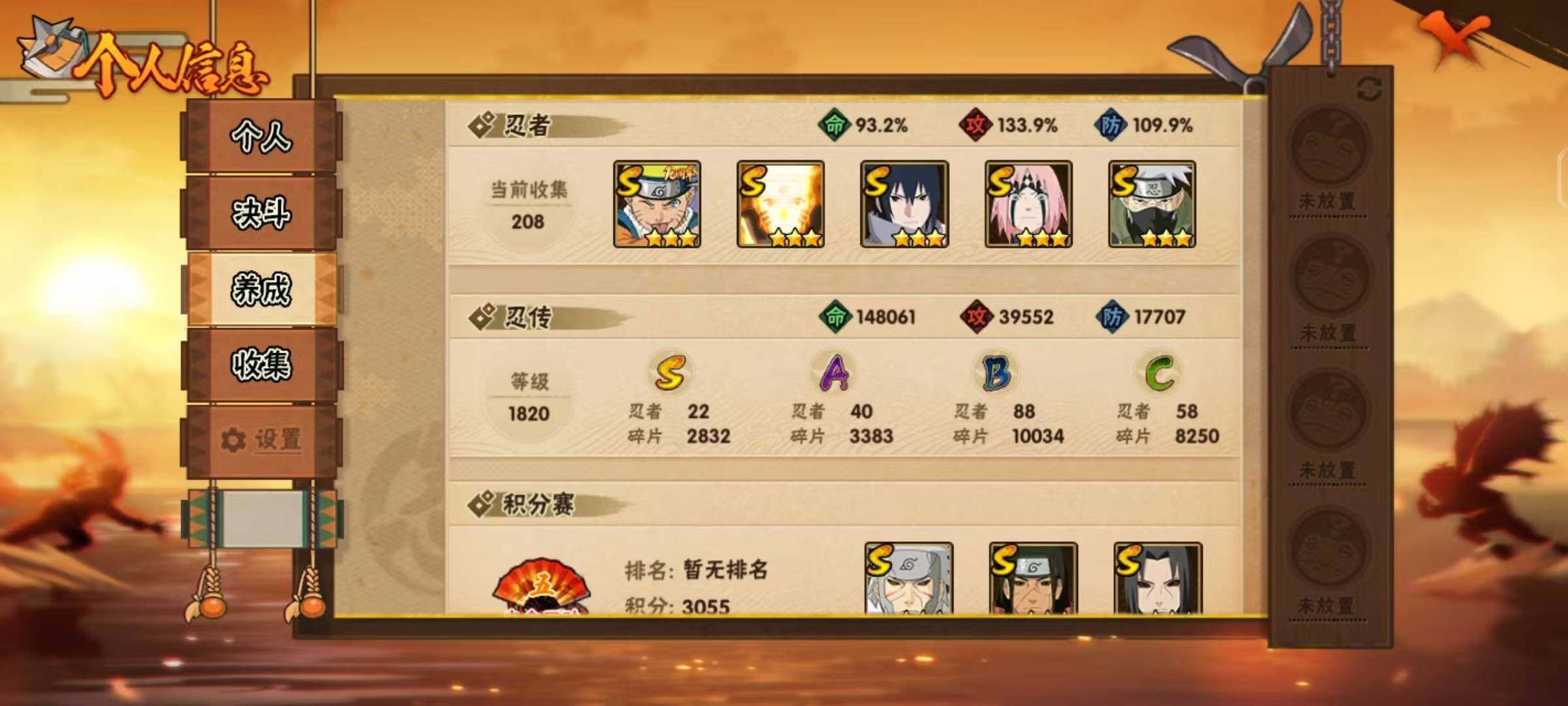 v10,1183万战力,22s,40a,三代97片,创立柱间80片,止水80片,桃式80片