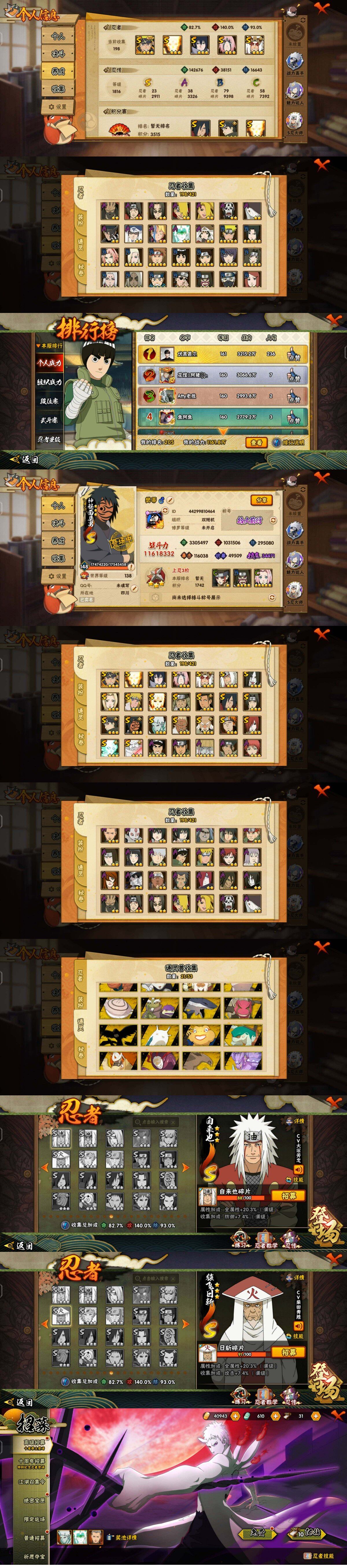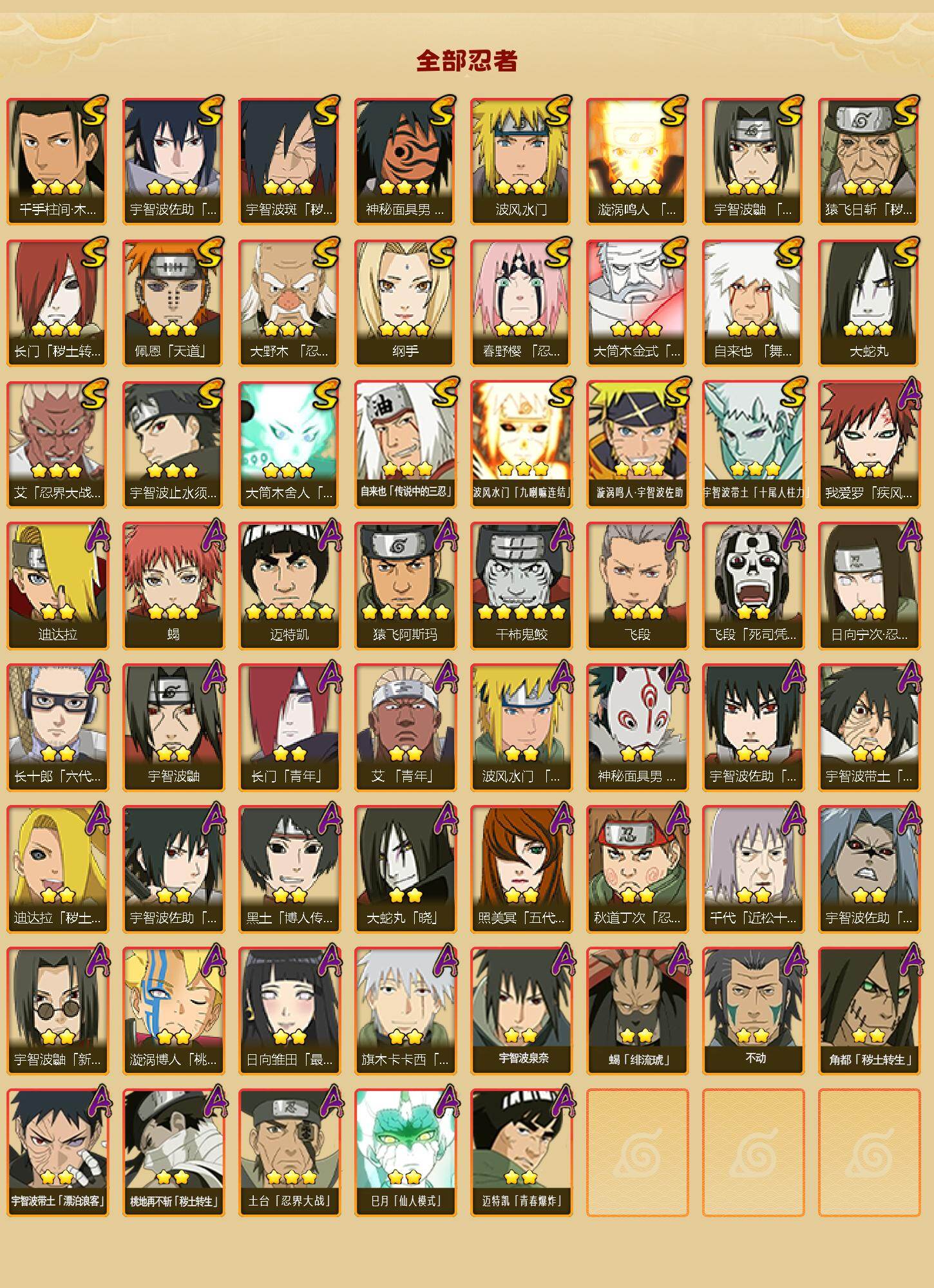 【S级忍者】:长门「秽土转生」(3星),猿飞日斩「秽土转生」(3星),宇智波斑「秽土转生·解」(3星),大野木「忍界大战」(3星),春野樱「忍界大战」(3星),艾「忍界大战」(3星),宇智波鼬「须佐能乎」(3星),宇智波止水「须佐能乎」(3星),千手柱间「木叶创立」(3星),自来也「舞之豪杰」(3星),大蛇丸(3星),自来也「传说中的三忍」(3星),纲手(3星),波风水门(3星),神秘面具男「红夜之刃」(3星),漩涡鸣人「九喇嘛连结」(3星),佩恩「天道」(3星)
