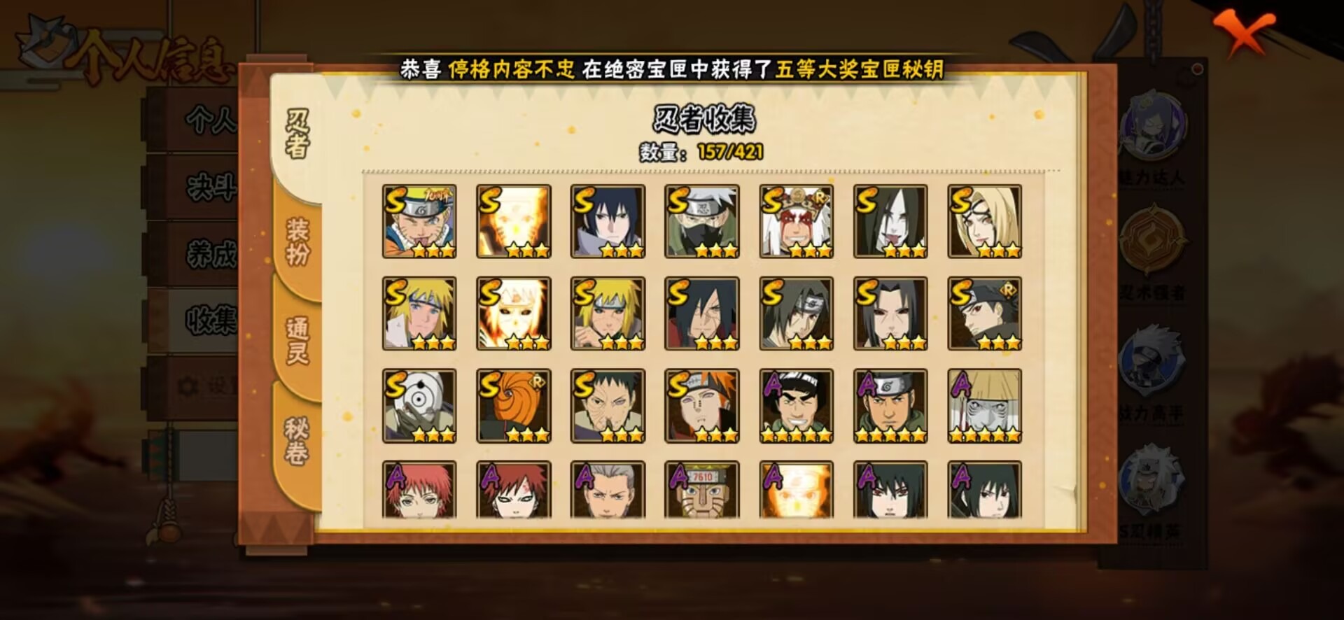 【S级忍者】宇智波止水「须佐能乎」,宇智波斑「秽土转生·解」,宇智波佐助「永恒万花筒」,漩涡鸣人 「九喇嘛连结」,宇智波带土 「忍界大战」,自来也 「舞之豪杰」,旗木卡卡西「须佐能乎」,波风水门「九喇嘛连结」,宇智波斑「五影会谈」,漩涡鸣人·宇智波佐助,宇智波鼬「秽土转生」,宇智波斑「白面具」,纲手「百豪」,波风水门「秽土转生」,宇智波鼬 「须佐能乎」,佩恩「天道」,波风水门,大蛇丸