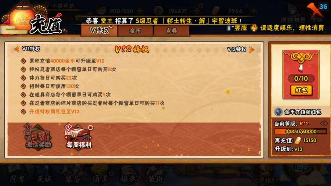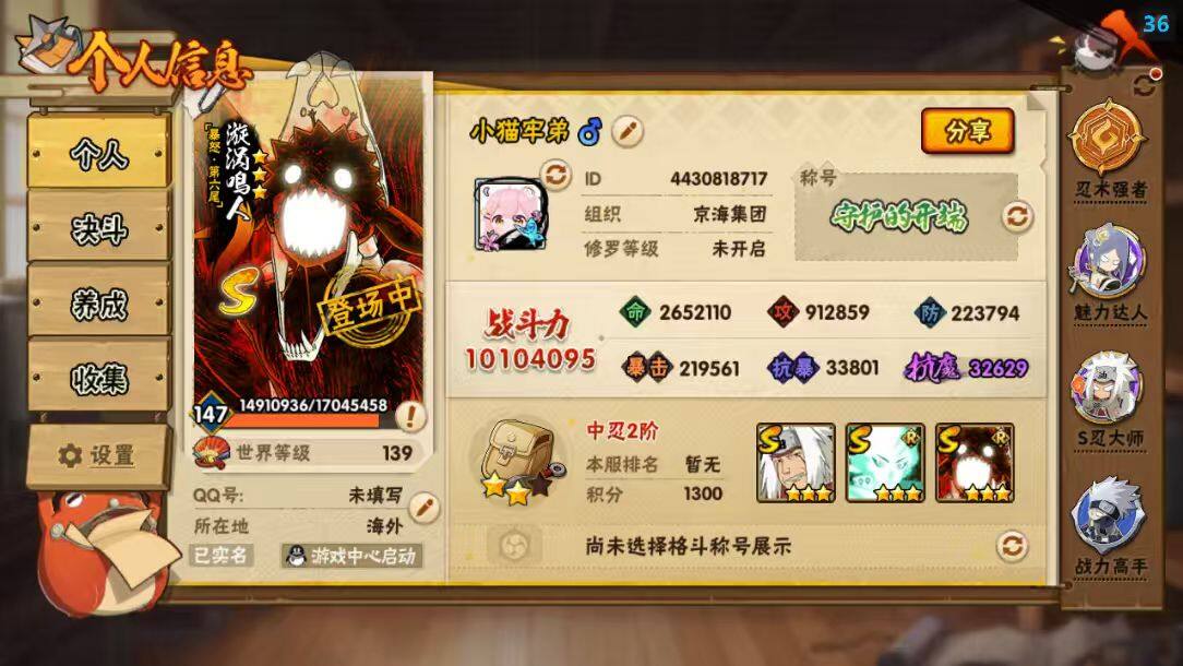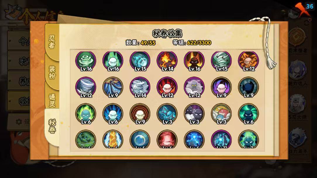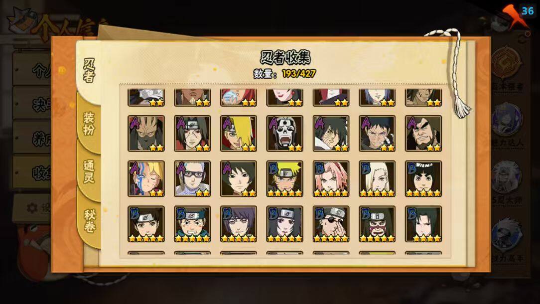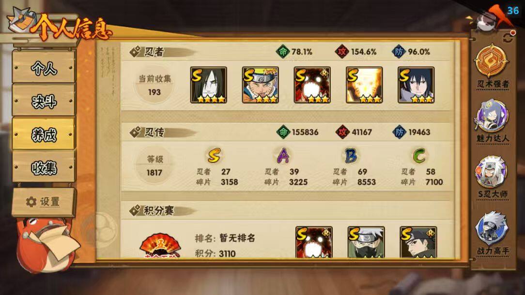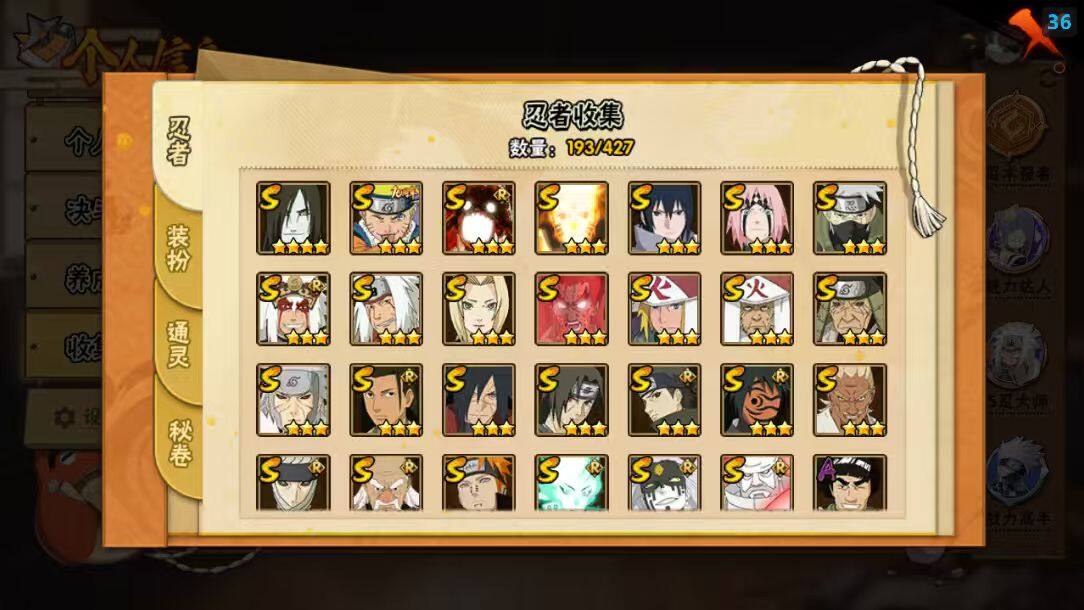 【S级忍者】:猿飞日斩「秽土转生」(3星),千手扉间「秽土转生」(3星),宇智波斑「秽土转生·解」(3星),大野木「忍界大战」(3星),春野樱「忍界大战」(3星),艾「忍界大战」(3星),宇智波鼬「须佐能乎」(3星),宇智波止水「须佐能乎」(3星),旗木卡卡西「须佐能乎」(3星),千手柱间「木叶创立」(3星),无「二代目土影」(3星),自来也「舞之豪杰」(3星),大蛇丸(4星),自来也「传说中的三忍」(3星),纲手(3星),猿飞日斩(3星),波风水门(3星),神秘