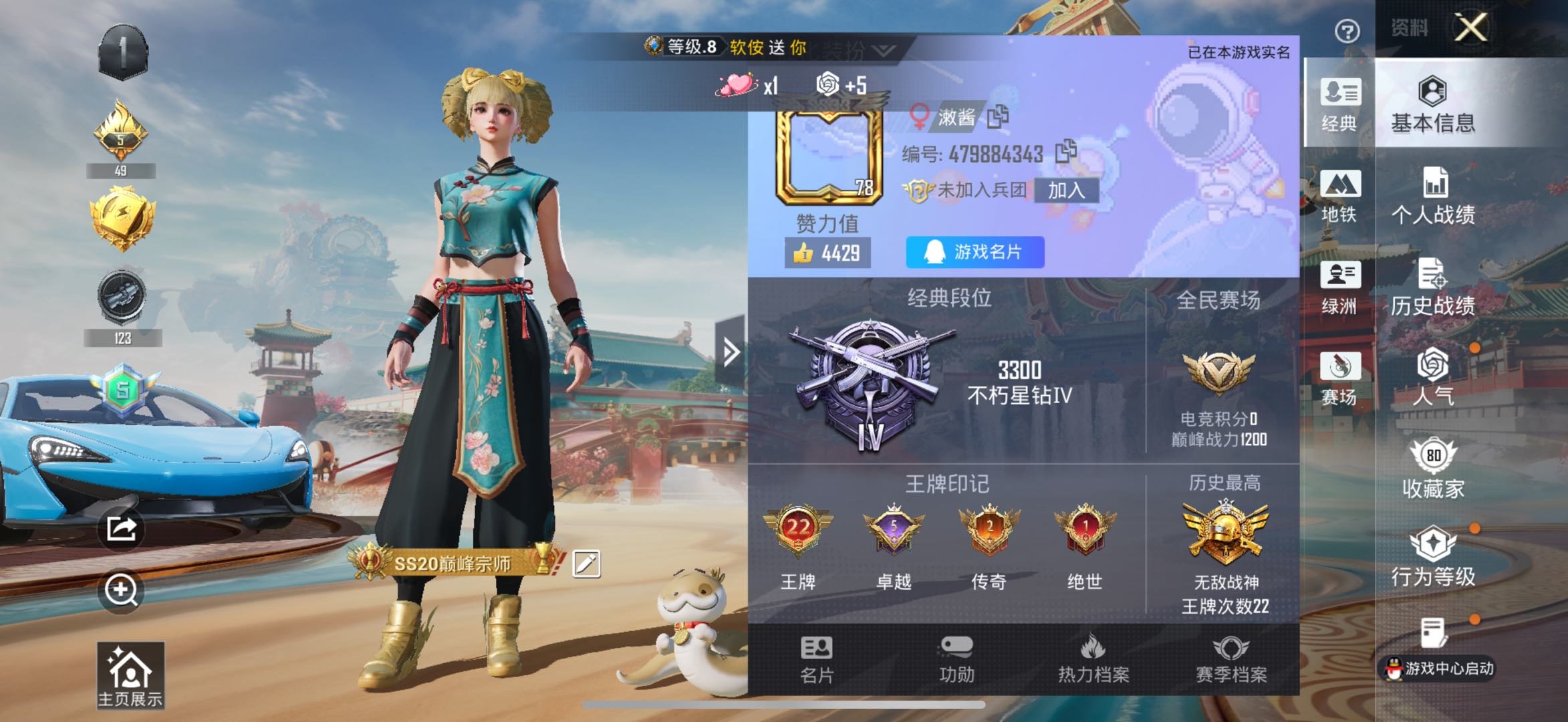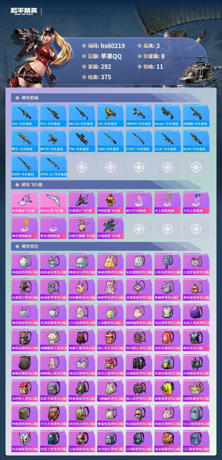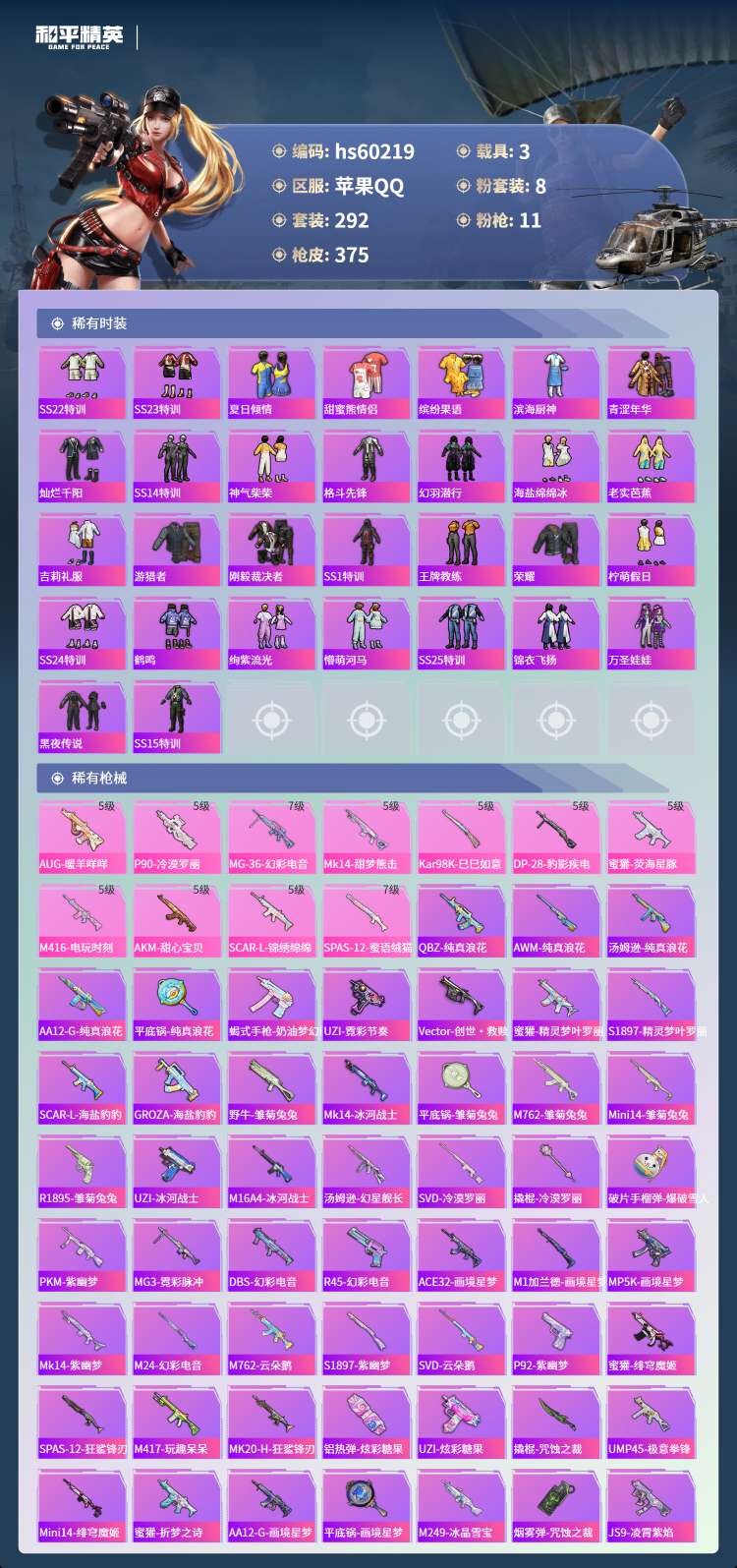 hs60219 苹果手Q-22王牌印记-有战神框-8粉装-11特效枪-3载具-113874热力值-2