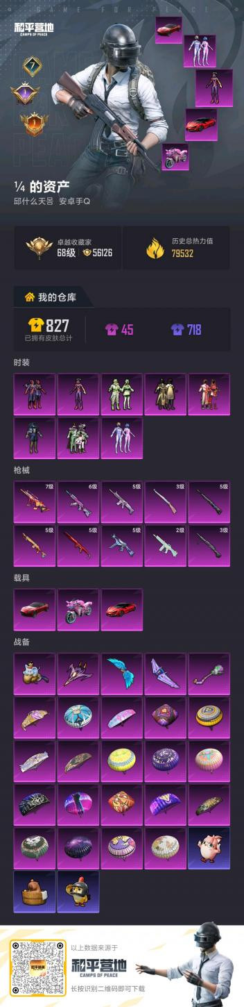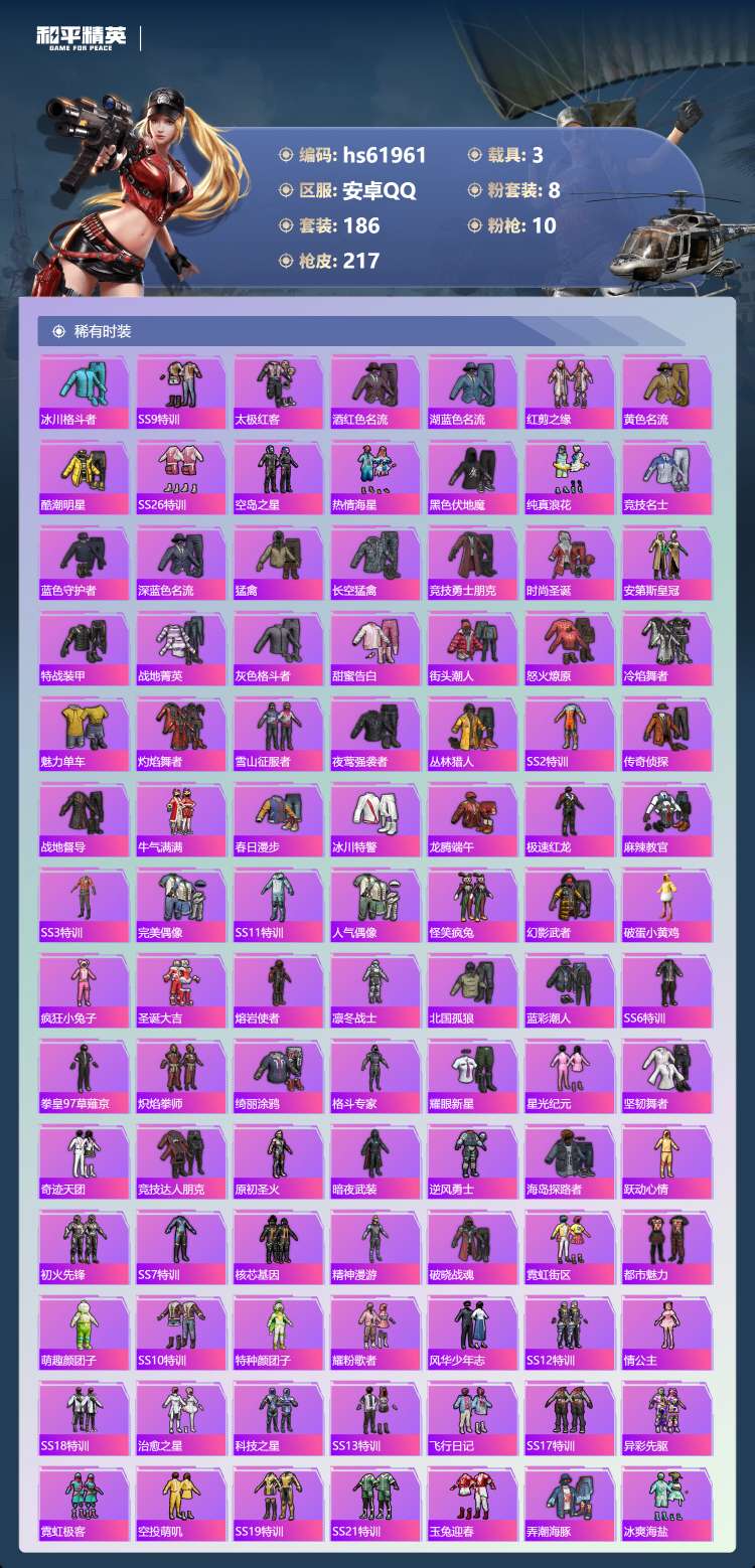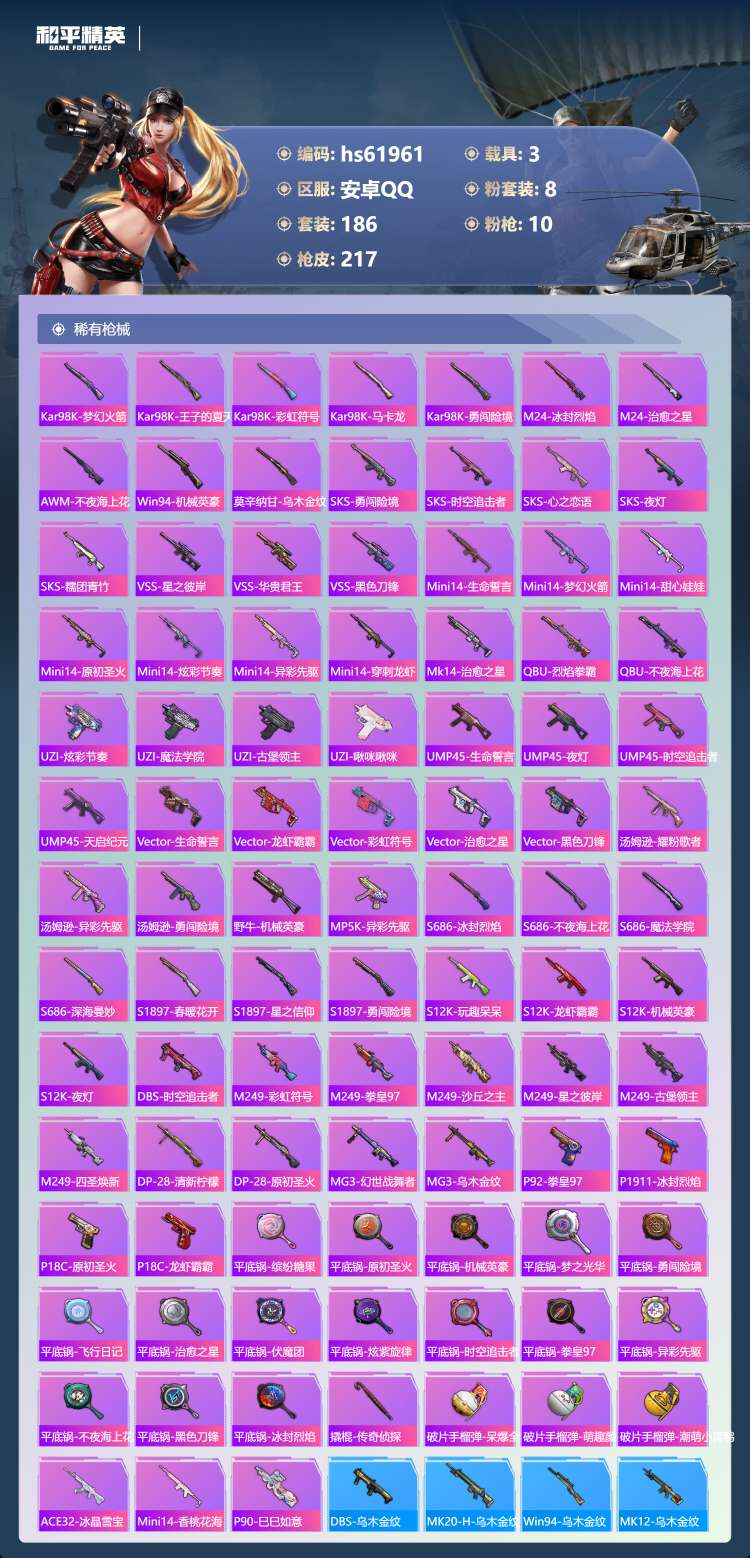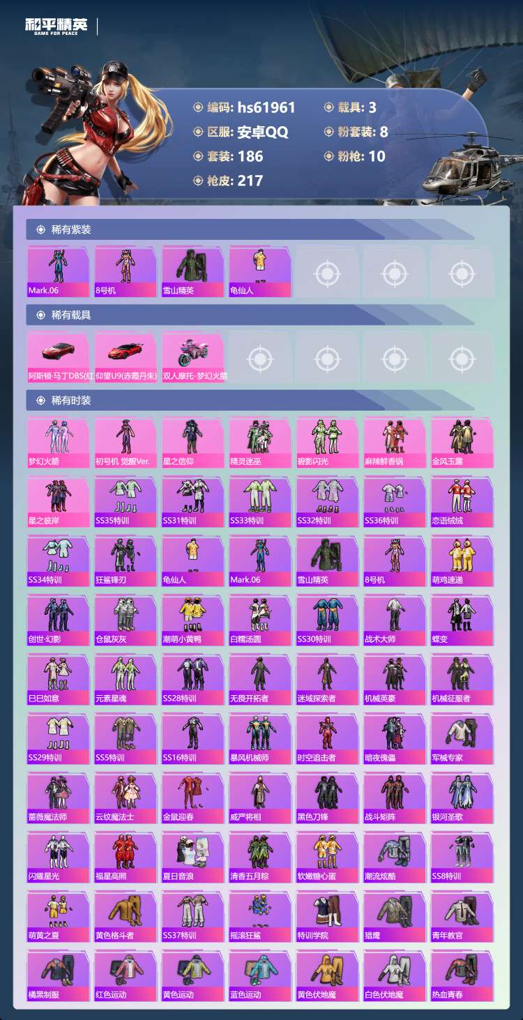 hs61961 安卓手Q-7王牌印记-8粉装-10特效枪-3载具-79562热力值-186套装-21