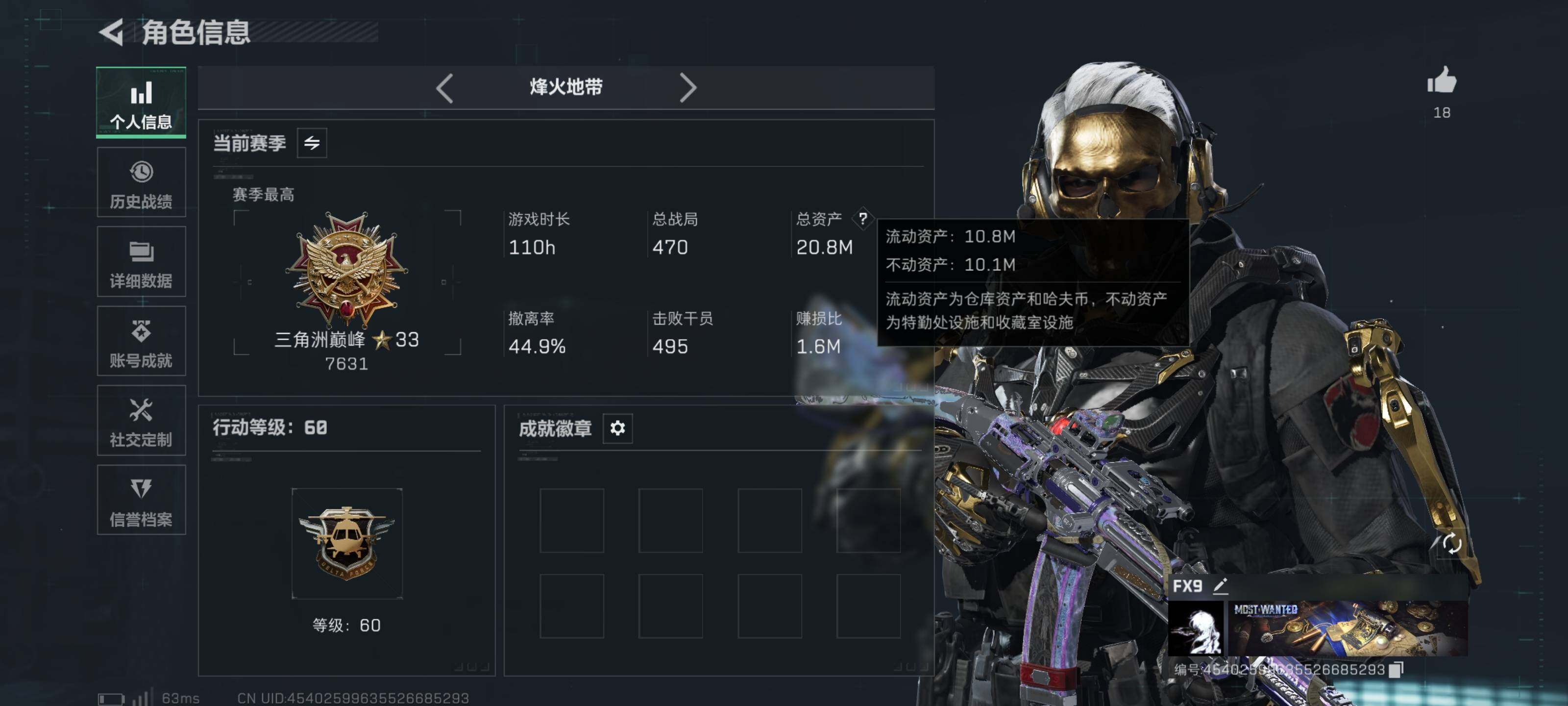 20m总资产-270k哈伏币-60烽火等级-三角洲巅峰-50战场等级-校官