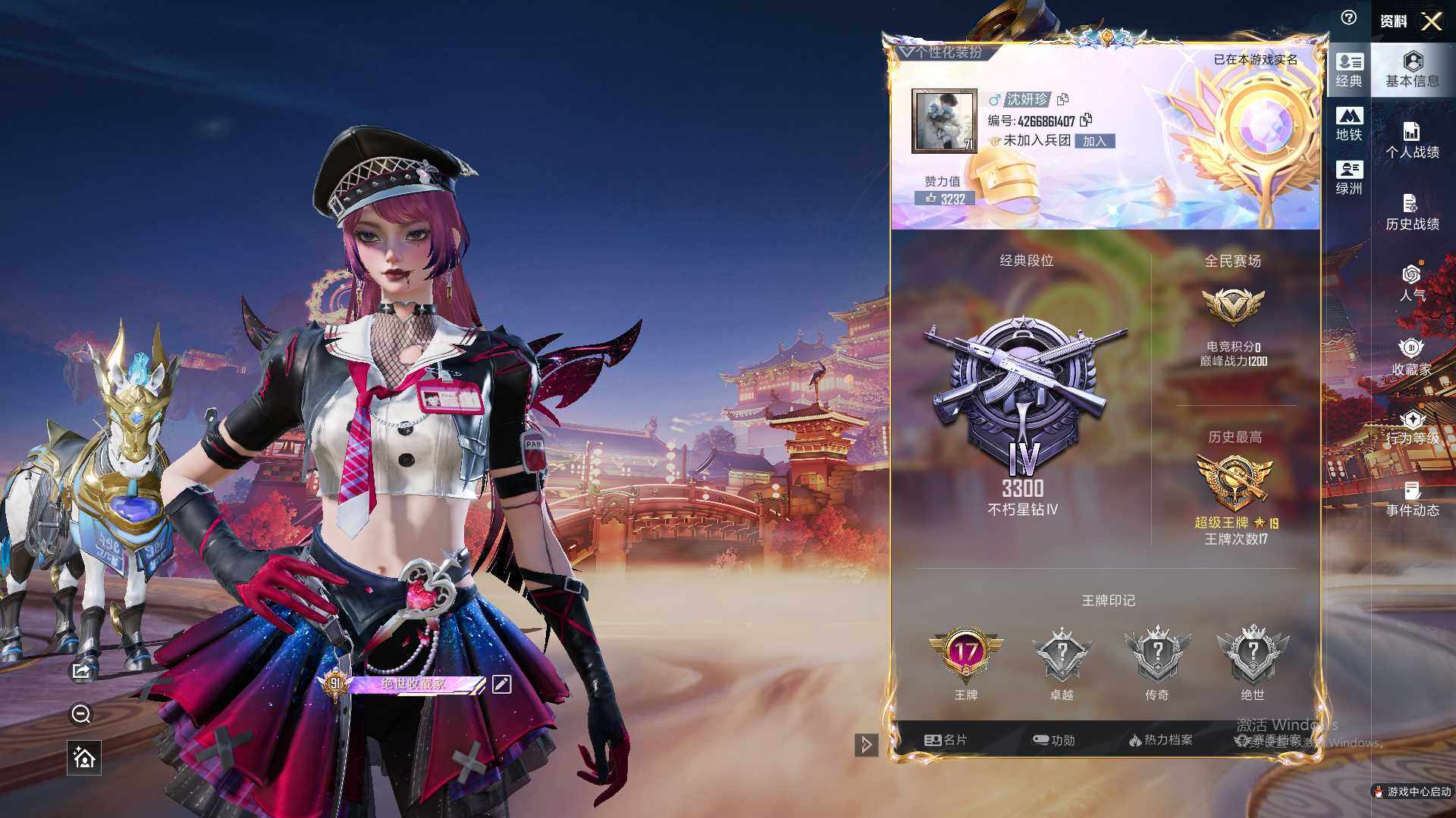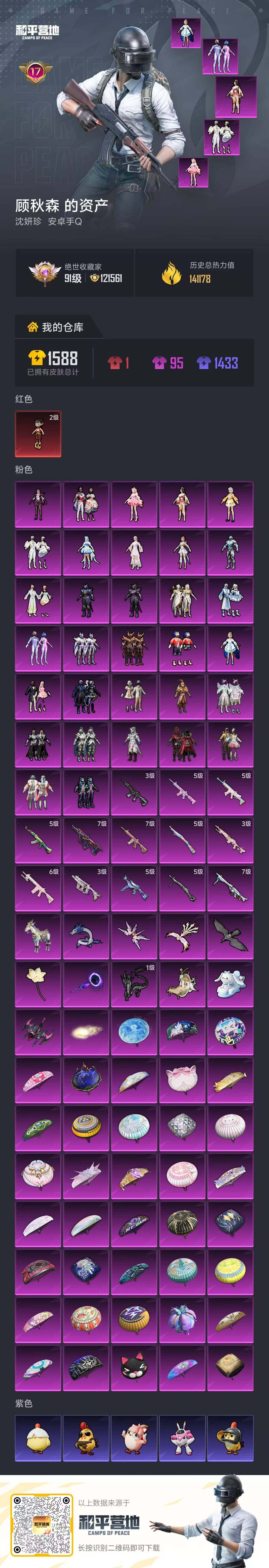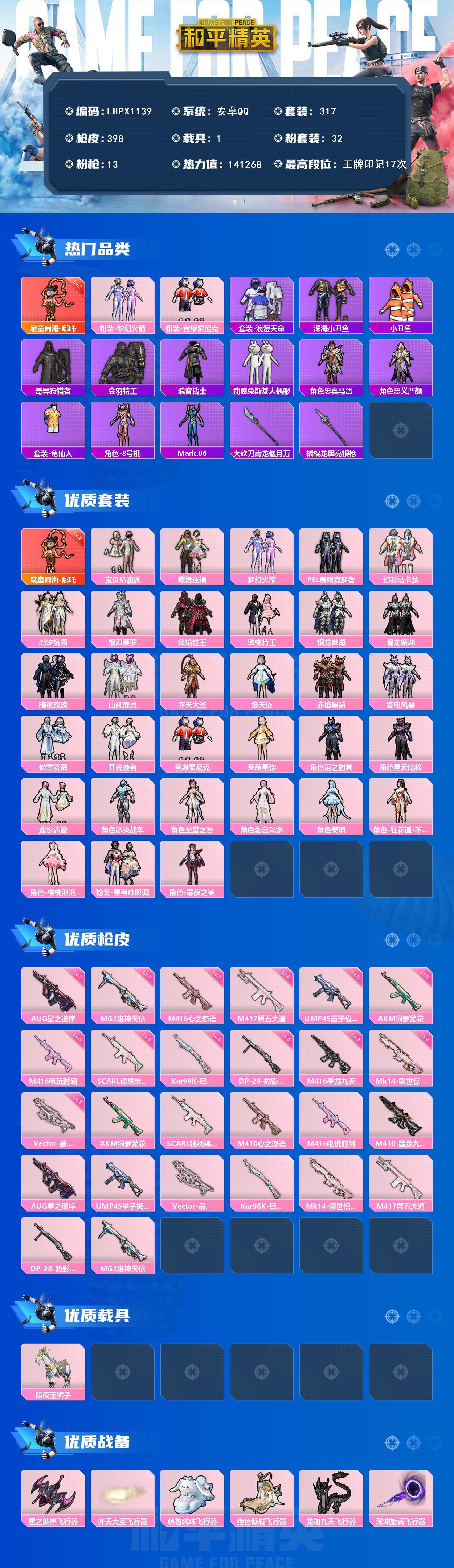 可二次【特价出售/店主推荐】安卓 手Q-1神装-32粉装-13特效枪-1载具-11粉色飞行器-141268热力值-17王牌印记-317套装-398枪皮