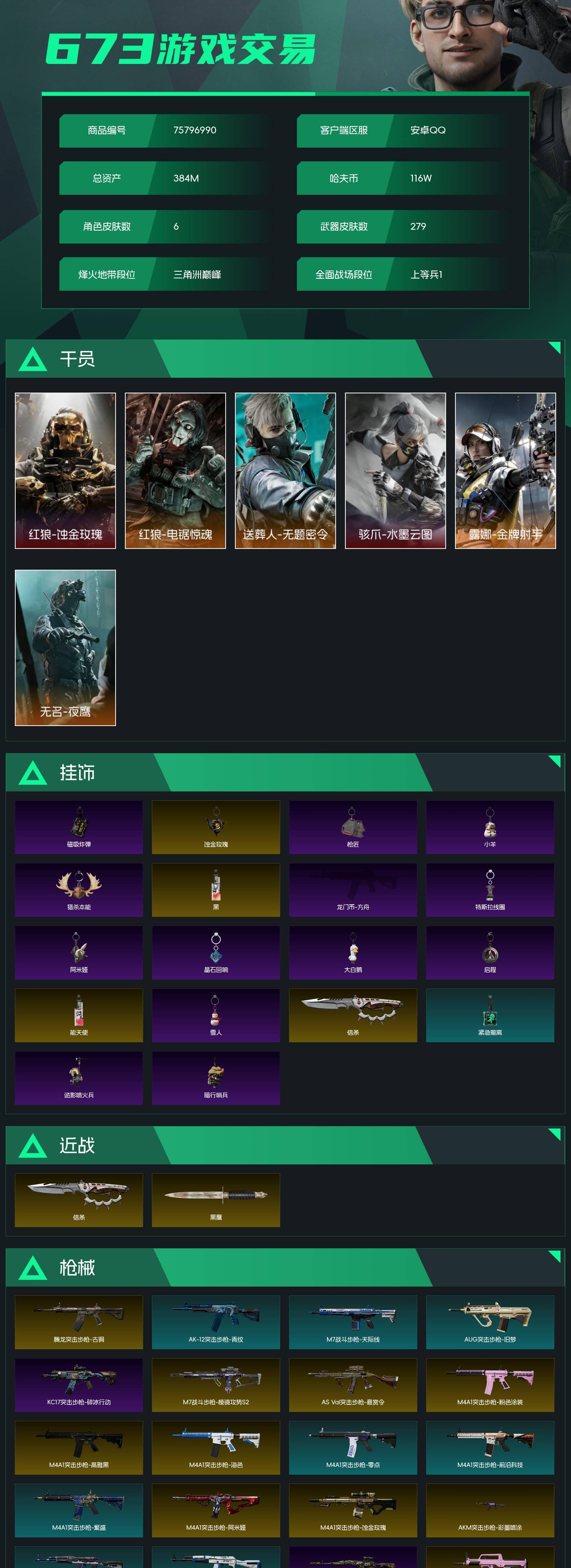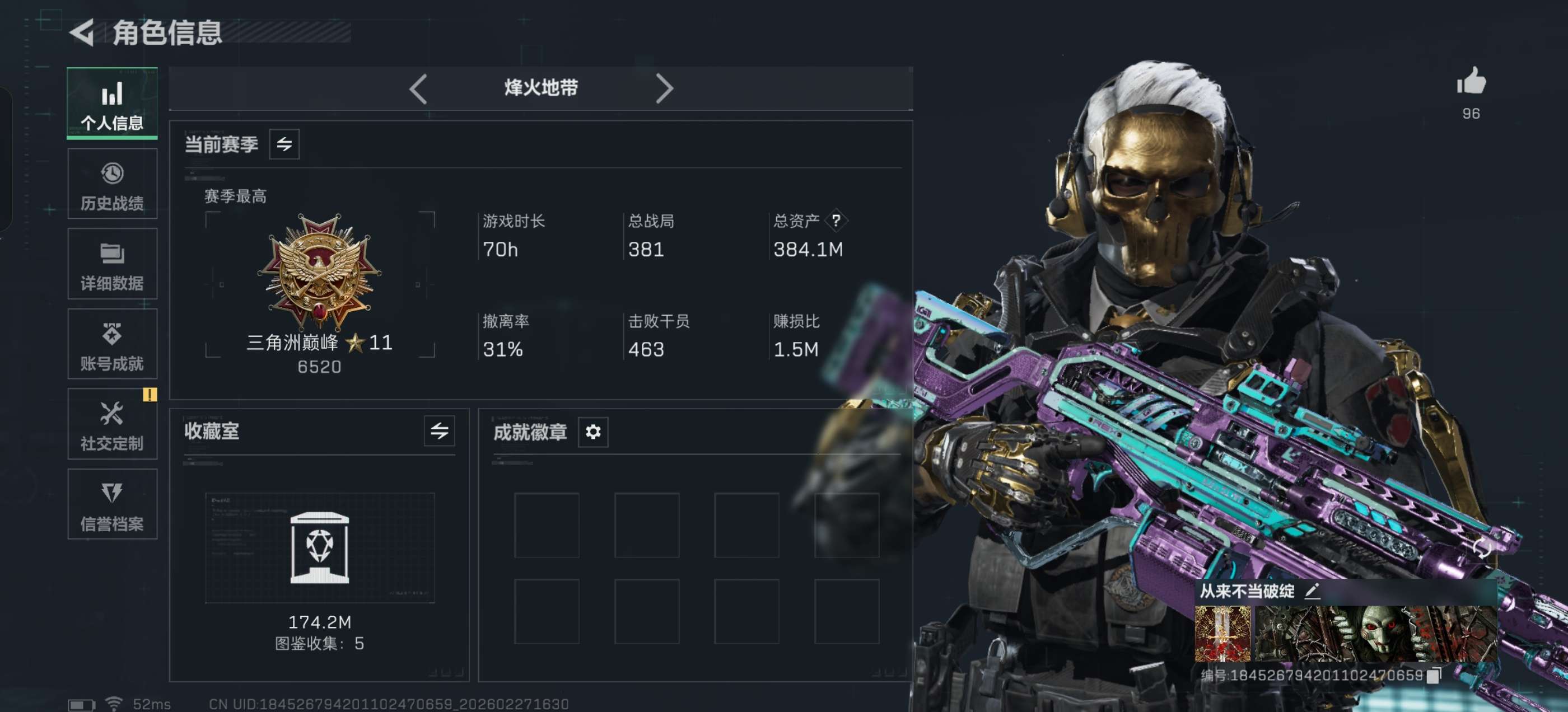 烽火段位三角洲巅峰 战场段位上等兵1 总资产384M 哈夫币116W 干员6 挂饰27 近战3 枪械279 载具61