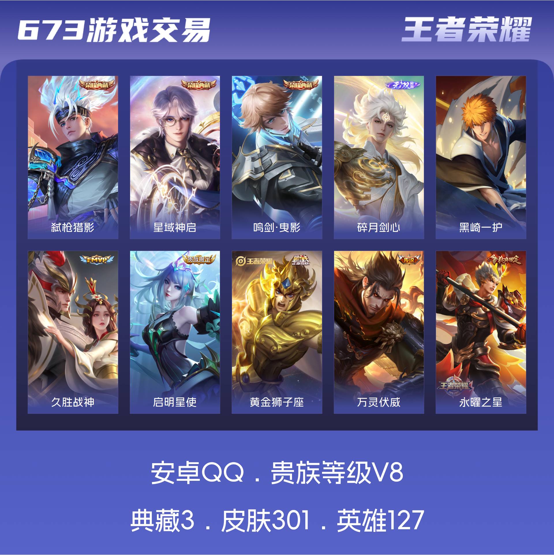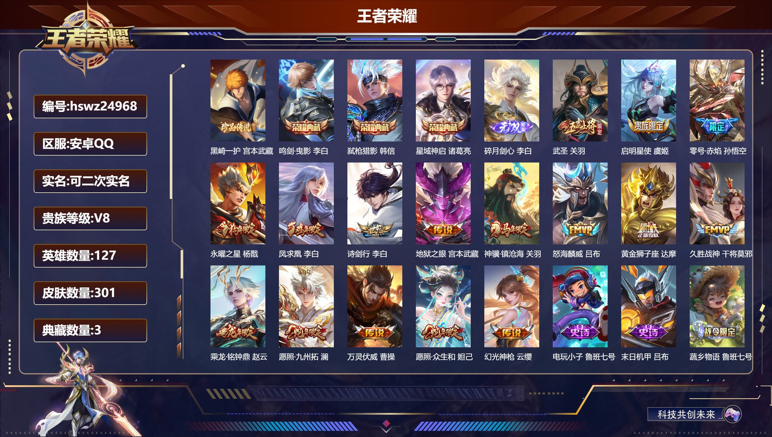 安卓QQ/至尊星耀/301皮肤/127英雄/3典藏/0珍品无双/1无双/1珍品传说/16传说/107
