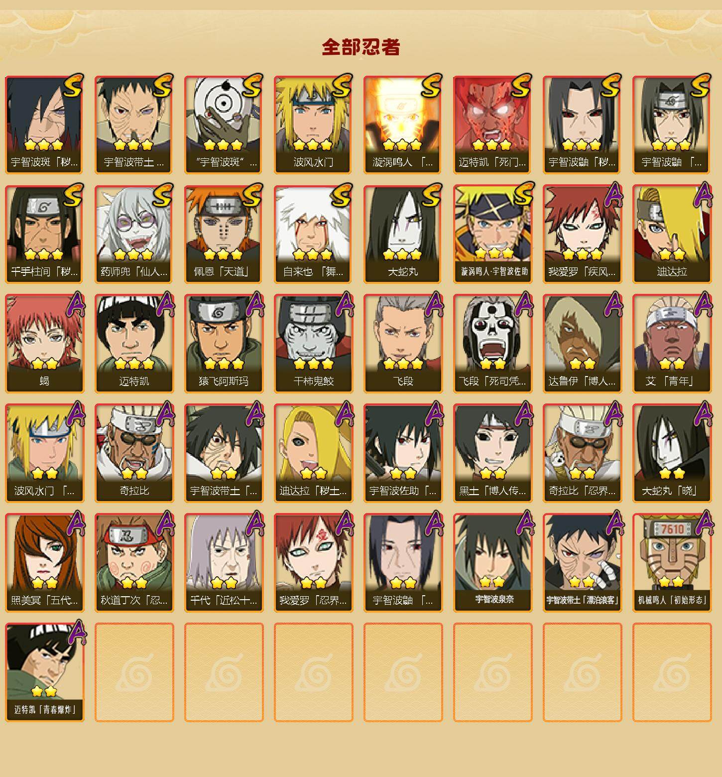 14S级忍者数-27A级忍者数【S级忍者】:千手柱间「秽土转生」(3星),宇智波鼬「秽土转生」(3星),宇智波斑「秽土转生·解」(3星),宇智波带土「忍界大战」(3星),宇智波鼬「须佐能乎」(3星),自来也「舞之豪杰」(3星),大蛇丸(3星),波风水门(3星),药师兜「仙人模式」(3星),漩涡鸣人「九喇嘛连结」(3星),迈特凯「死门」(3星),佩恩「天道」(3星),宇智波斑 「白面具」(3星宇智波斑「白面具」),漩涡鸣人·宇智波佐助(3星)【A级忍者】:艾「青年」(2星),波风水门「青年」(2星