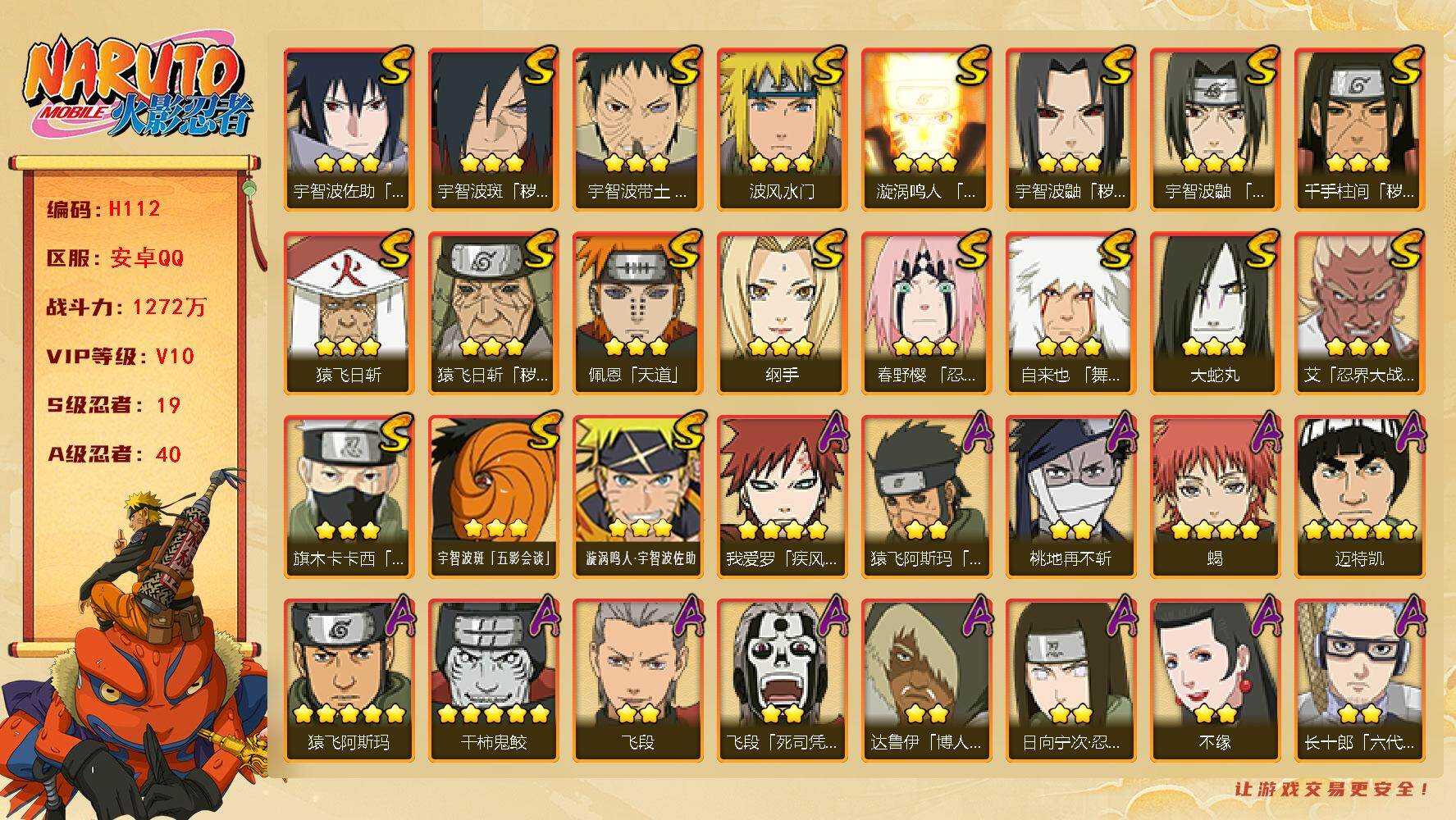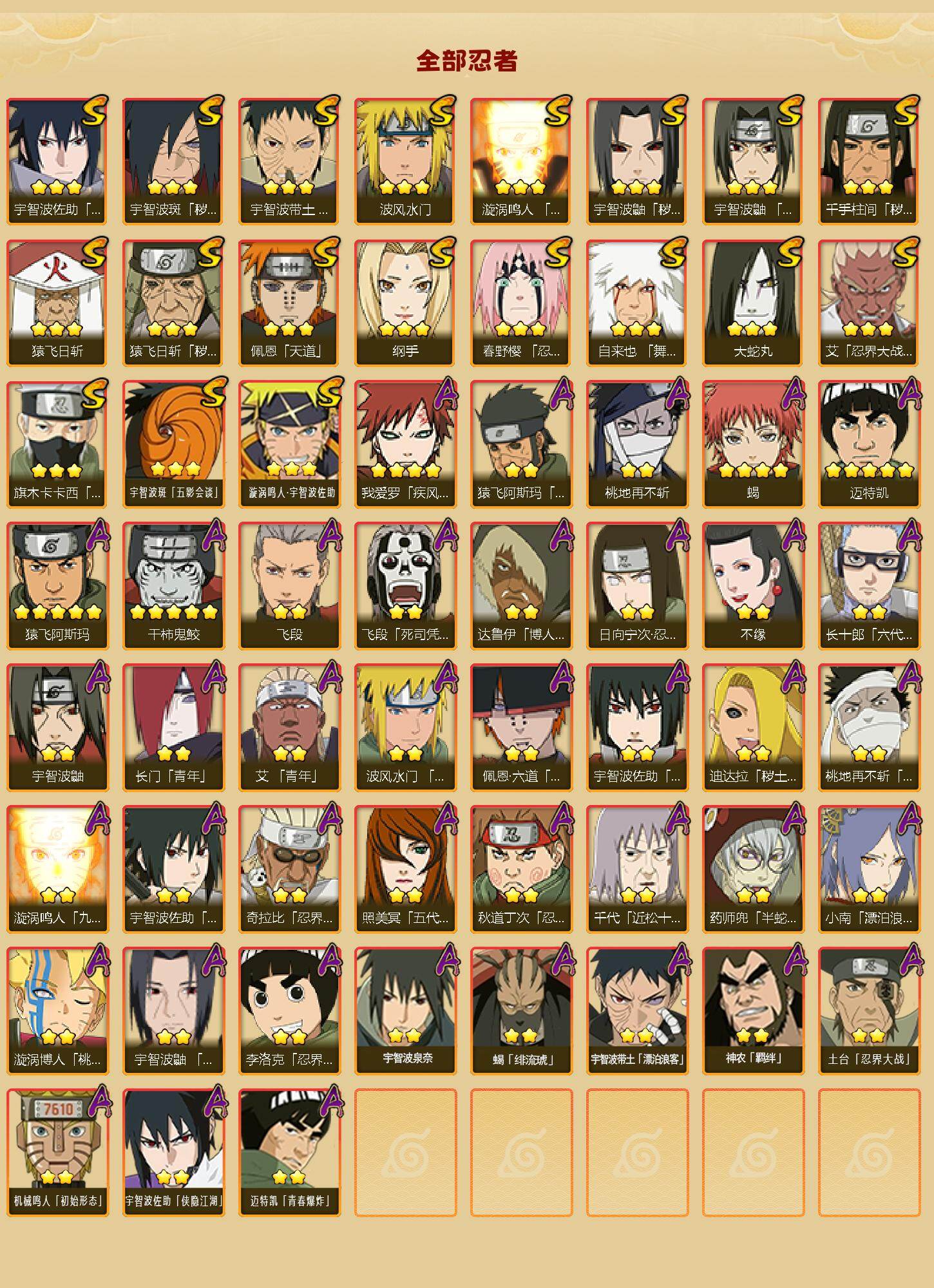 19S级忍者数-40A级忍者数【S级忍者】:猿飞日斩「秽土转生」(3星),千手柱间「秽土转生」(3星),宇智波鼬「秽土转生」(3星),宇智波斑「秽土转生·解」(3星),春野樱「忍界大战」(3星),宇智波带土「忍界大战」(3星),艾「忍界大战」(3星),宇智波鼬「须佐能乎」(3星),旗木卡卡西「须佐能乎」(3星),自来也「舞之豪杰」(3星),大蛇丸(3星),纲手(3星),猿飞日斩(3星),波风水门(3星),漩涡鸣人「九喇嘛连结」(3星),佩恩「天道」(3星),宇智波佐助「永恒万花筒」(3星),宇智