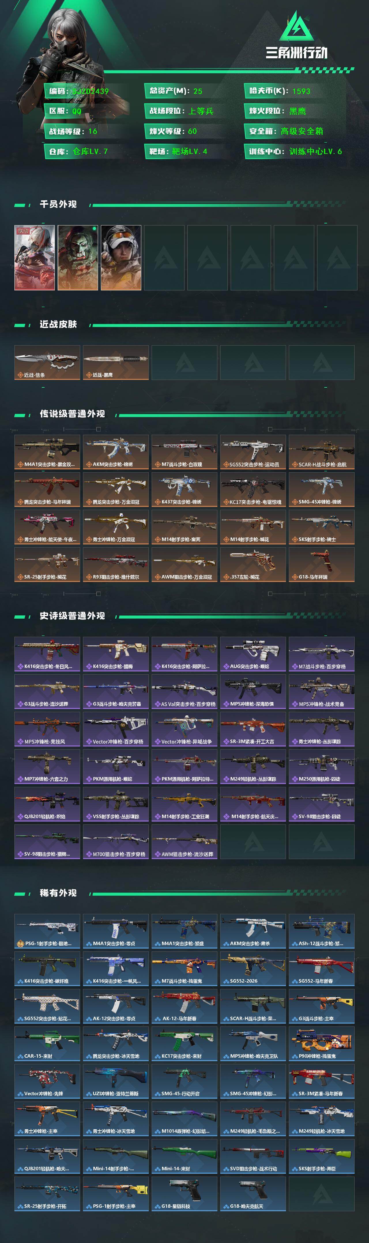 总资产(M):25M/哈夫币(K):1593K/传说枪皮数:20/全面战场等级:16_段位:上等兵/烽火地带等级:60_段位:黑鹰/