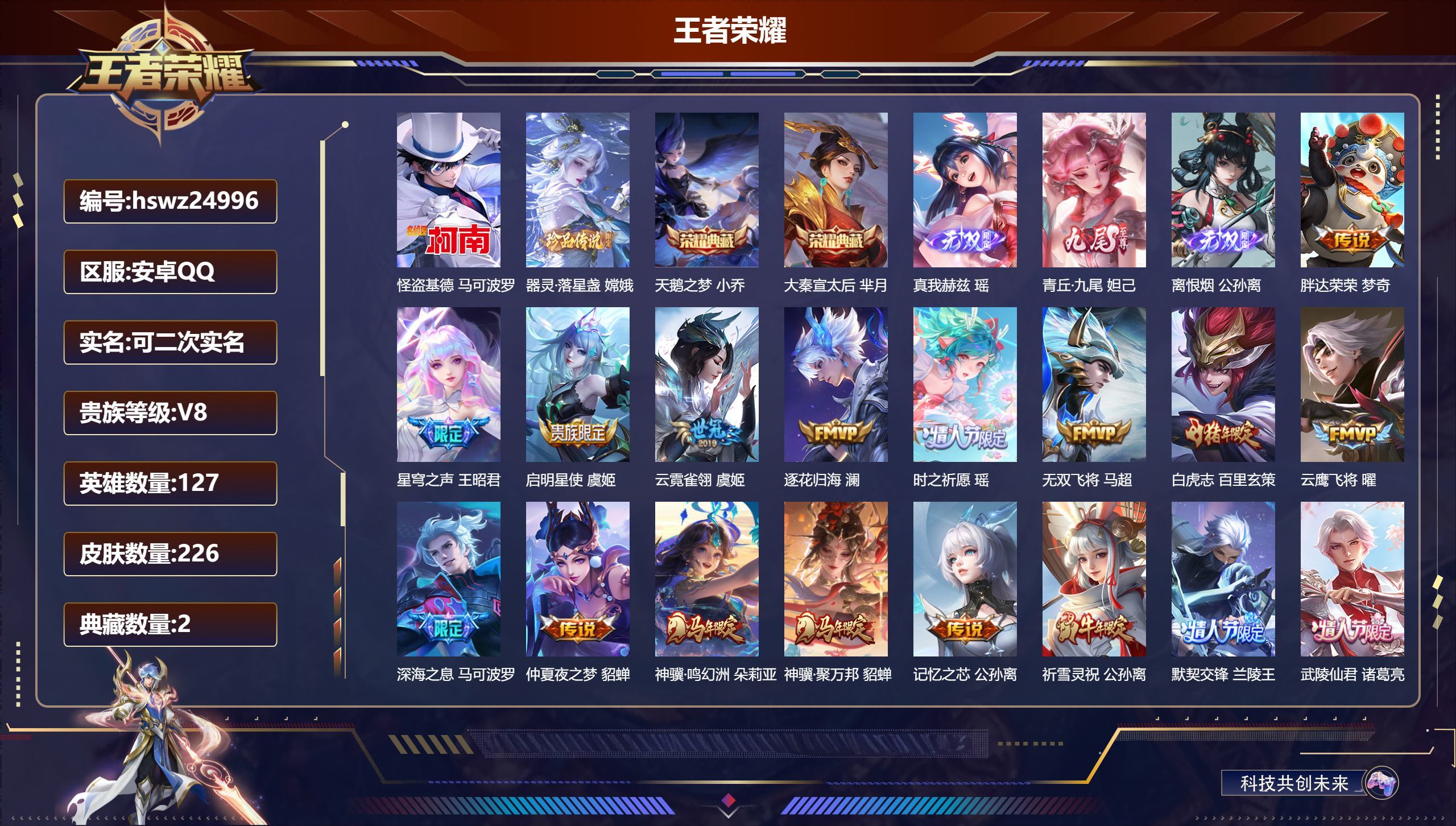 安卓QQ/非凡王者/226皮肤/127英雄/2典藏/0珍品无双/3无双/2珍品传说/28传说/77史