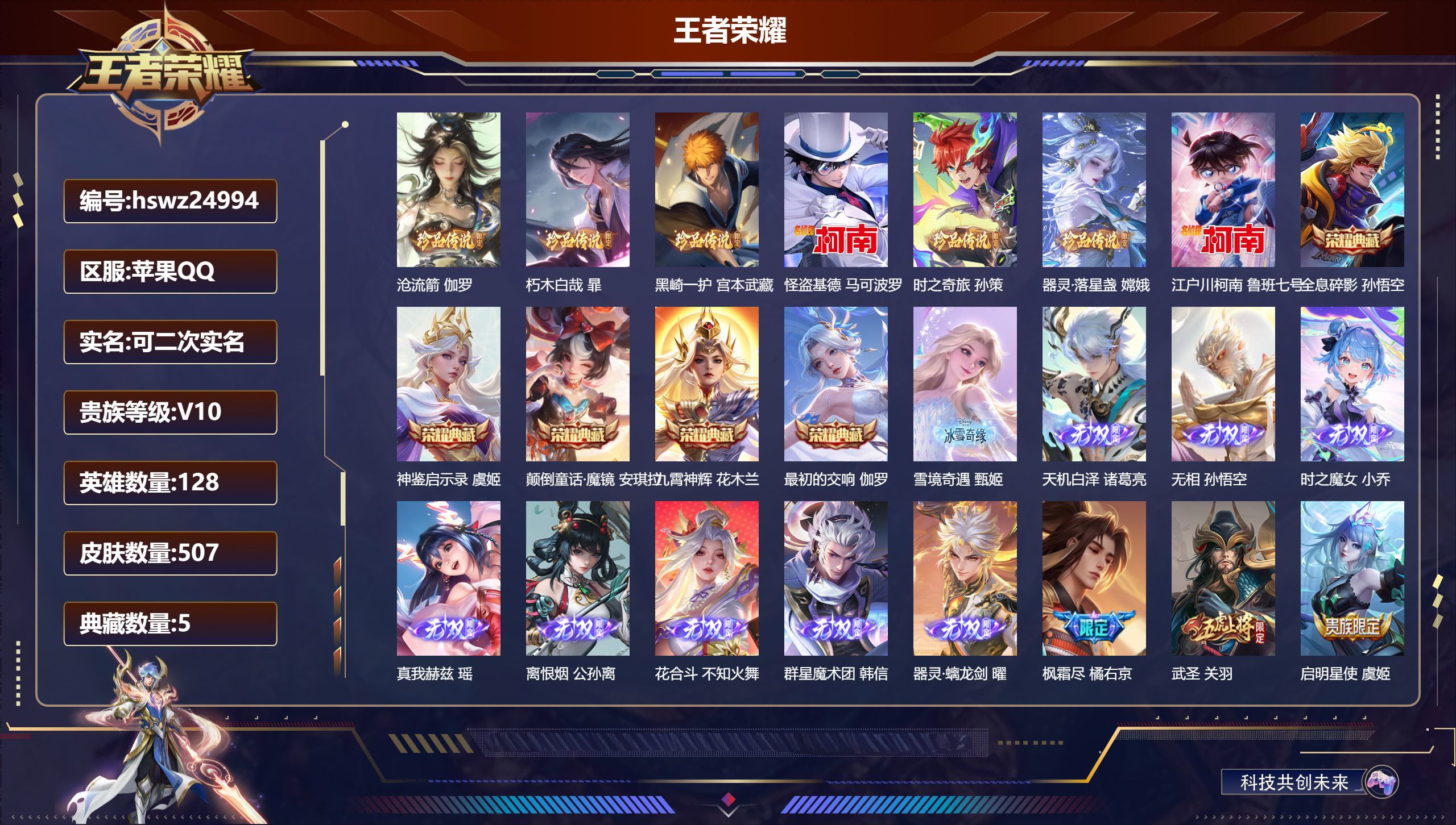 苹果QQ/最强王者/507皮肤/128英雄/5典藏/0珍品无双/9无双/7珍品传说/74传说/142