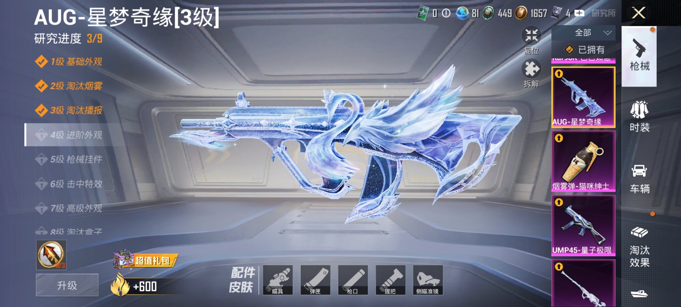 4级红装AUG星梦奇缘小丑女紫螳螂金鞋都市猎人16特效枪11粉装1载具素材号