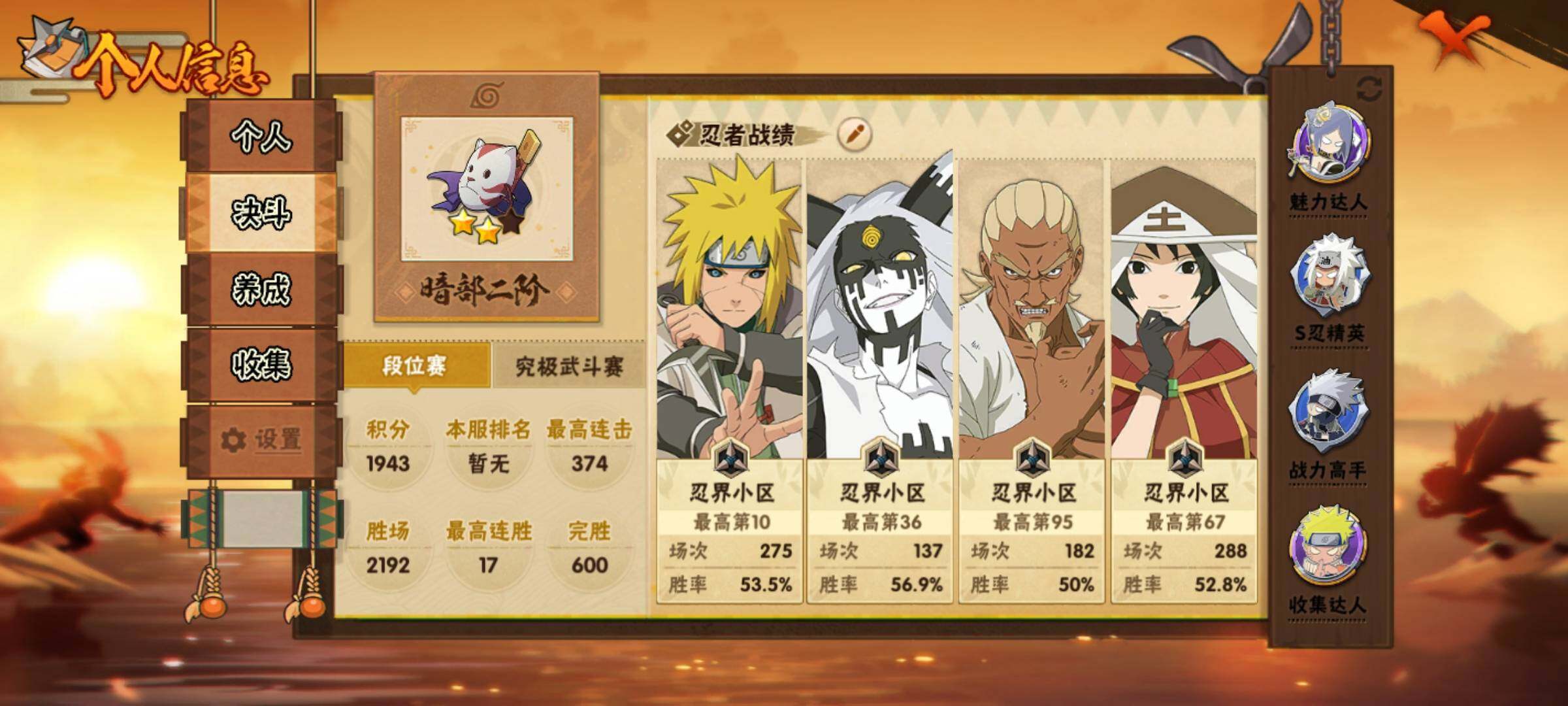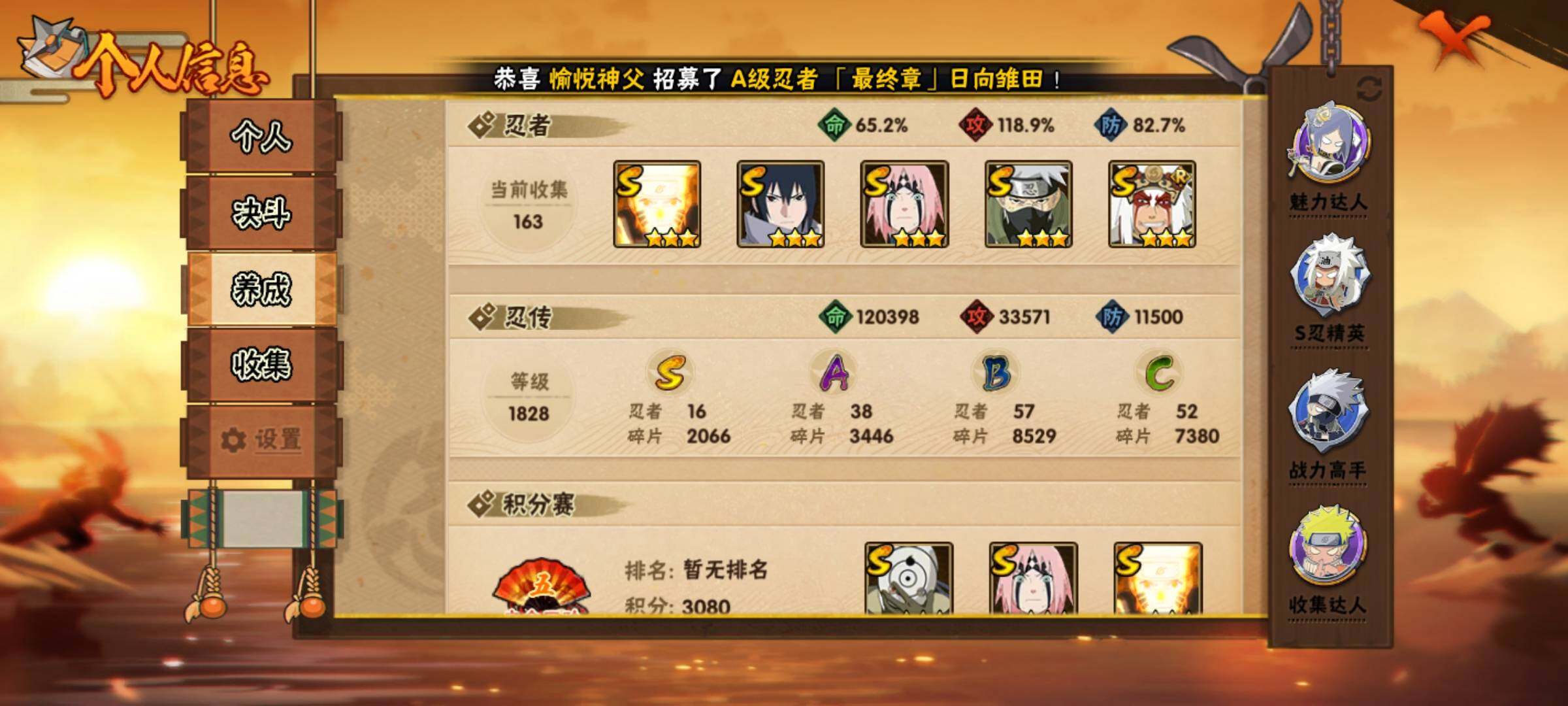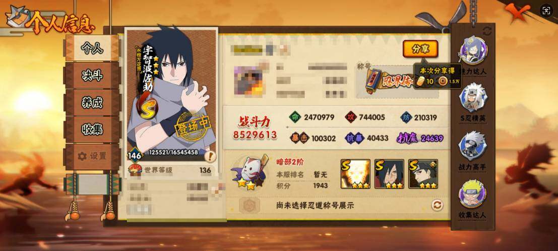 V10/战力852W/S忍16/A忍38/2星大野木「侠隐江湖