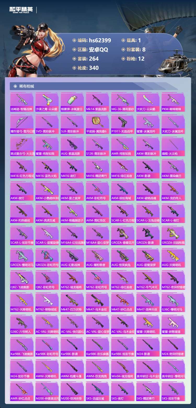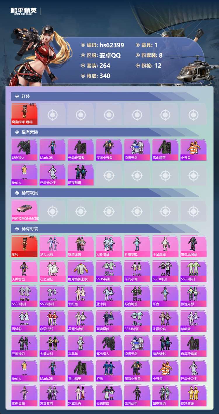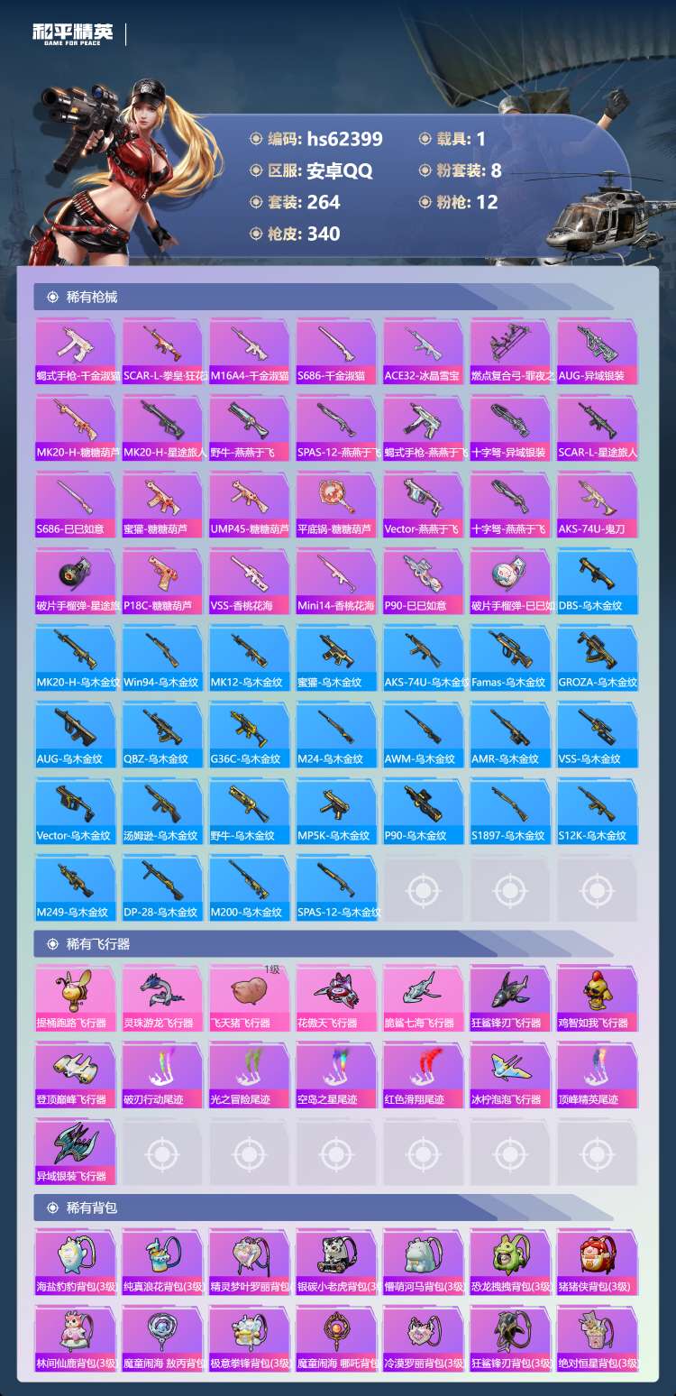 hs62399 安卓手Q-22王牌印记-有战神框-1红装-8粉装-12特效枪-1载具-114608热