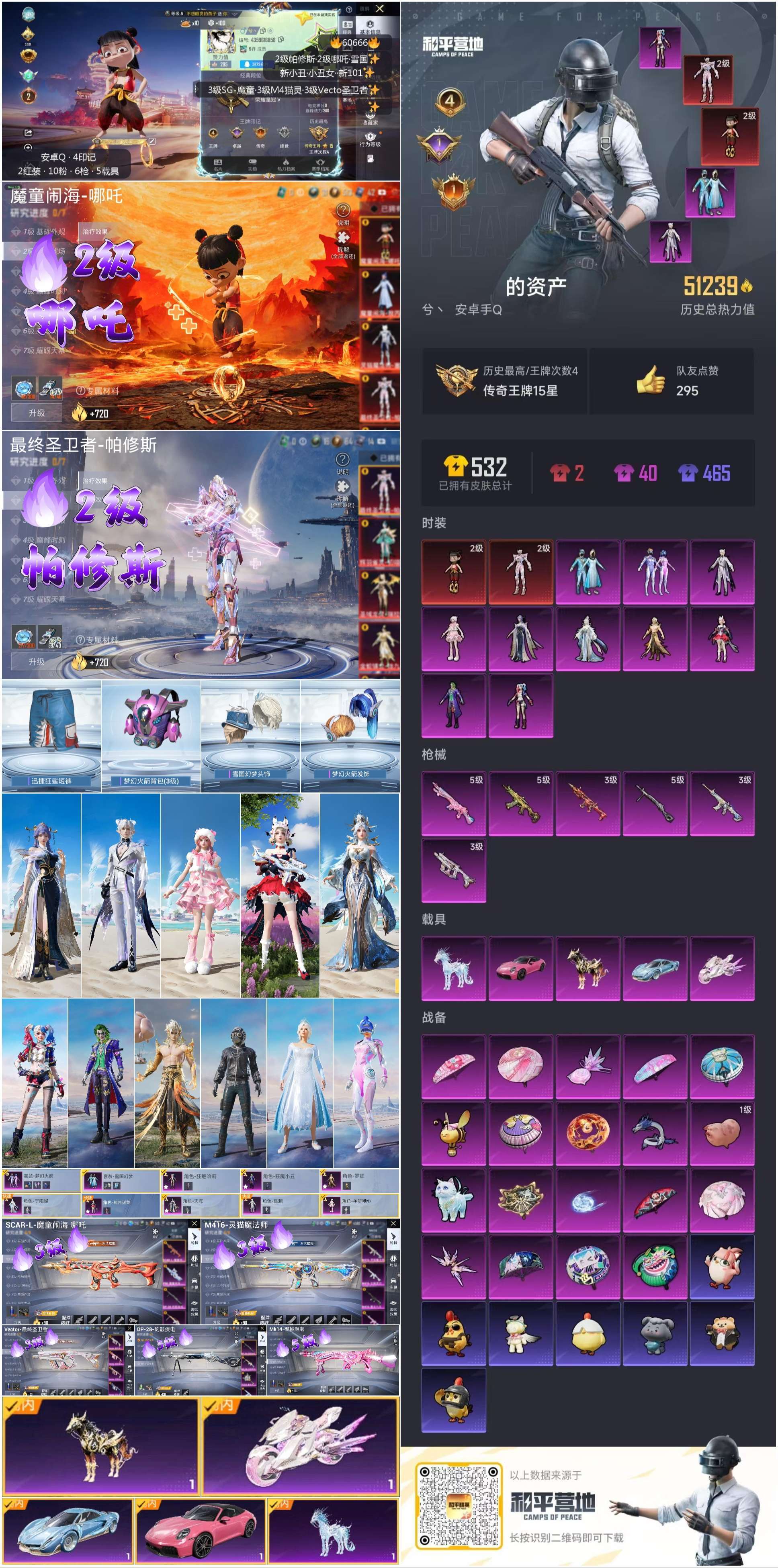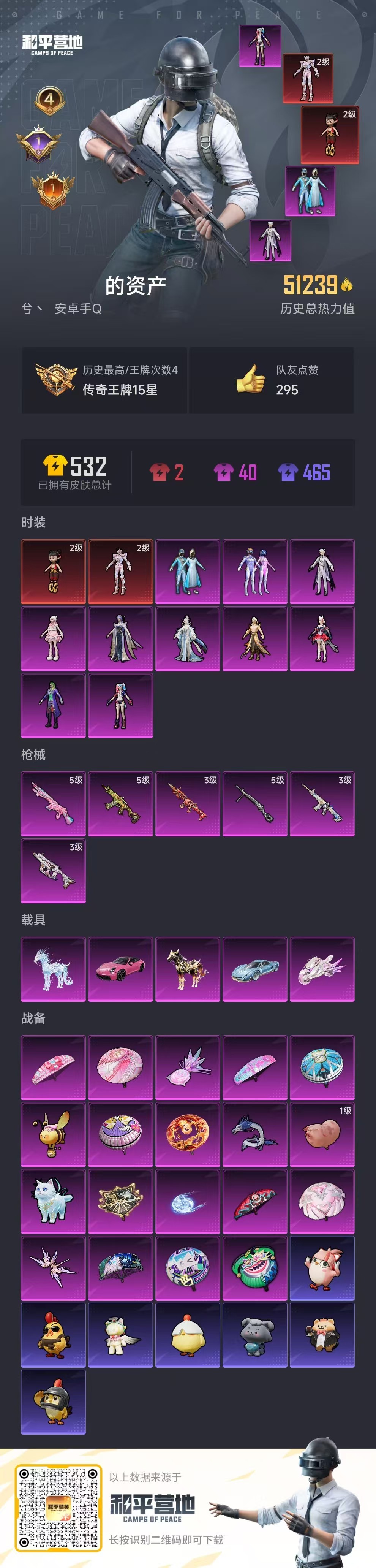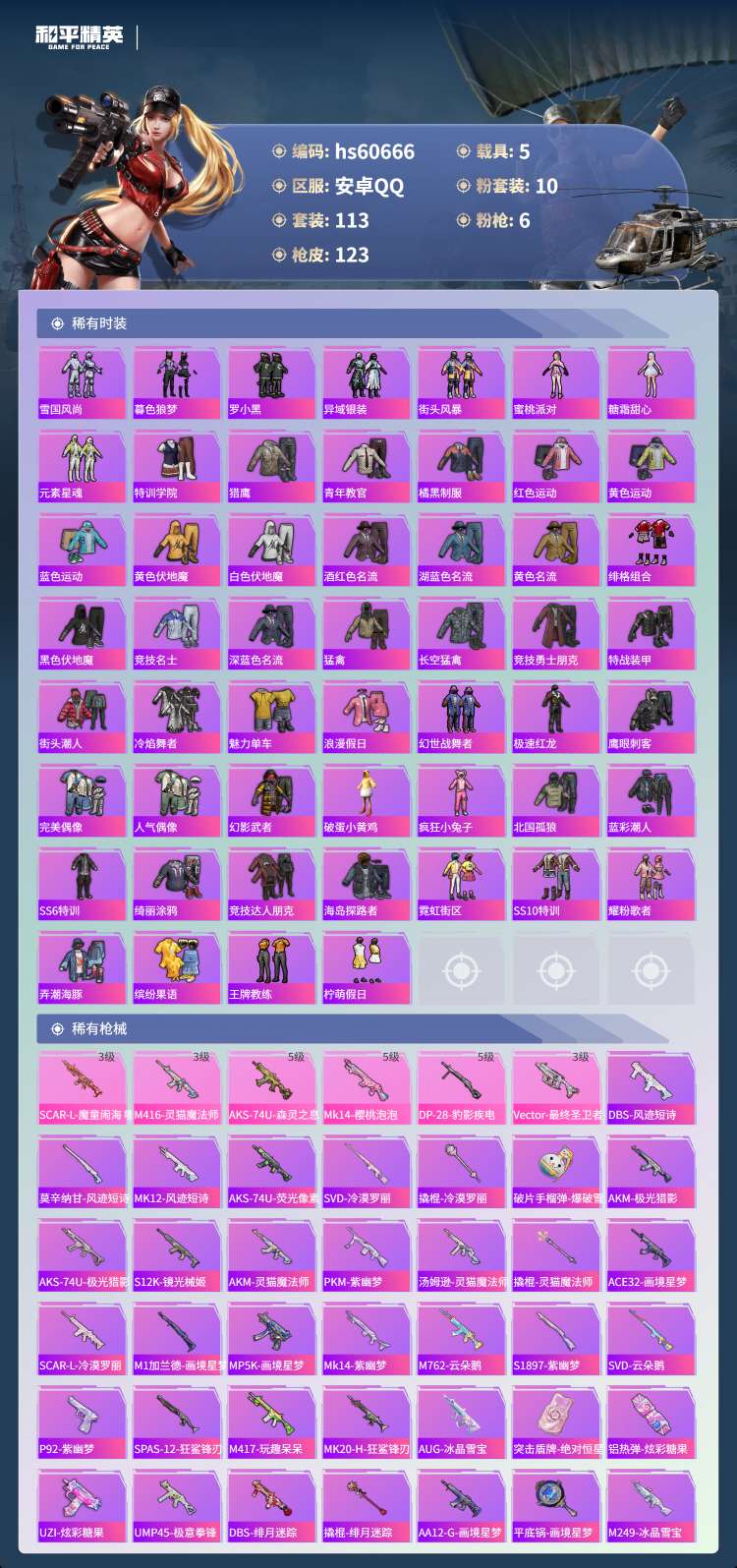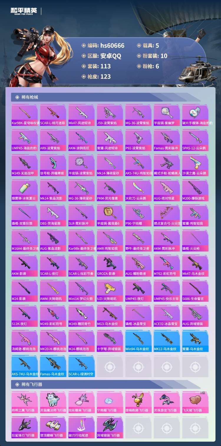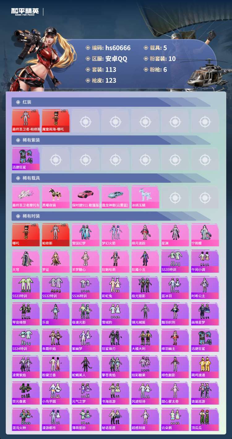 hs60666 安卓手Q-4王牌印记-2红装-10粉装-6特效枪-5载具-51379热力值-113套