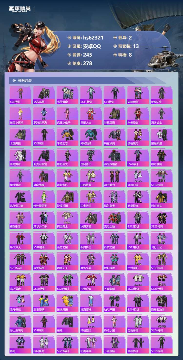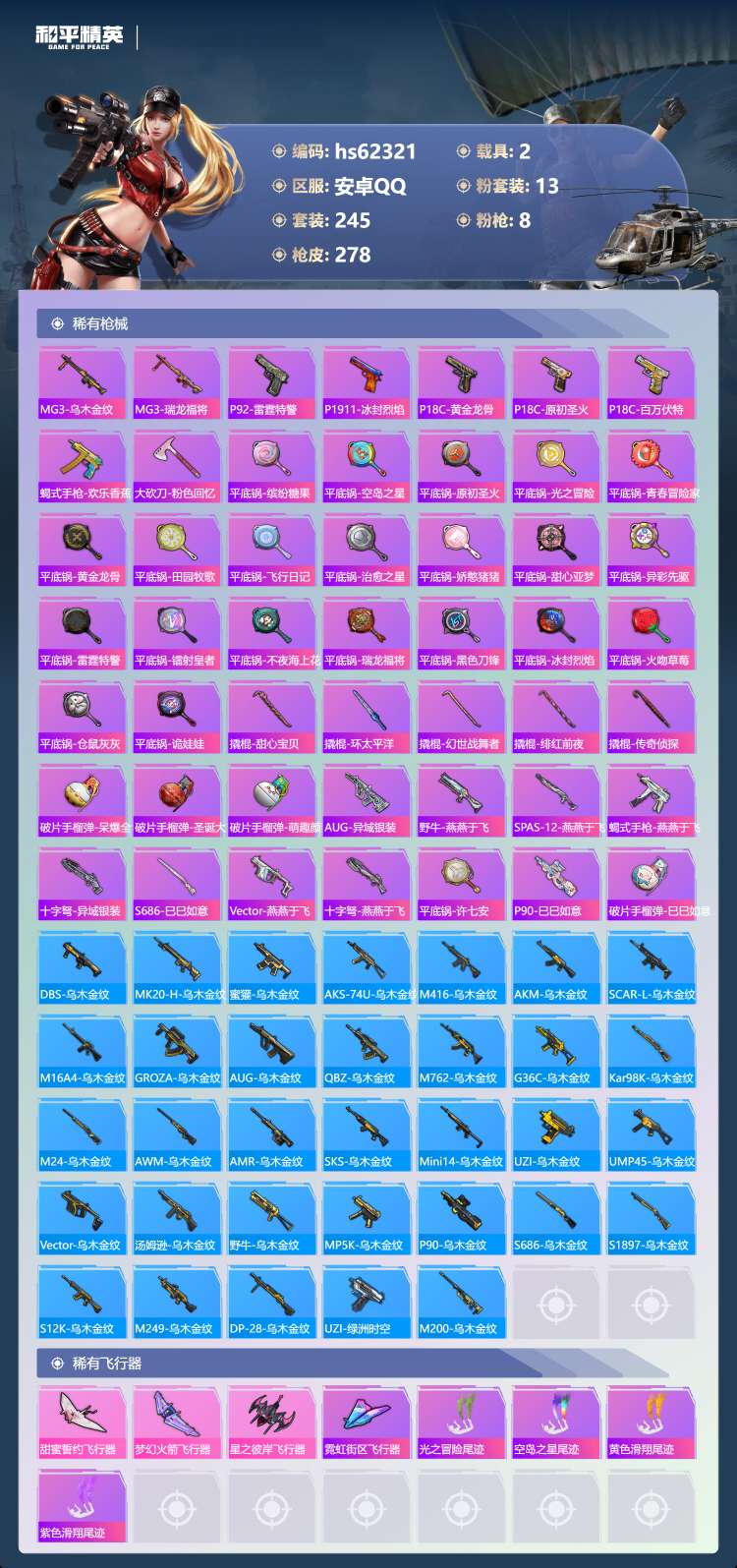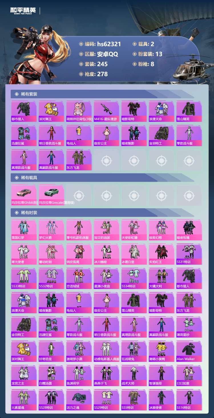 hs62321 安卓手Q-22王牌印记-有战神框-13粉装-8特效枪-2载具-87789热力值-24