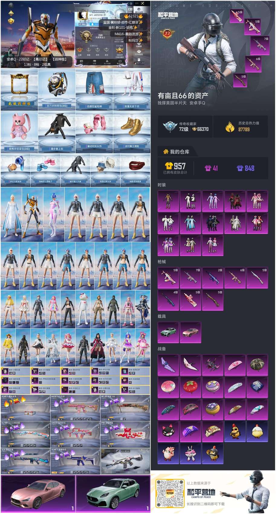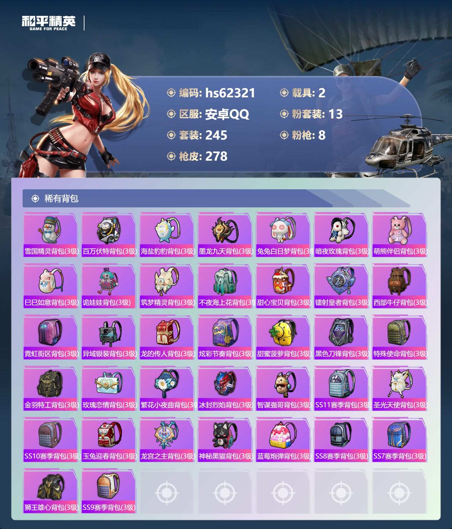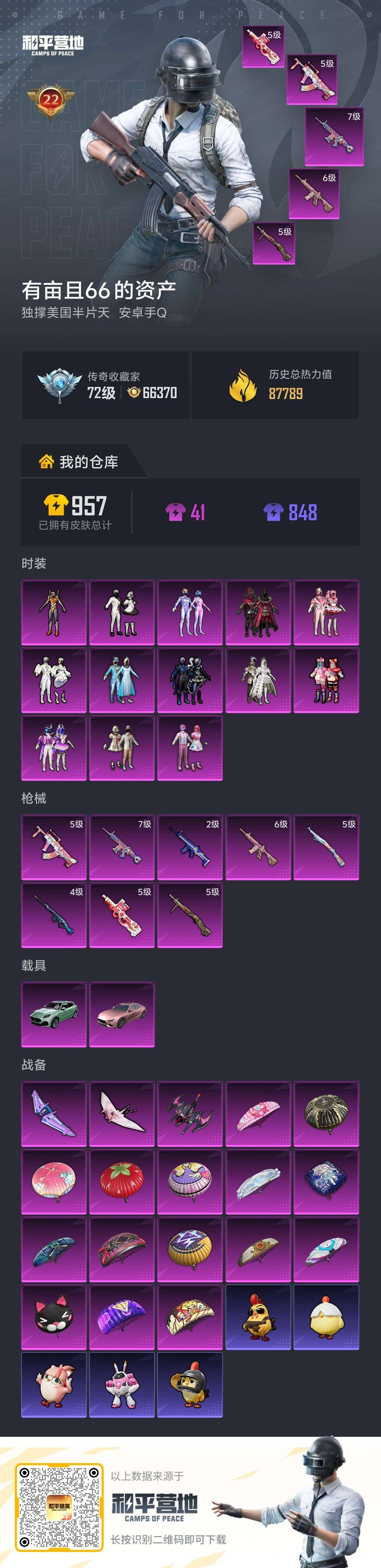 hs62321 安卓手Q-22王牌印记-有战神框-13粉装-8特效枪-2载具-87789热力值-24