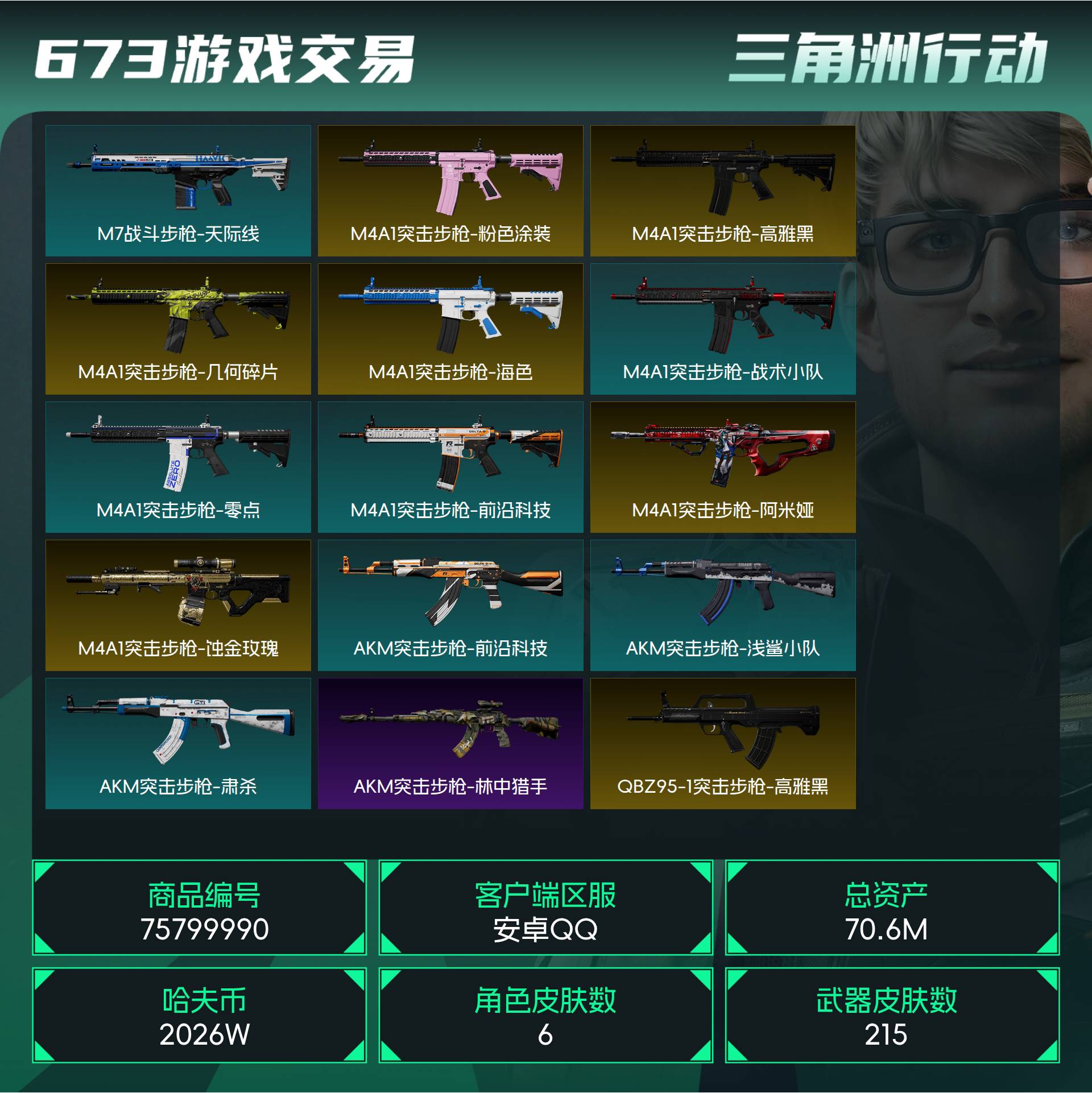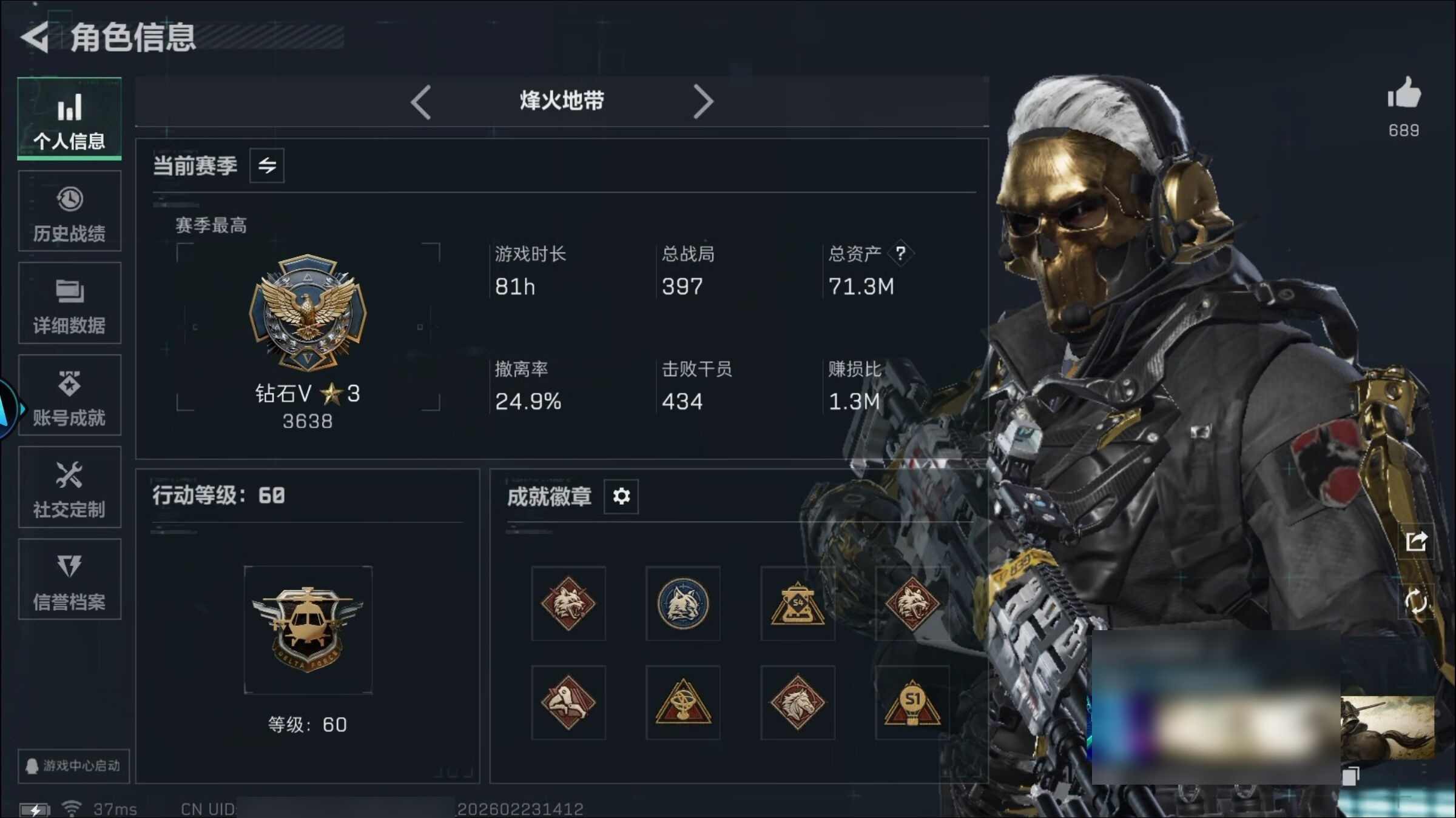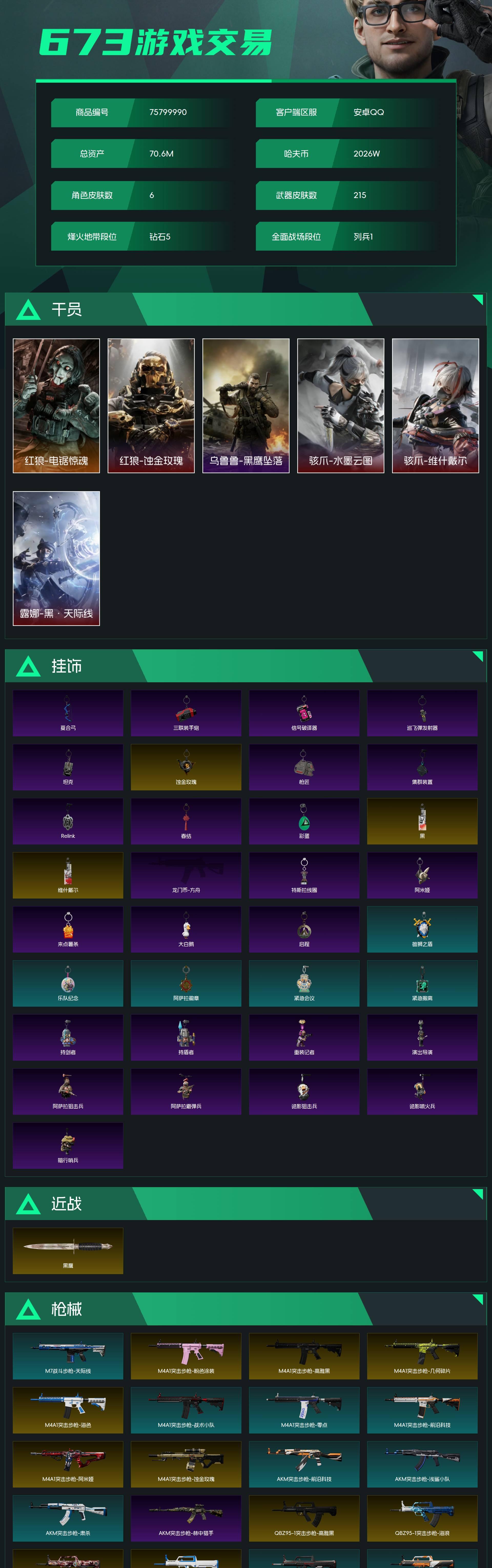 烽火段位钻石5 战场段位列兵1 总资产70.6M 哈夫币2026W 干员6 挂饰39 近战1 枪械215 载具25