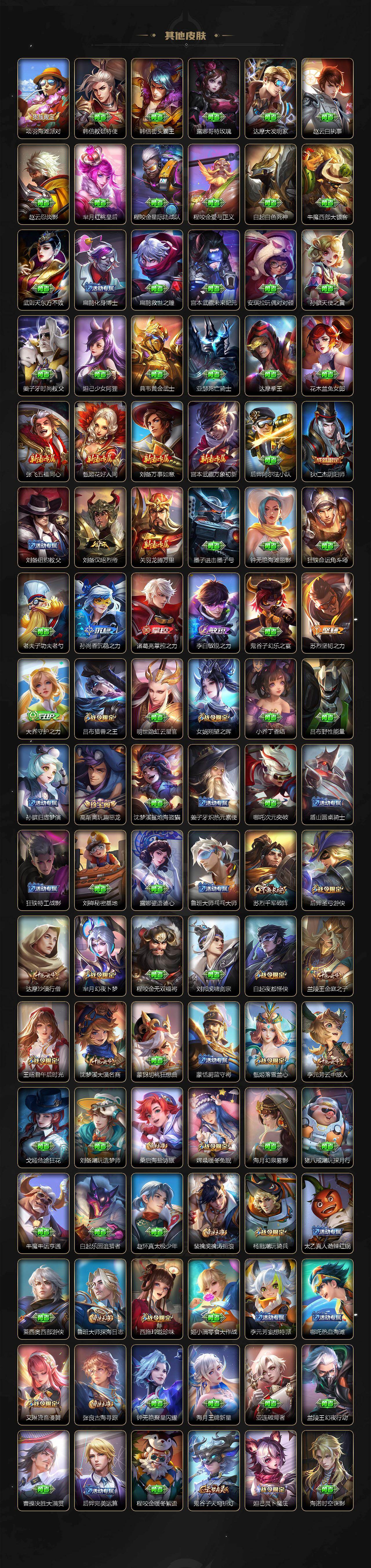 【传说皮肤】:桑启鸣野蒿,夏侯惇霜北刀,孙策乘龙淬吴钩,澜逐花归海,狄仁杰夜礼服假面,上官婉儿妄想奇谈,马可波罗妄想实况,东皇太一灼幽烈阳,诸葛亮鹤羽星尊,澜电玩雷克斯,伽罗炽翼辉光,孙悟空齐天大圣,小乔山海琳琅生,曜山海苍雷引,李信山海炽霜斩,吕