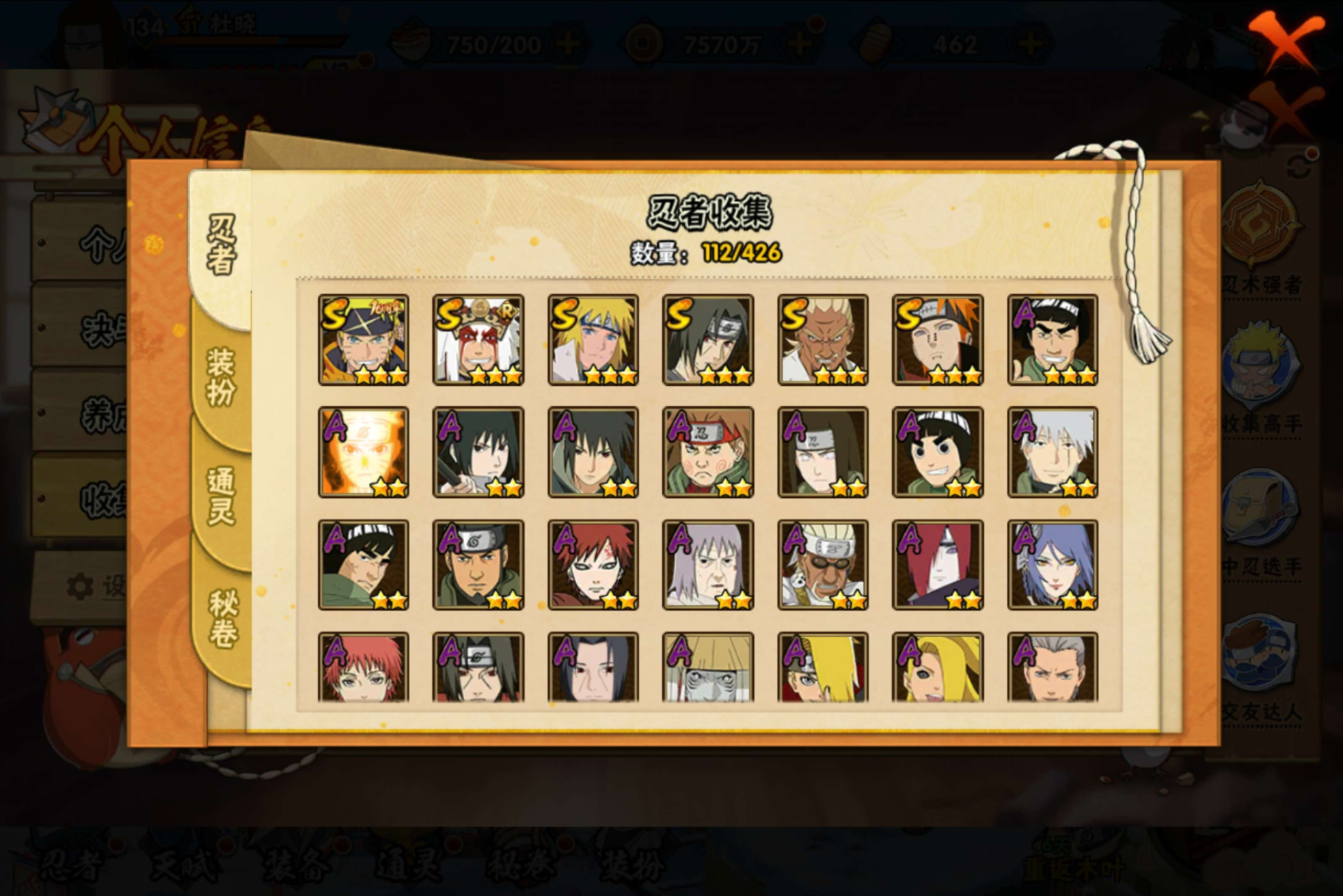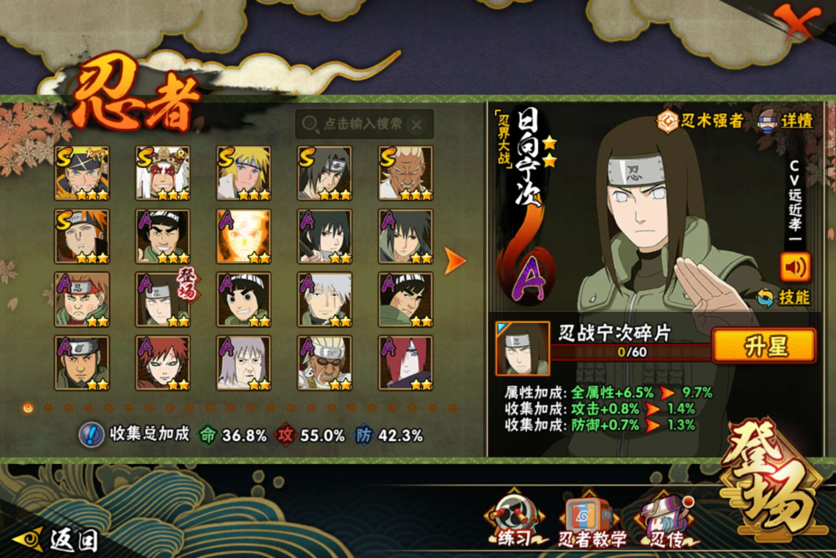 【S级忍者】艾「忍界大战」(3星),自来也「舞之豪杰」(3星),宇智波鼬「须佐能乎」(3星),漩涡鸣人·宇智波佐助(3星),佩恩「天道」(3星),波风水门(3星),