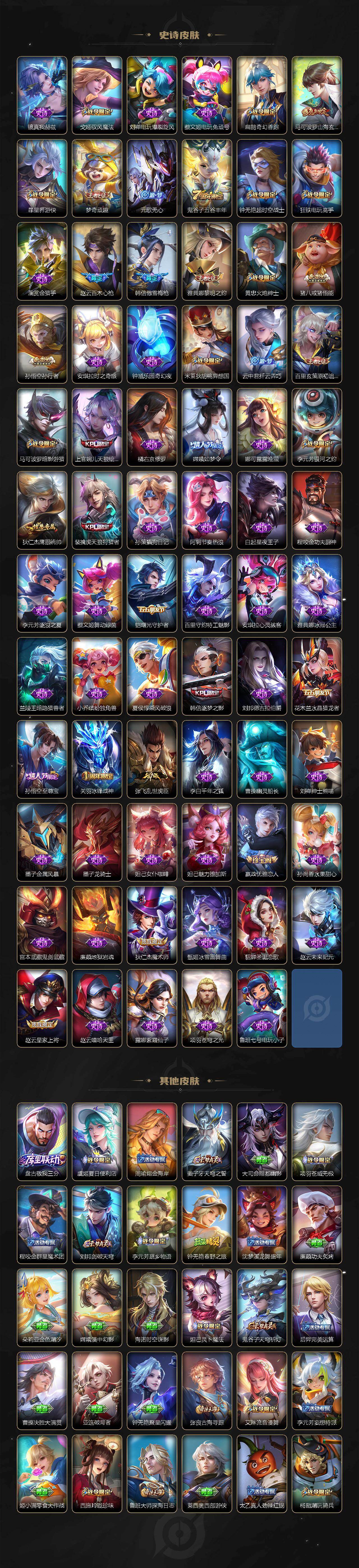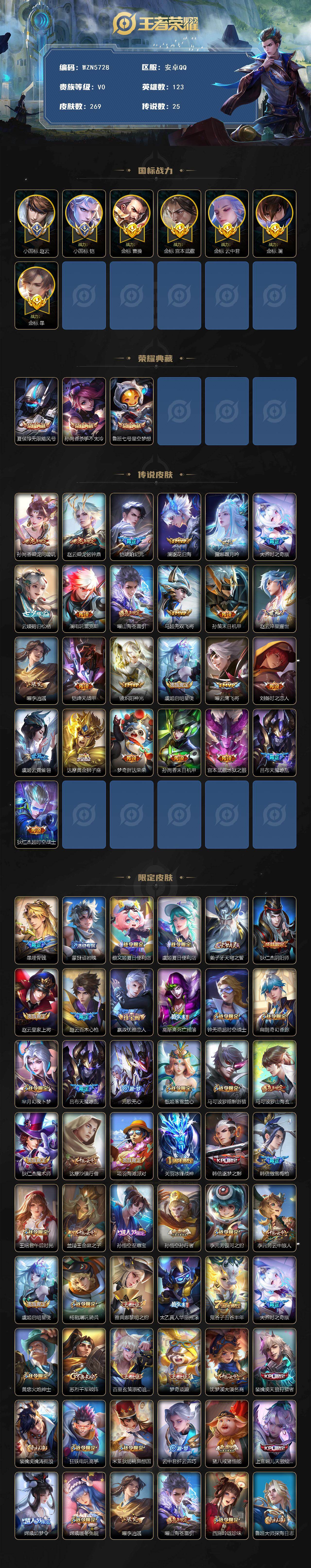 【WZN5728】贵族0/皮肤269/典藏3/传说25/史诗88/英雄123/小国标赵云/小国标铠/金标暃/金标澜/金标云中君/金标曹操/金标宫本武藏/夏侯惇-无限飓风号/孙尚香-杀手不太冷/鲁班七号-星空梦想/孙尚香-乘龙·问璇玑/赵云-乘龙·铭钟鼎/铠-琥珀纪元/澜-逐花归海/露娜-霜月吟/大乔-时之奇旅/云缨-鹤归松栖/澜-电玩·雷克斯/曜-山海·苍雷引/马超-无双飞将/孙策-末日机甲/赵云-淬星耀世/曜-李逍遥/铠-绛天战甲/镜-炽阳神光/虞姬-启明星使/曜-云鹰飞将/刘备-时之恋人/虞