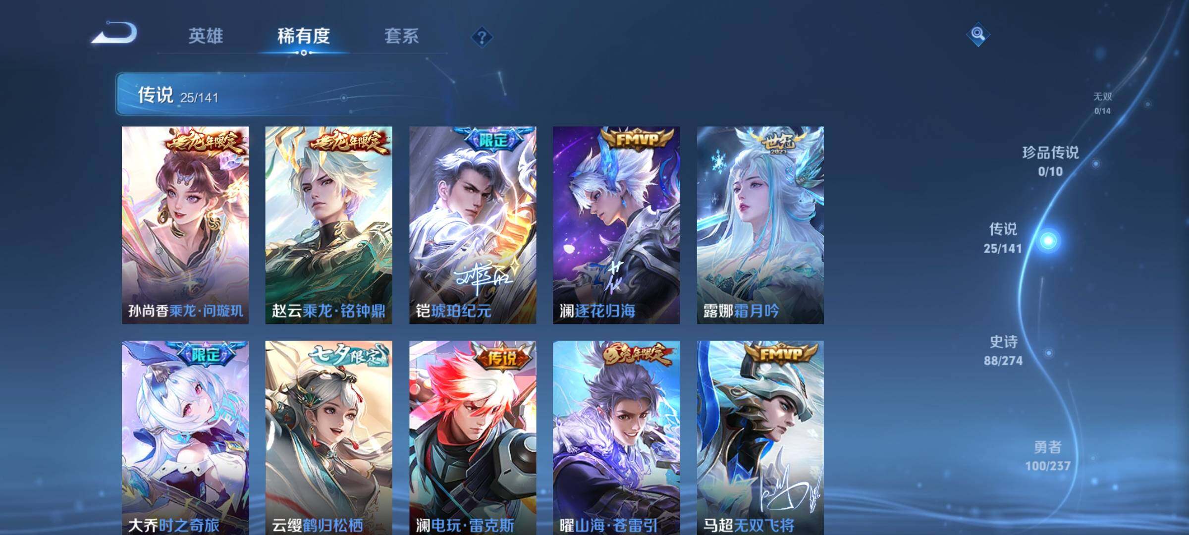 贵族0/皮肤269/典藏3/传说25/史诗88/英雄123/小